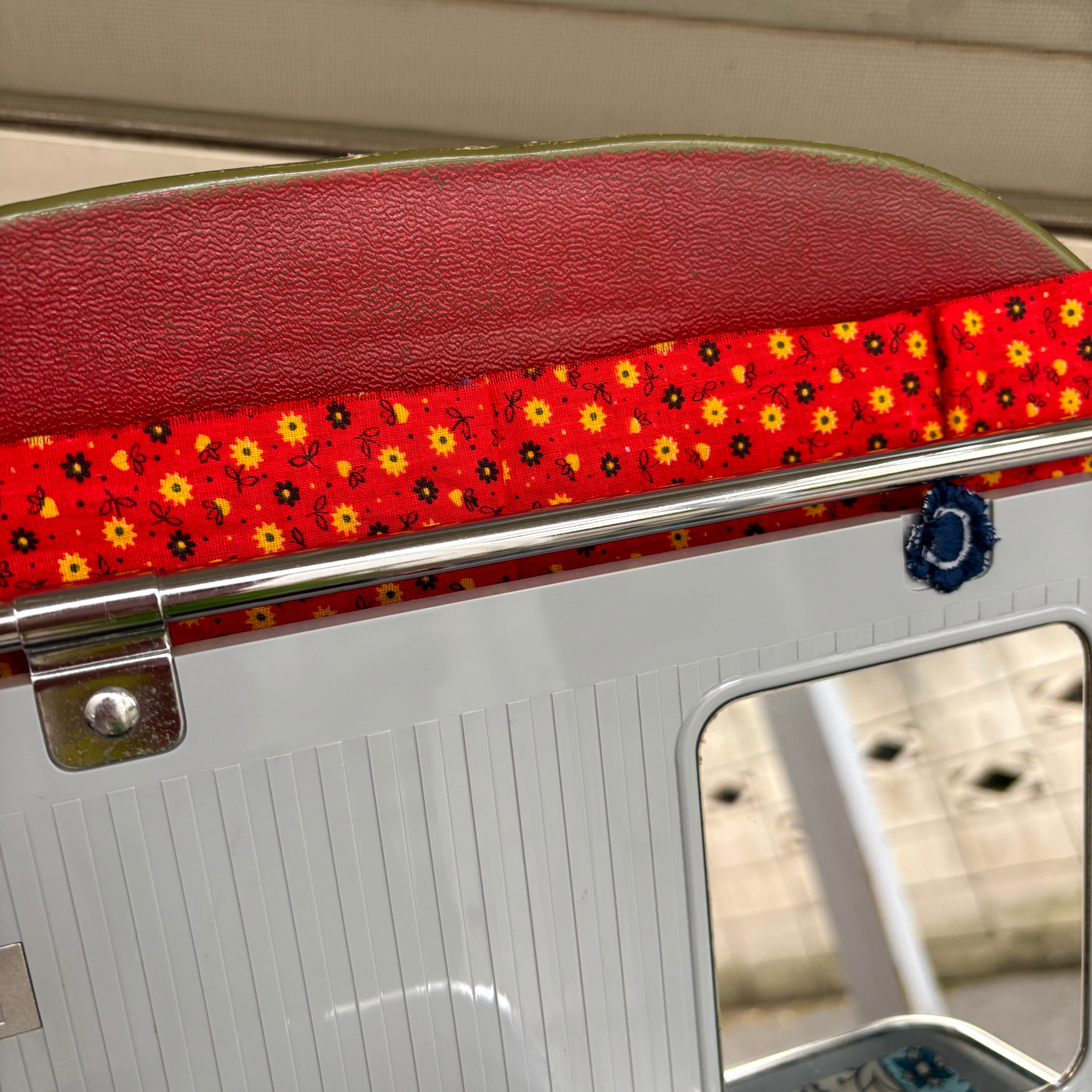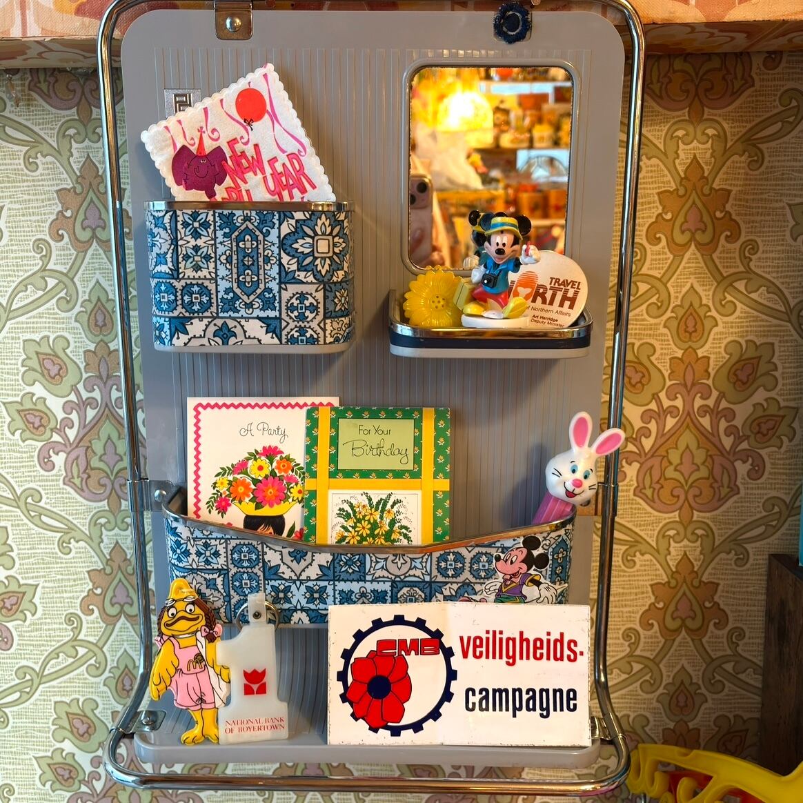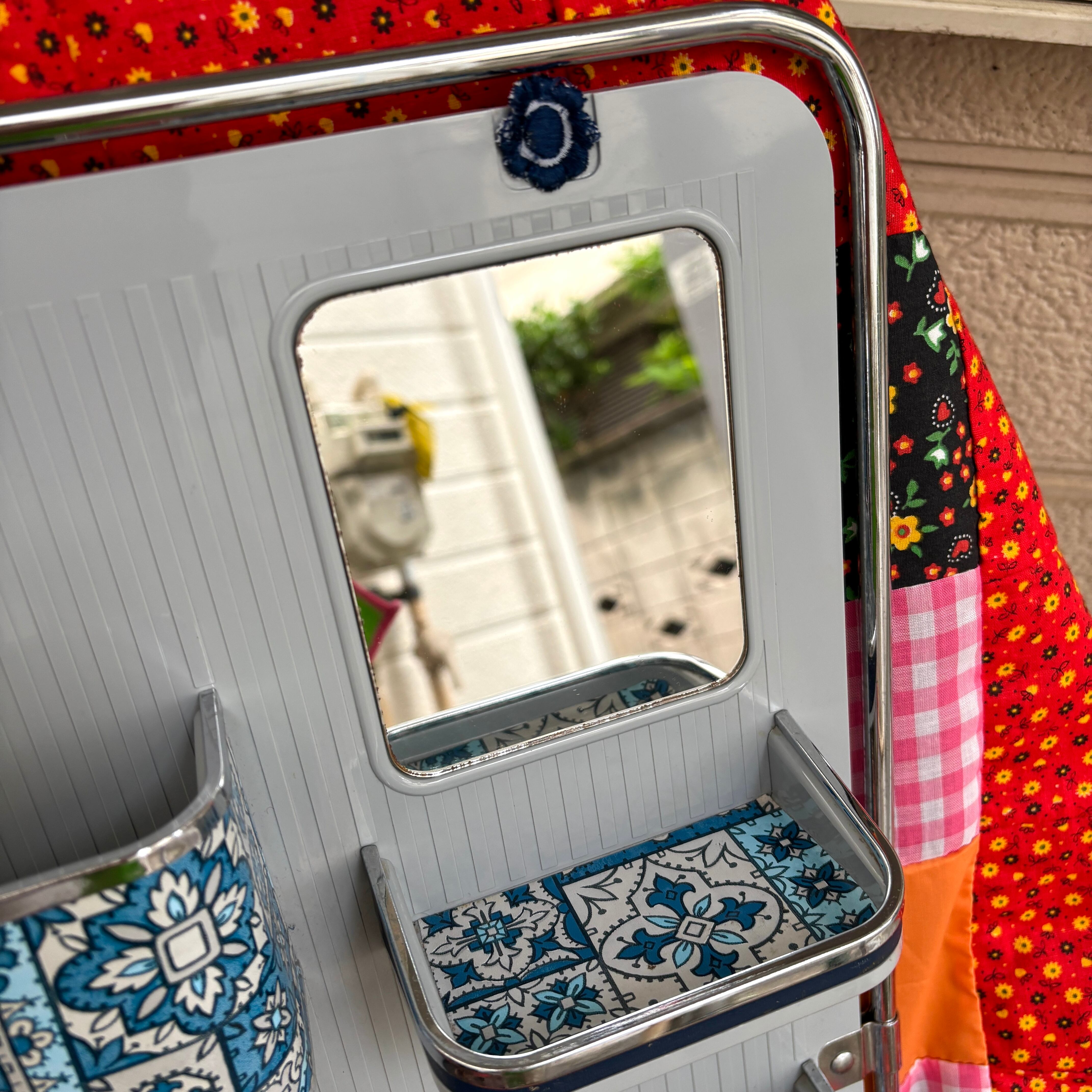 ごくライトなブルーに立体感のあるラインが入っているベースにシルバーのフレーム、角が丸みのあるミラーやヴィンテージのシールシートがカスタマイズされたポケットやトレーがとっても可愛いアイテムです。