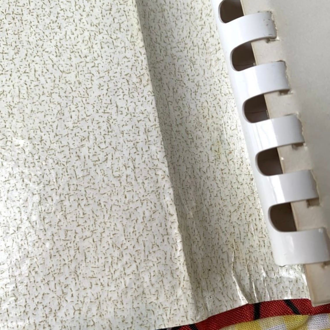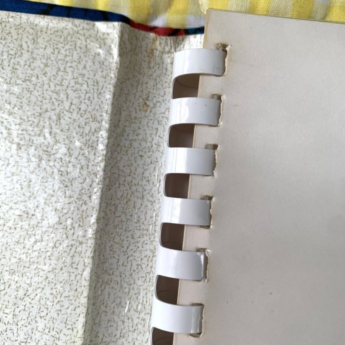 内側の台紙の端に若干のシワ、表側の生地に若干の色移りのようなシミが見られますが柄に紛れて、あまり目立たないかと思います。
