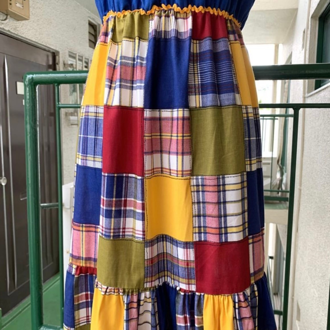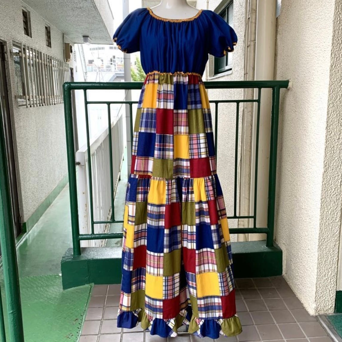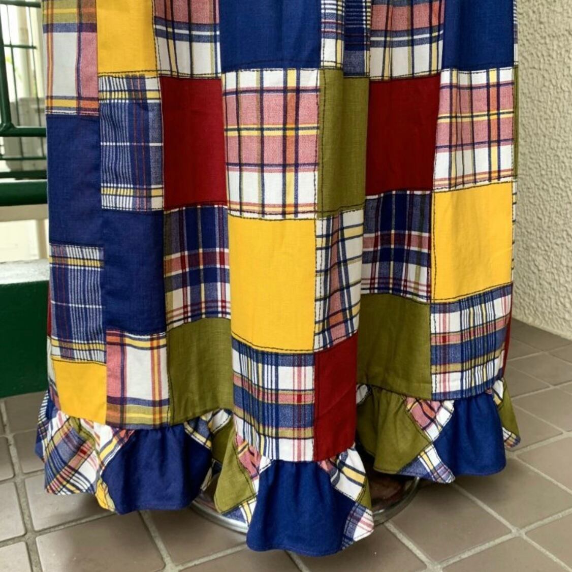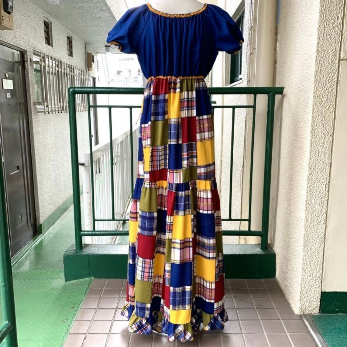70'S USA Vintage Sears plaid patchwork pattern long dress。