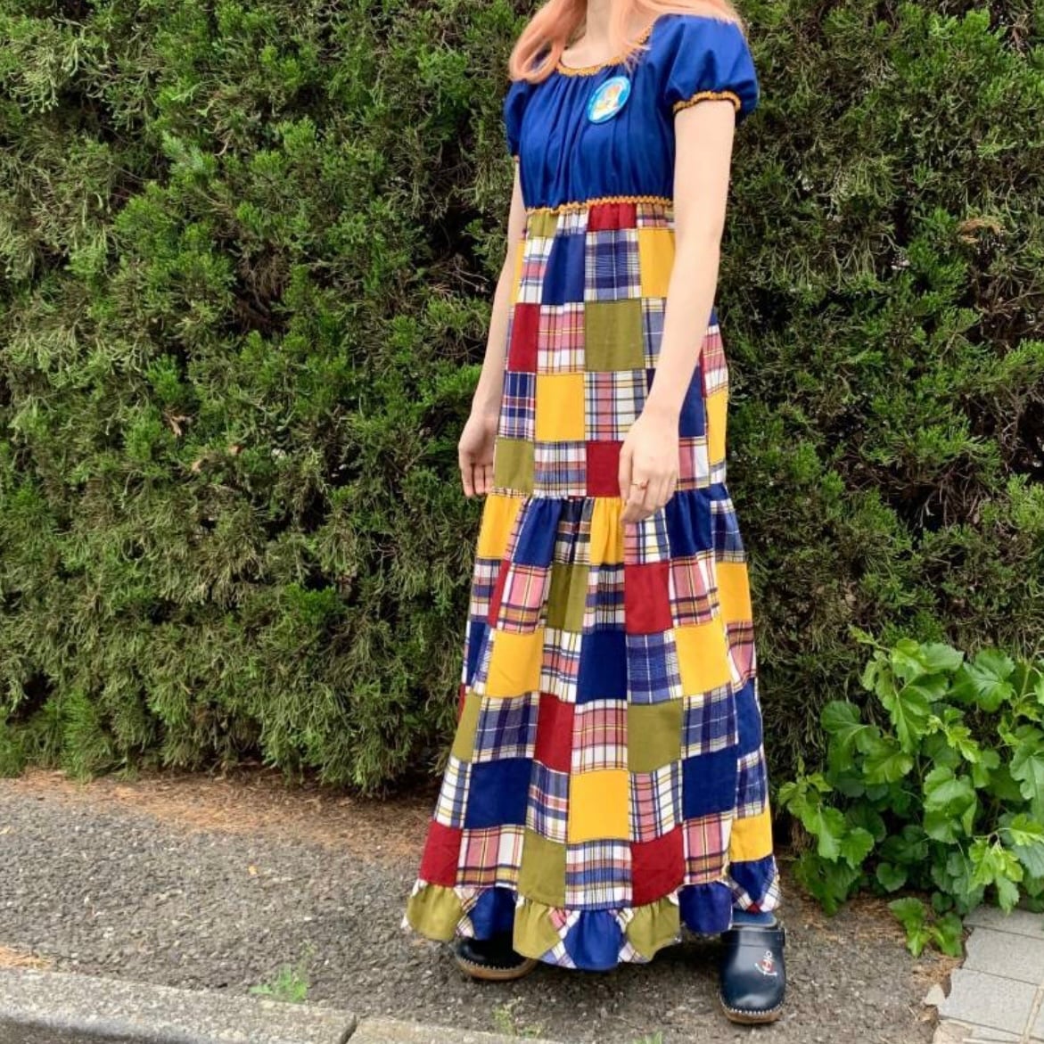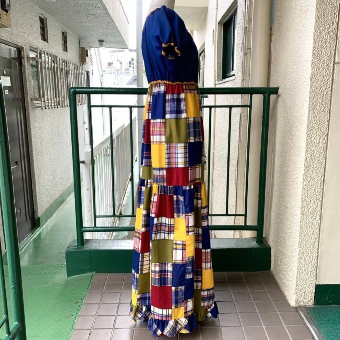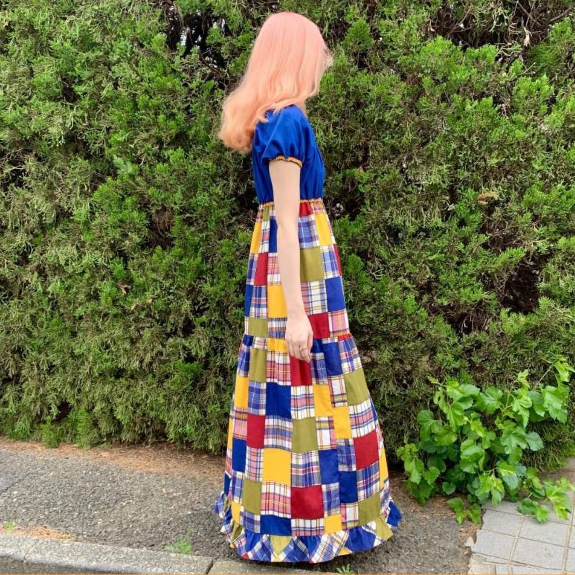 70'S USA Vintage Sears plaid patchwork pattern long dress。