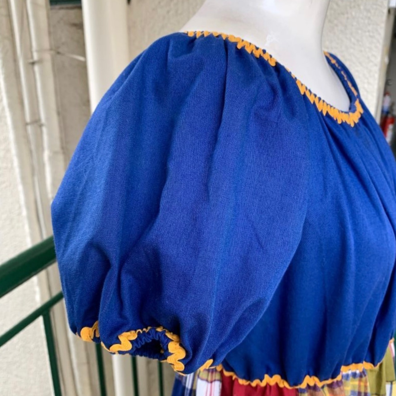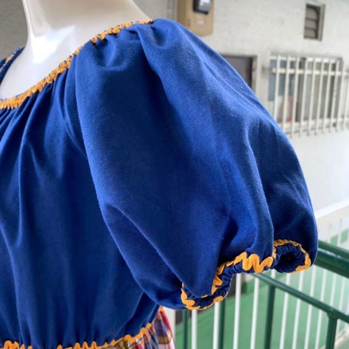 ネイビーのトップとスカートのチェックとプレーンのパッチワーク柄の切り返しのデザインや襟元、袖口、ウエストのなみなみテープのラインもとっても可愛いです。