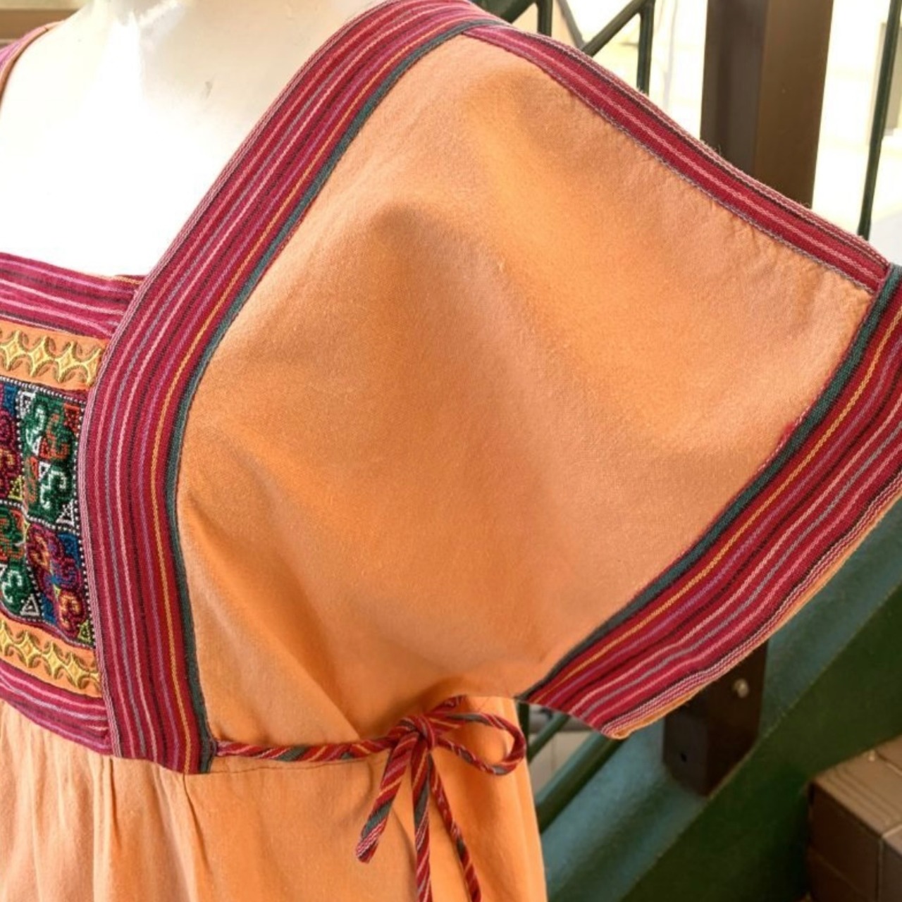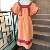 ライトオレンジのボディーにマルチカラーの生地のライン、カードが6枚並んだようなカラフルな刺繍や刺繍リボンの装飾がとっても可愛い1着です。