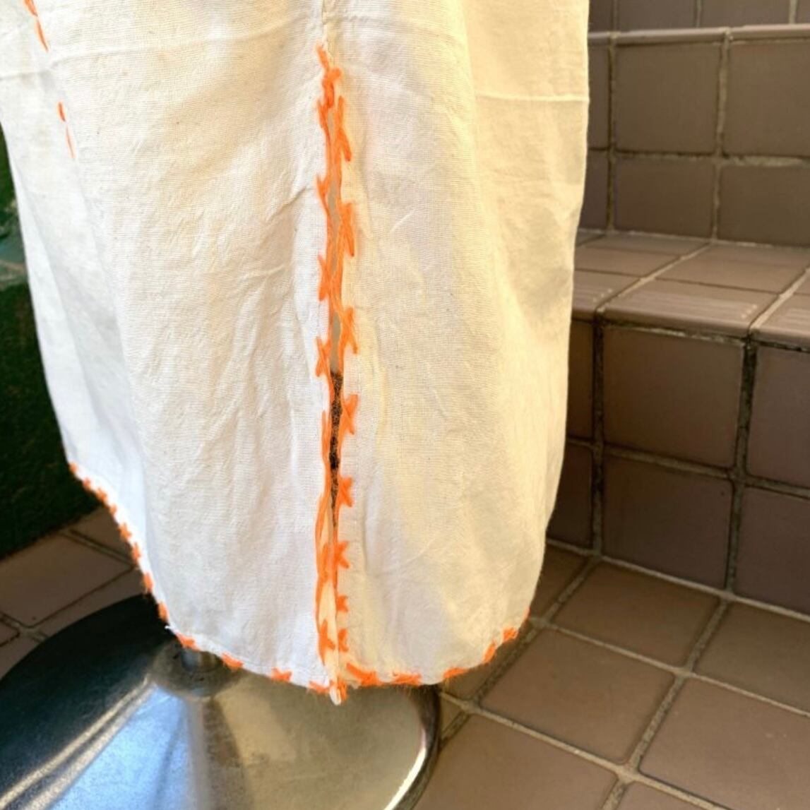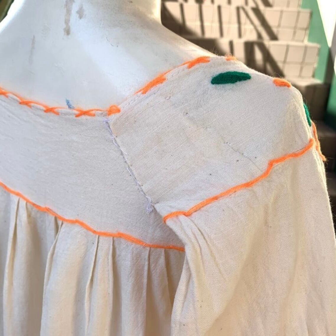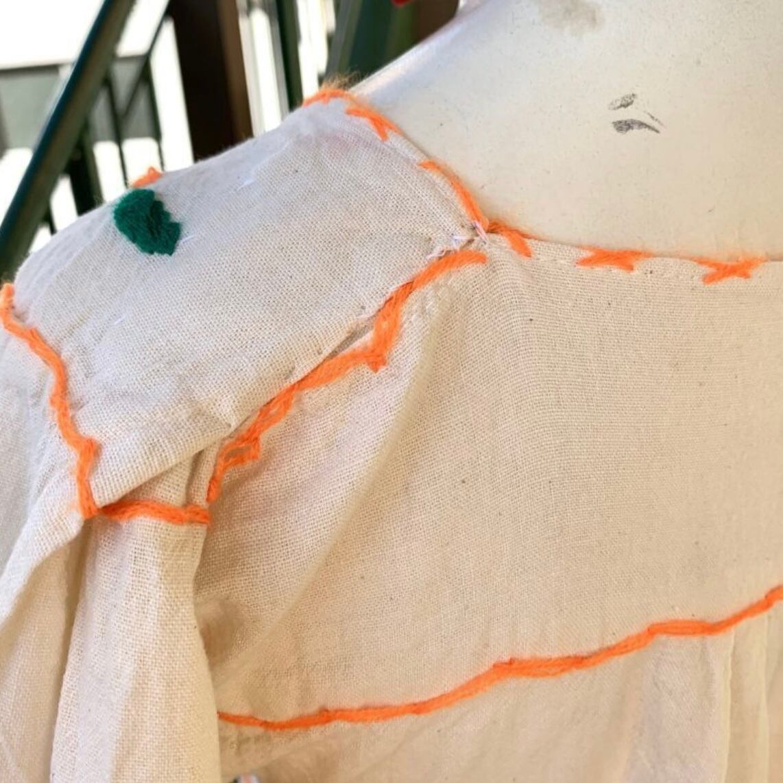 風合いのある生成りのボディーにオレンジのステッチやフラワー刺繍がとっても可愛い1着です。