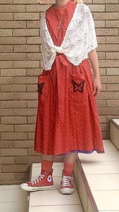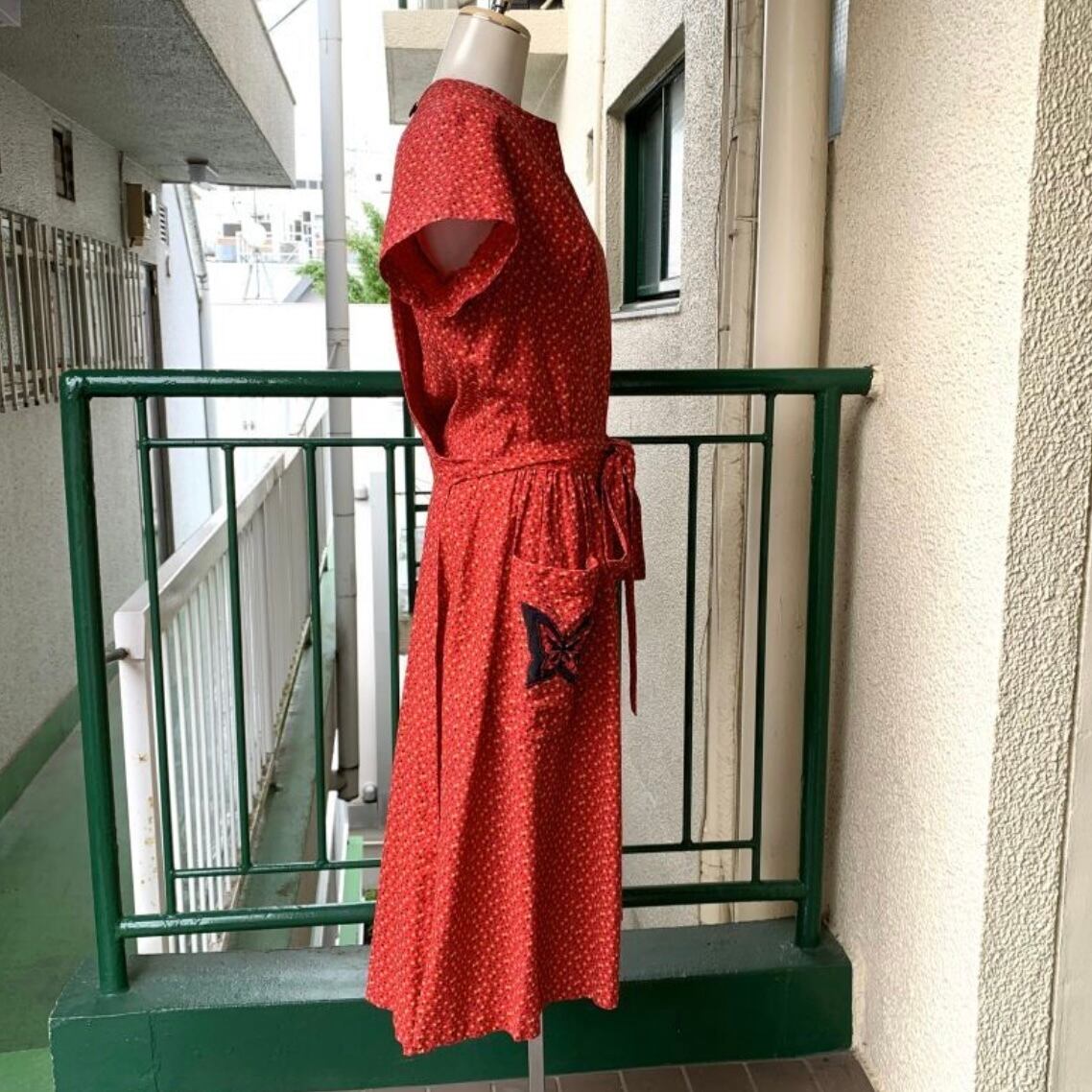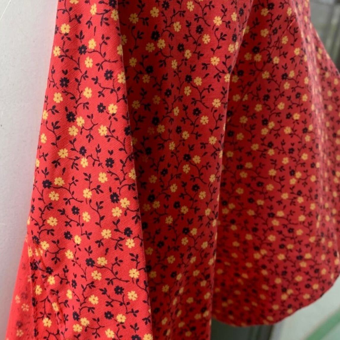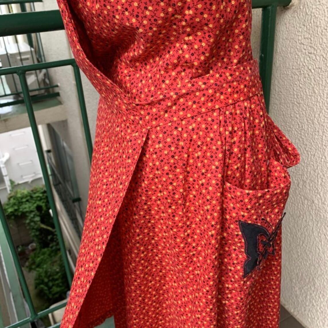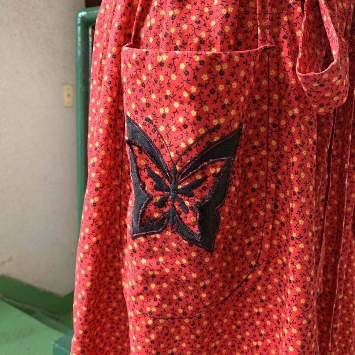 レッドベースにイエロー、ブラックの小花柄、ポケットの蝶々パッチがとっても可愛い1着です。
