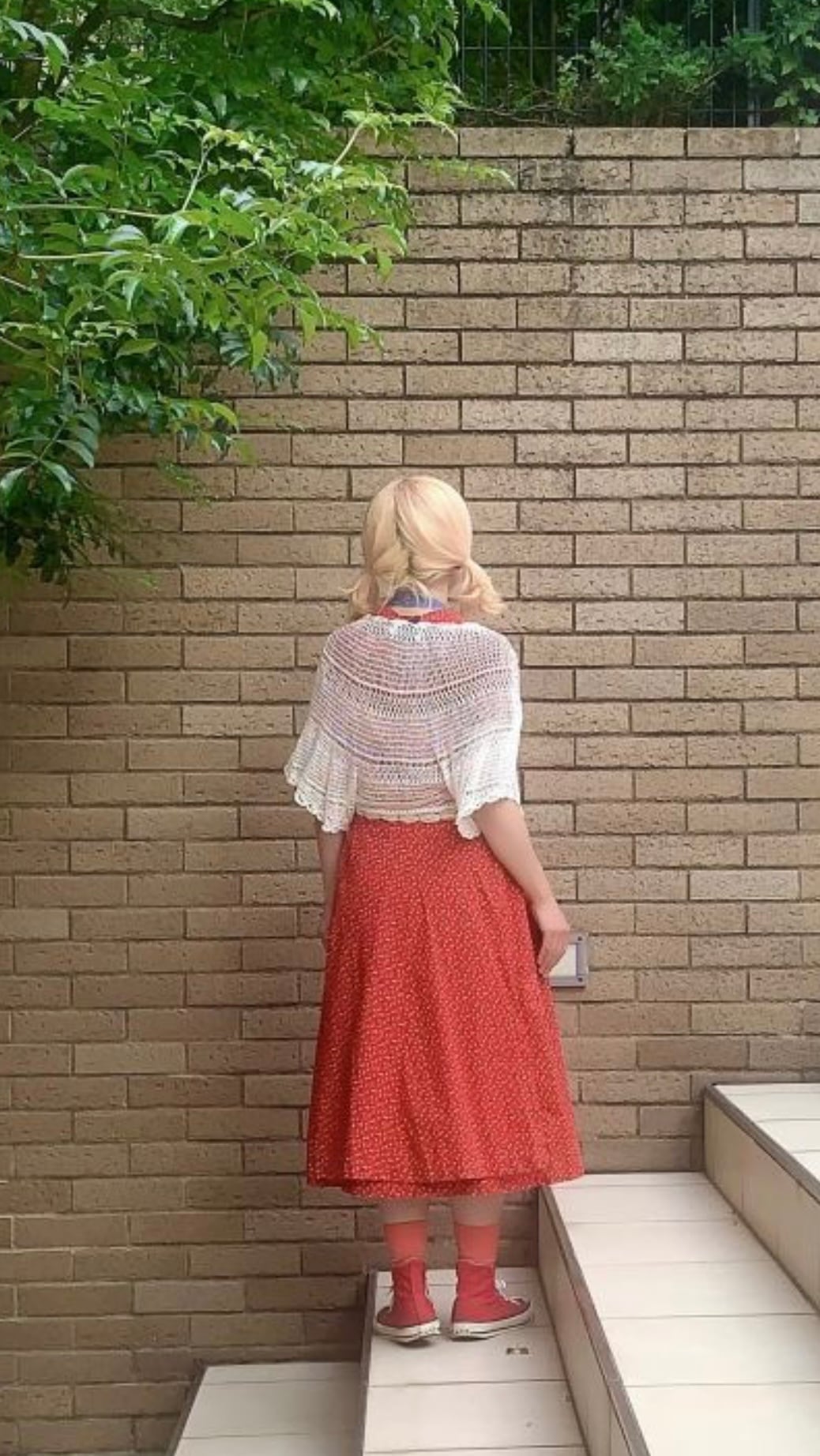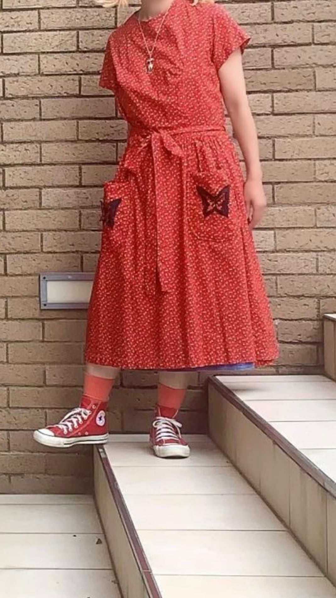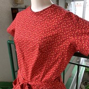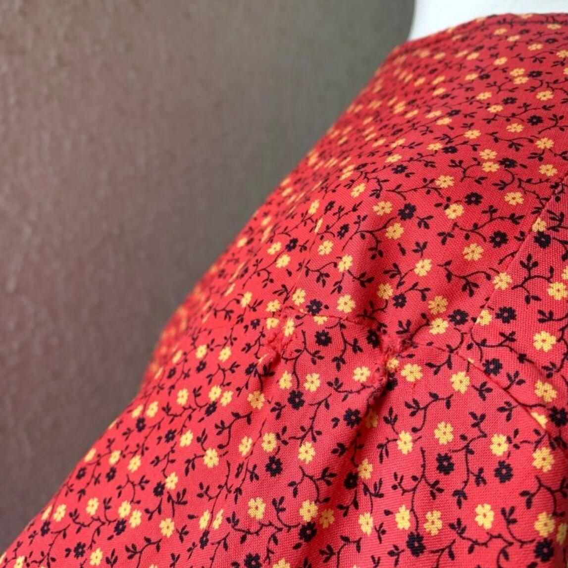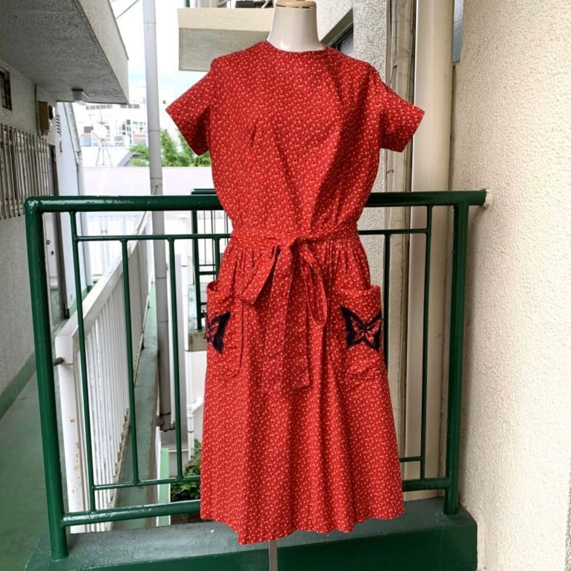 レッドベースにイエロー、ブラックの小花柄、ポケットの蝶々パッチがとっても可愛い1着です。
