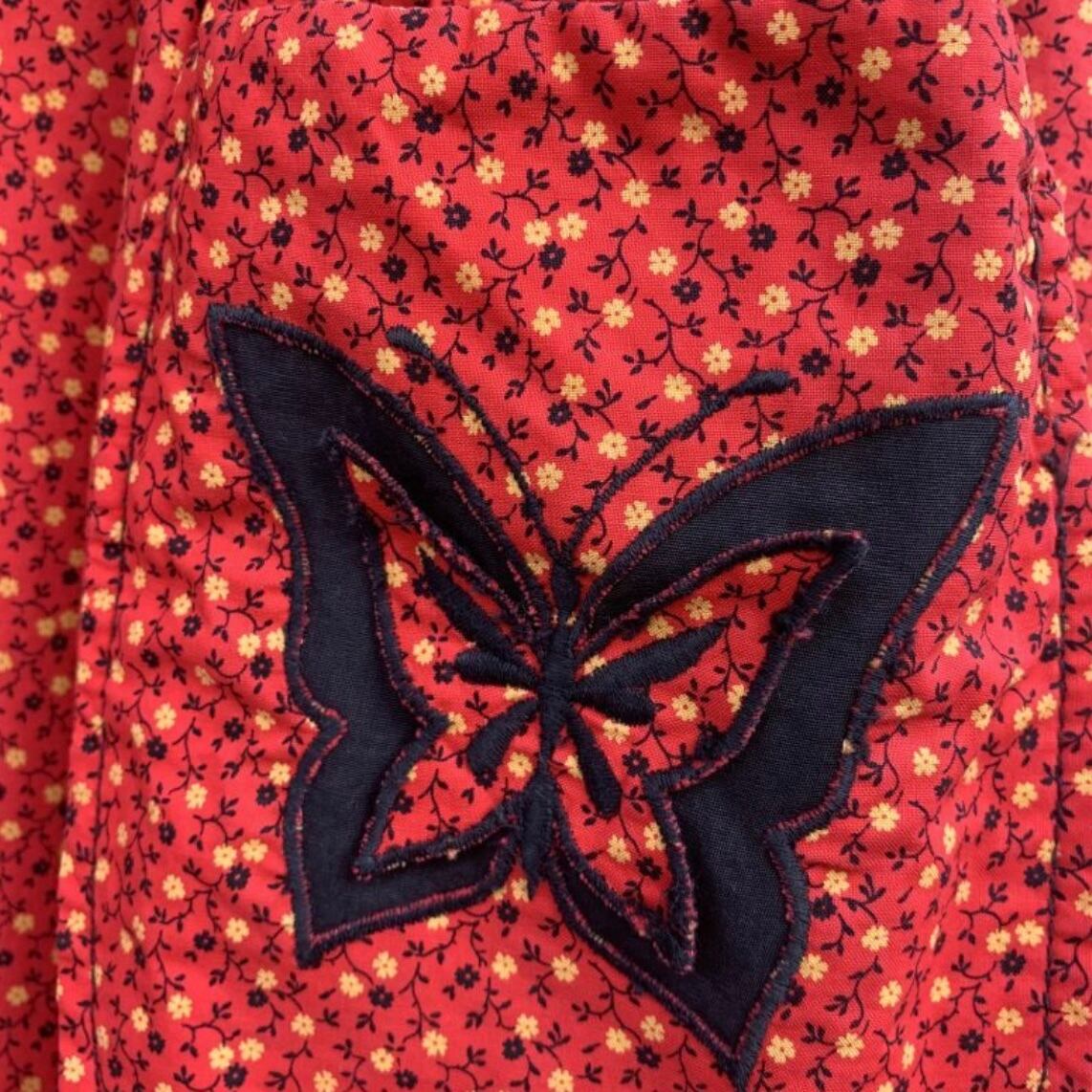 蝶々のパッチは2つの蝶々が重なった手の込んだ作りで上の小花柄の蝶々は中央部分のみが縫われており、ふち周りがヒラヒラとなってとっても可愛いデザインです。