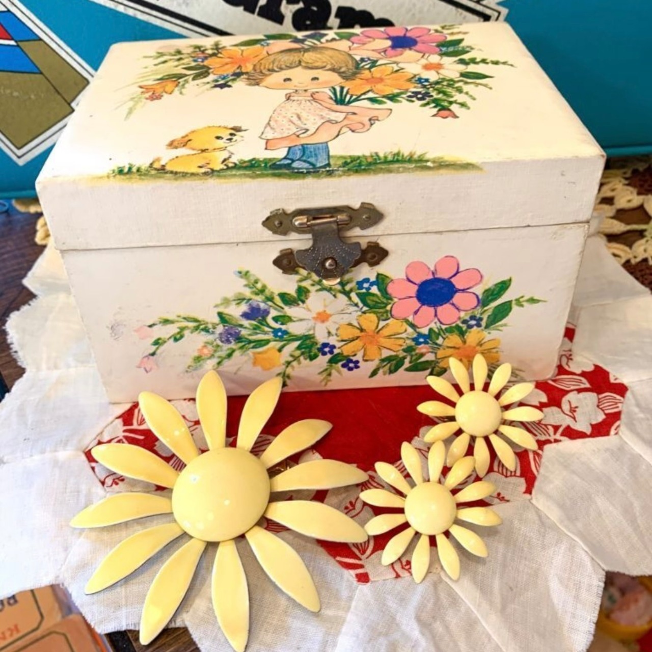 つやつやとしたライトイエローカラーのフラワーモチーフがレトロポップでとっても可愛いアイテムです。