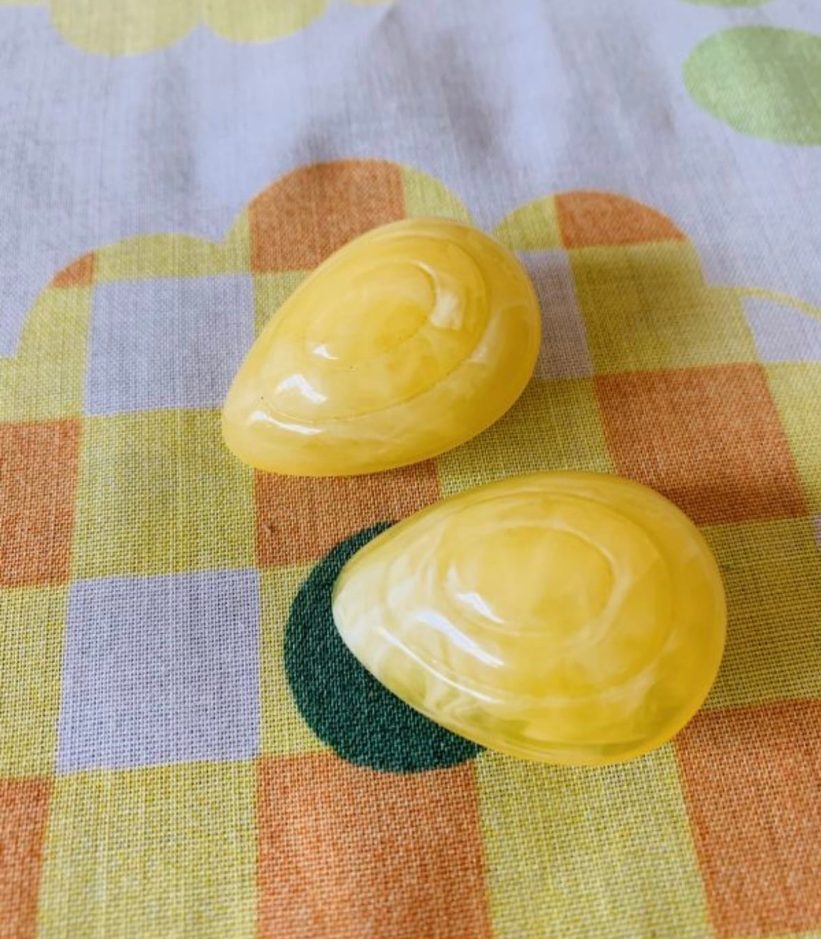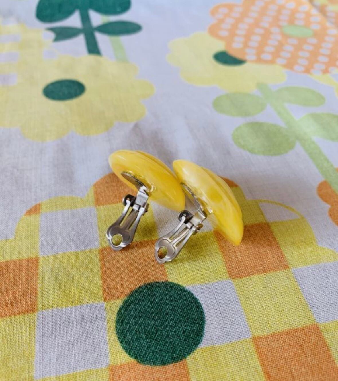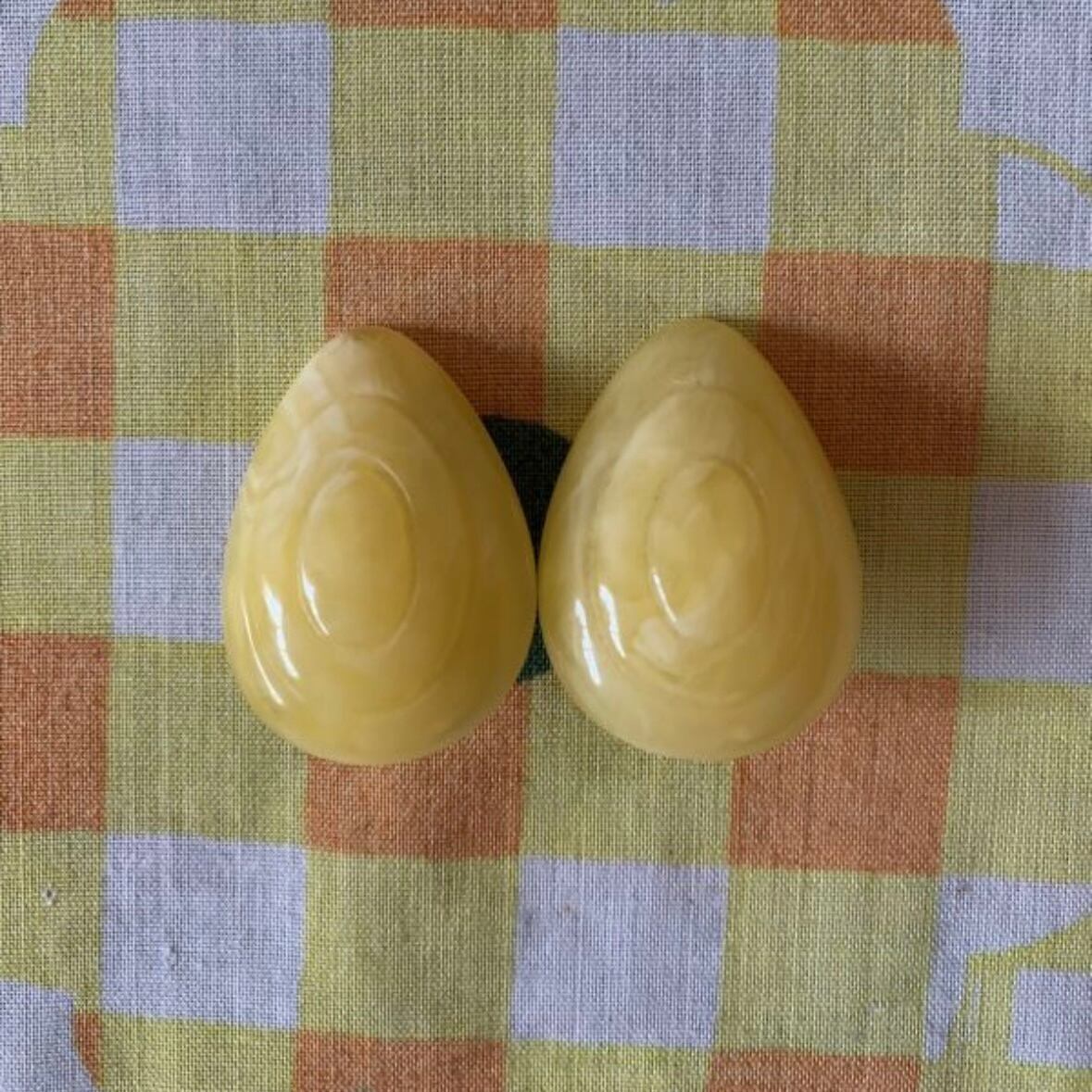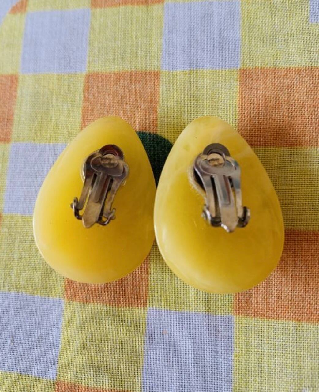 60'S〜70'S USA マーブルイエロー Drop earringsです。マーブル模様のライトイエローが可愛いドロップ型のイヤリング。中央には卵型のような2つの溝がデザインされており、ポップかつ上品な雰囲気です。大ぶりなので華やかなインパクトがあります。気になるような大きなダメージはありません。