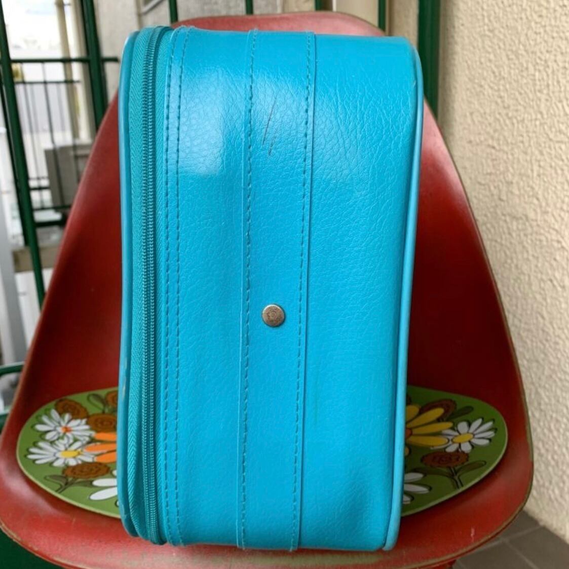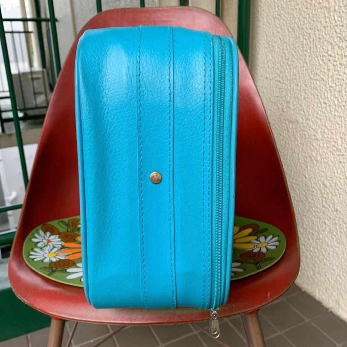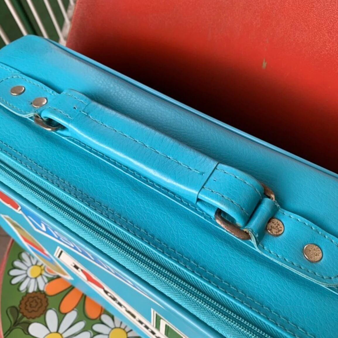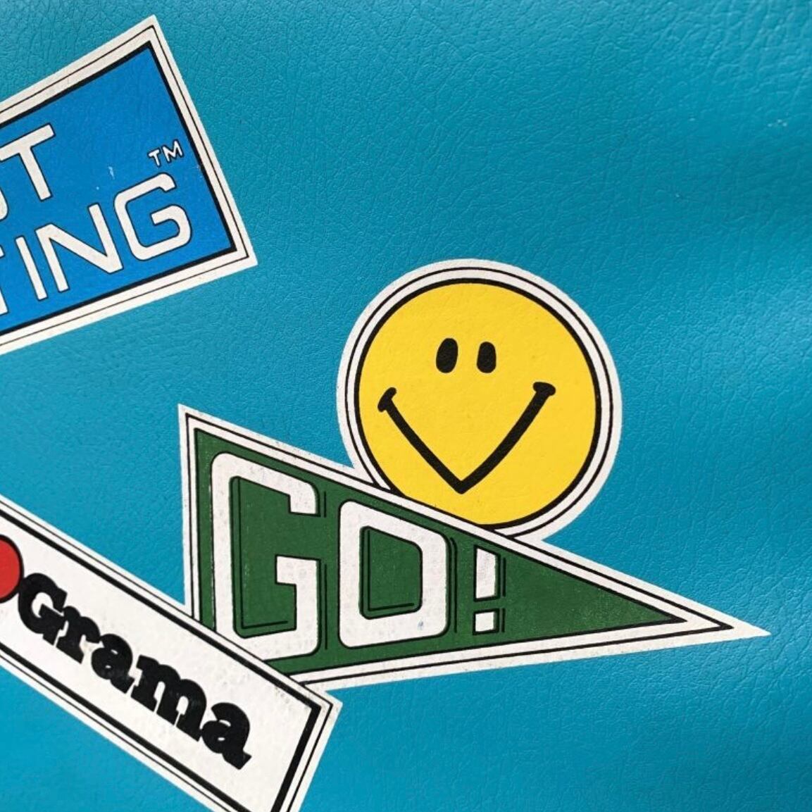 ポップなライトブルーのフェイクレザーにトラベルモチーフのステッカーやスマイルステッカーのプリントがヴィンテージならではな、とっても可愛いアイテムです。