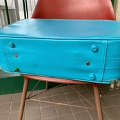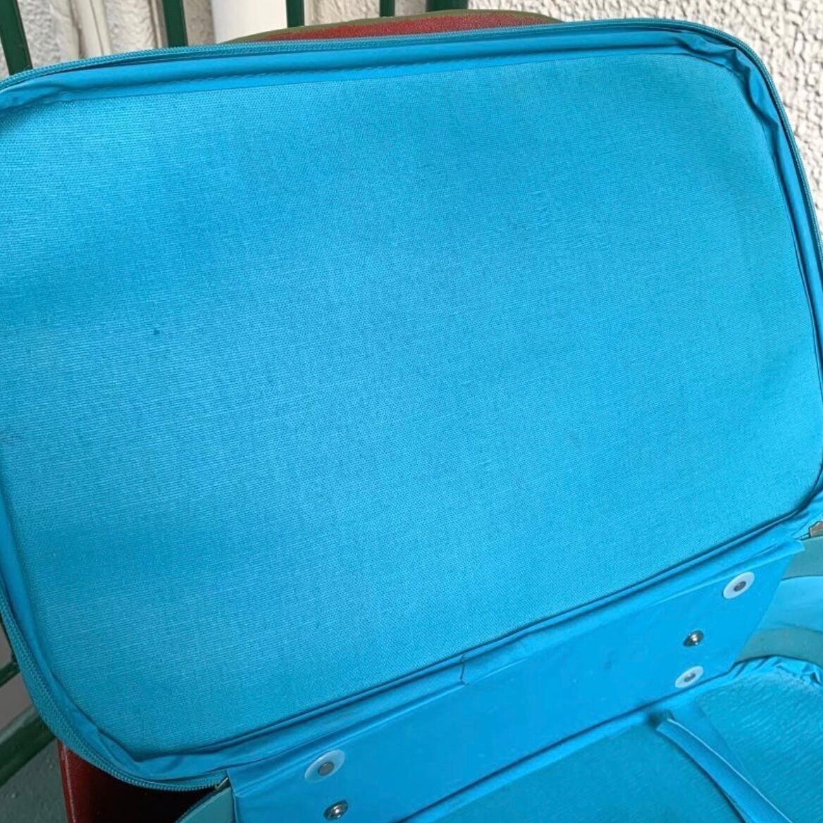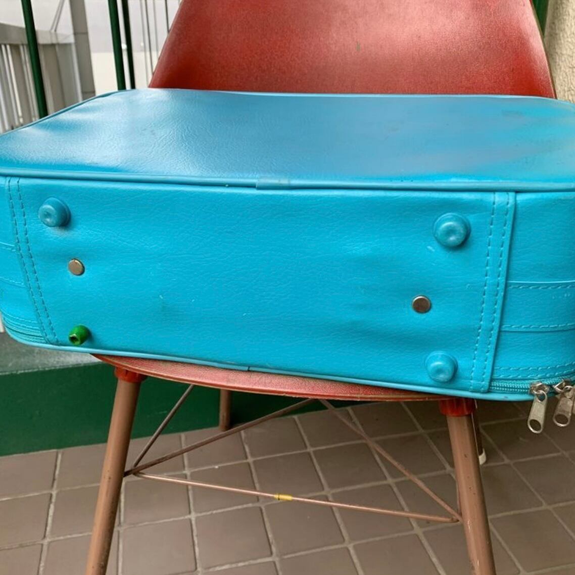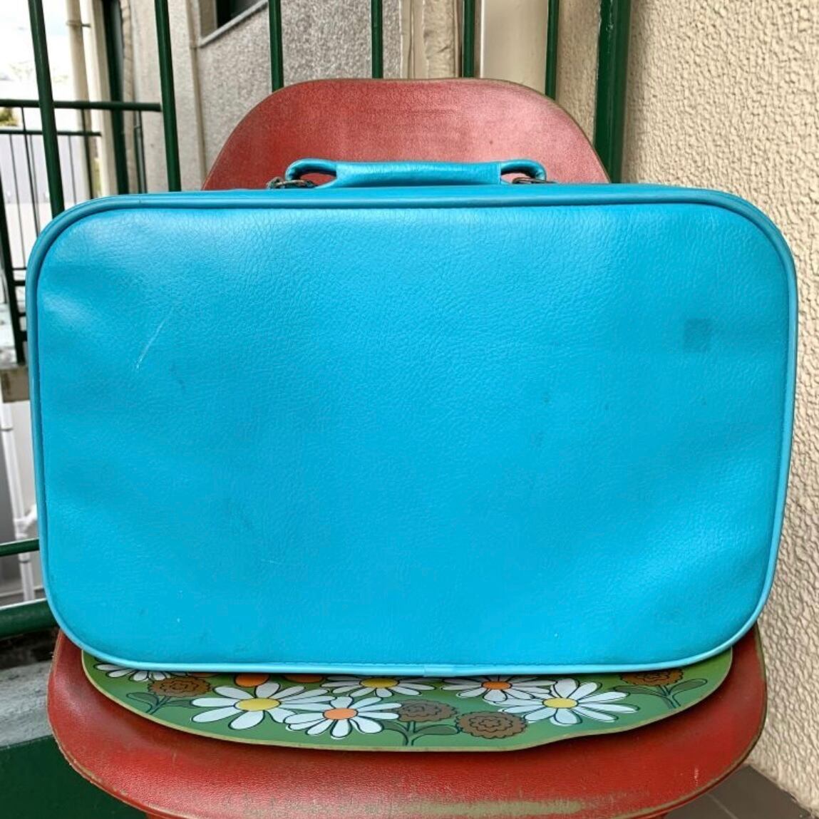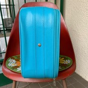 ポップなライトブルーのフェイクレザーにトラベルモチーフのステッカーやスマイルステッカーのプリントがヴィンテージならではな、とっても可愛いアイテムです。