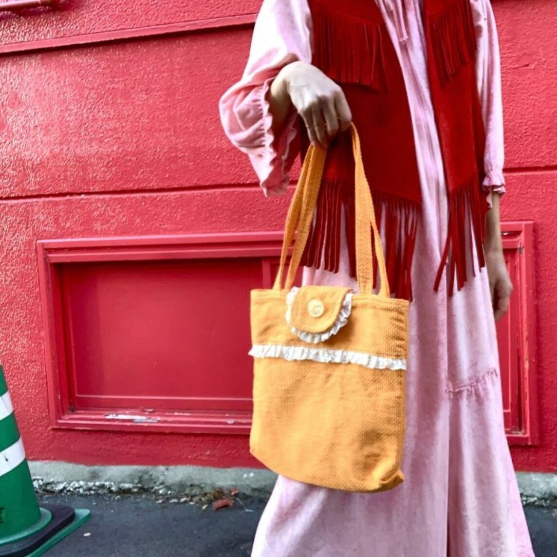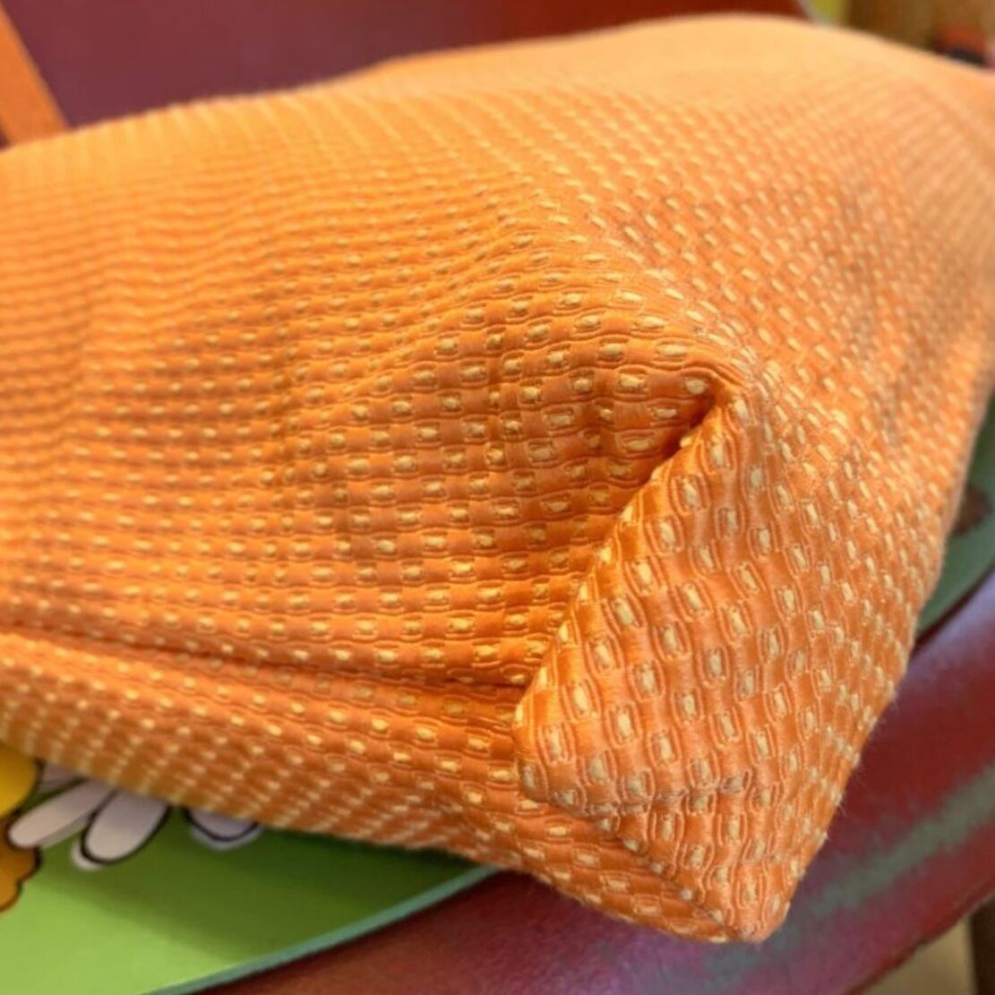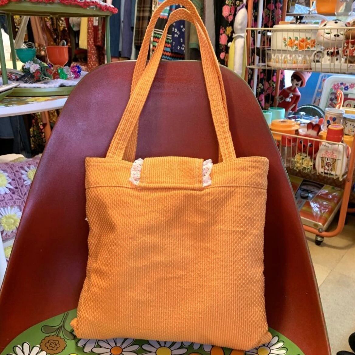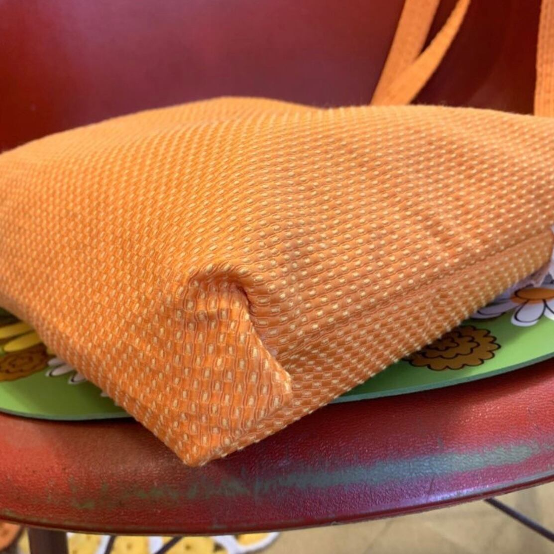 スウィートなオレンジカラーにイエローのステッチやポコポコとした厚みのある生地がとっても可愛いです。