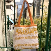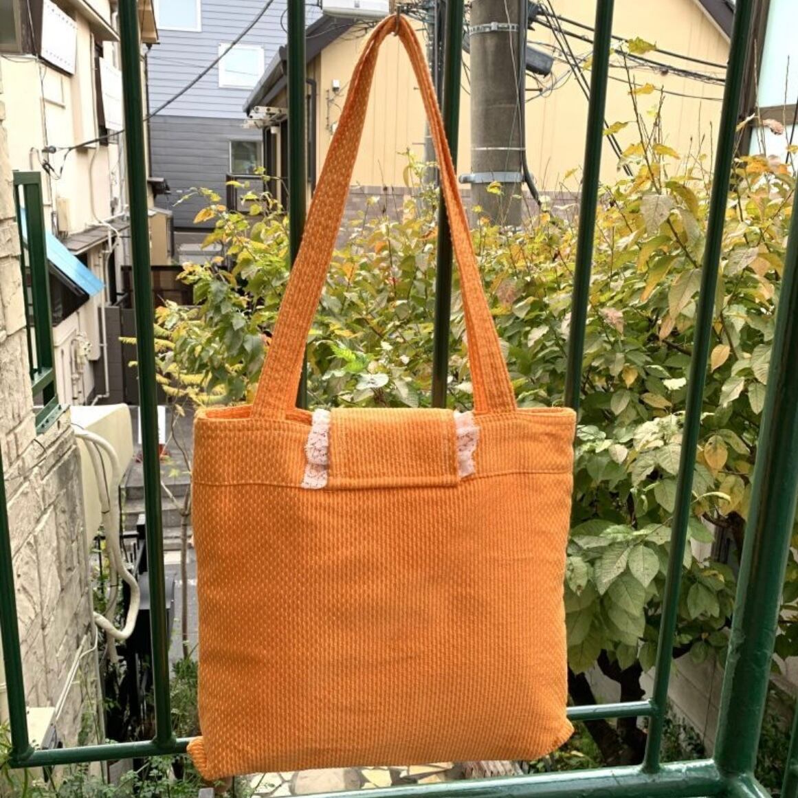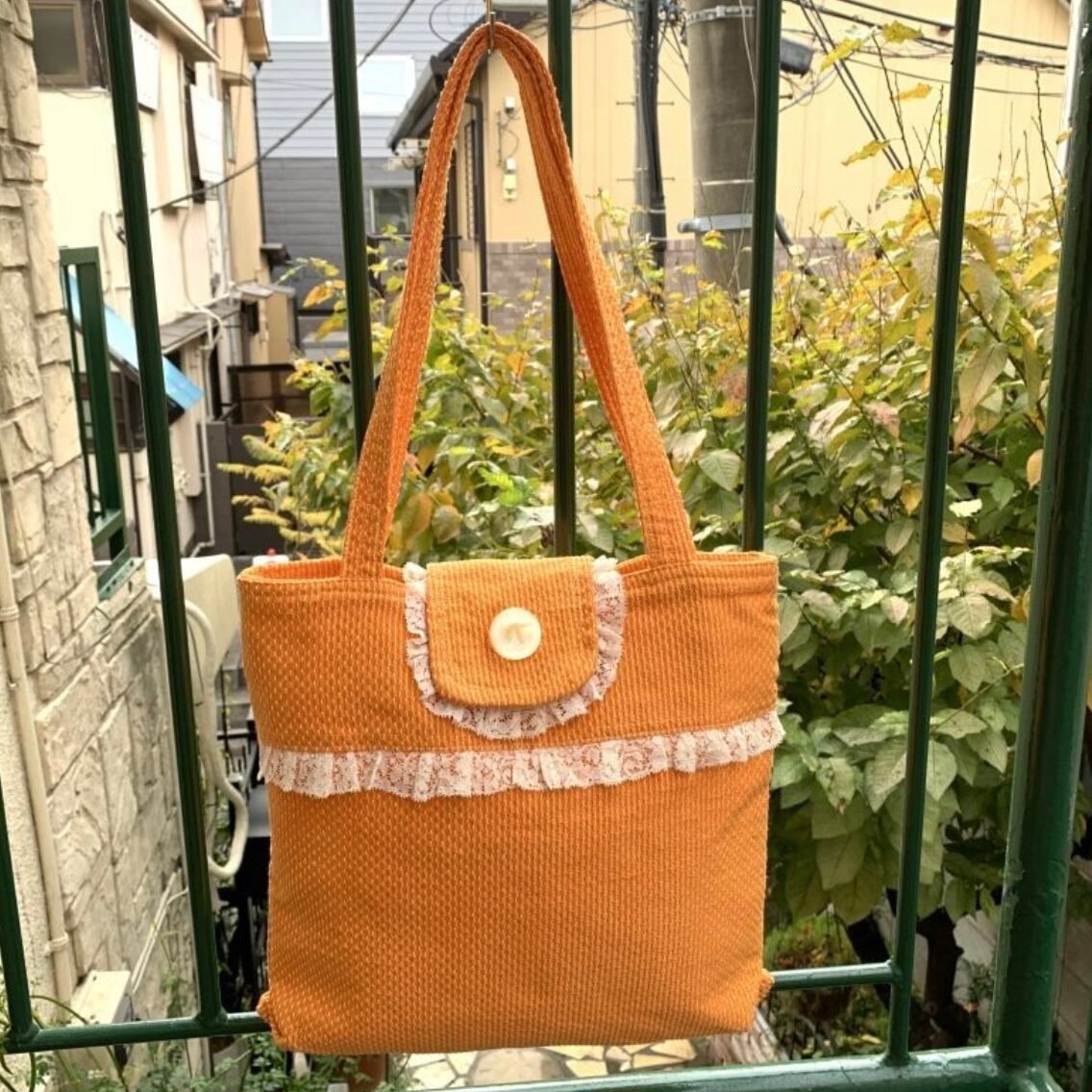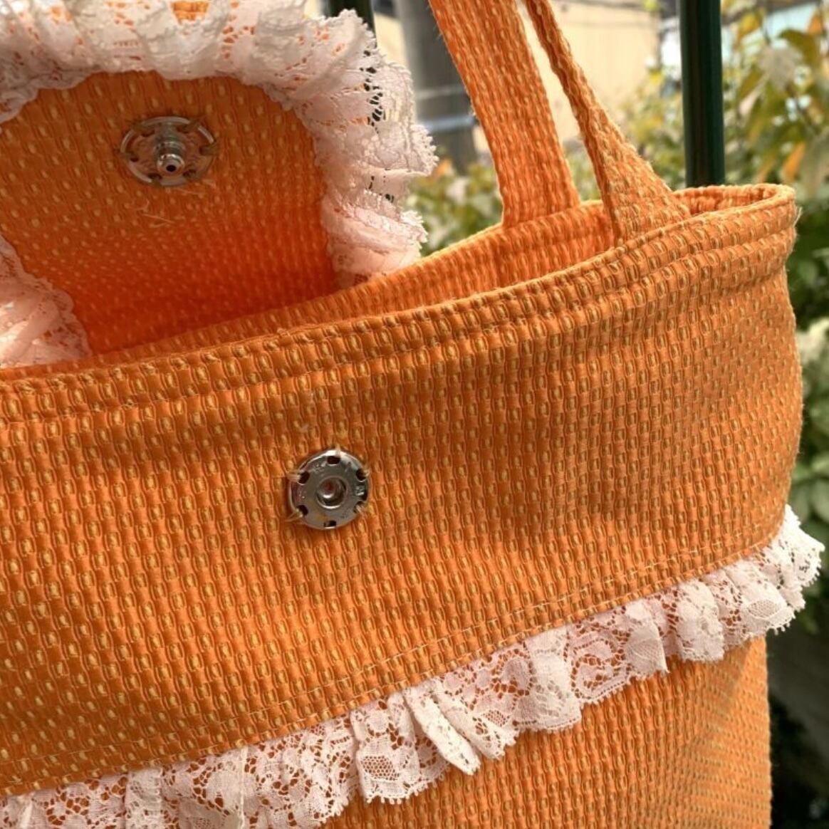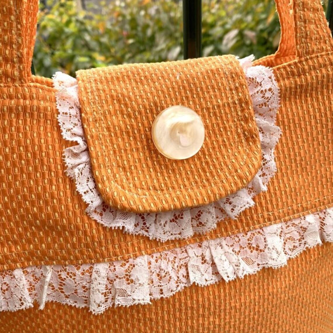 スウィートなオレンジカラーにイエローのステッチやポコポコとした厚みのある生地がとっても可愛いです。