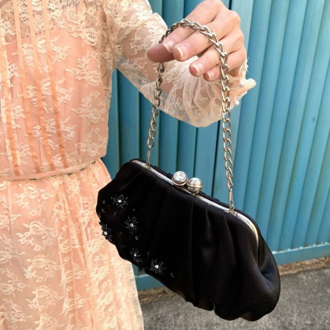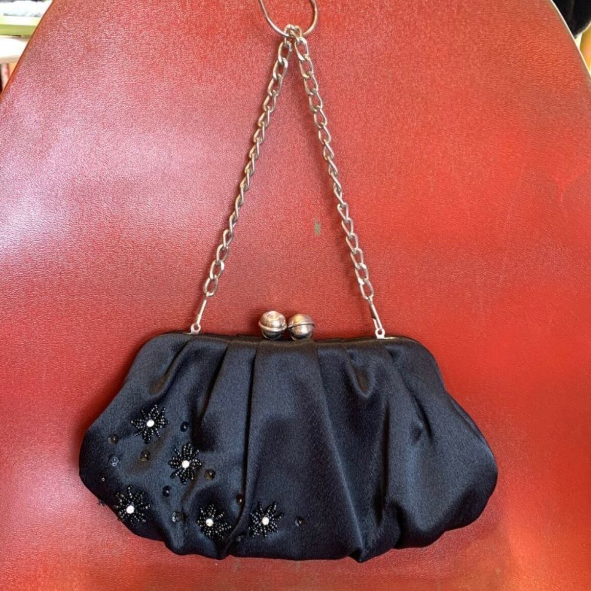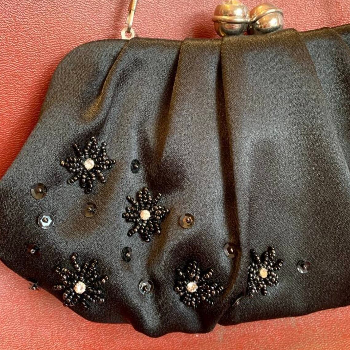 マットな光沢のブラックのボディーにキラキラとしたフラワービーズやスパンコールの装飾、ひだが織り込まれたデザインや大きなビジューが埋め込まれた留め具のフォルムがとっても可愛いです。