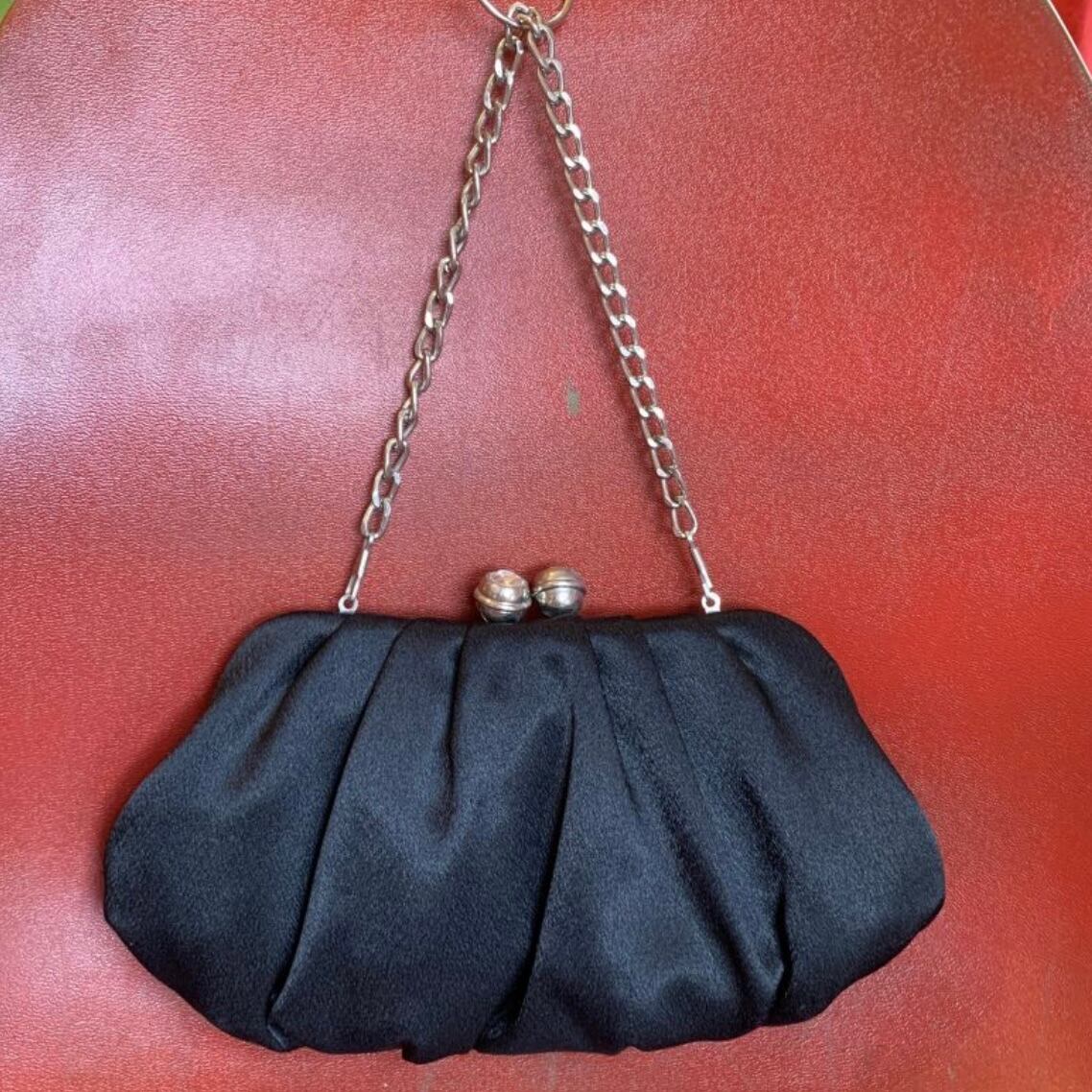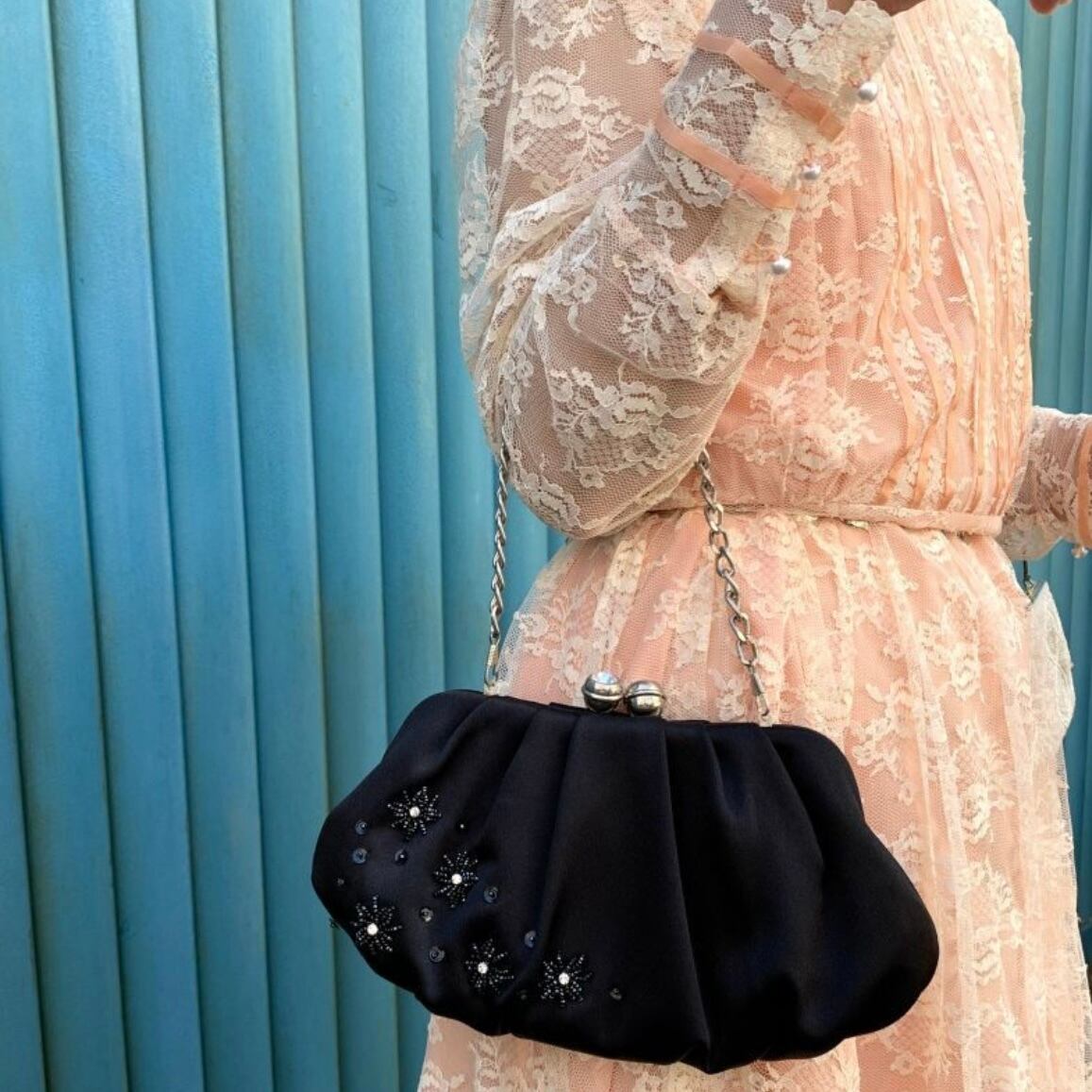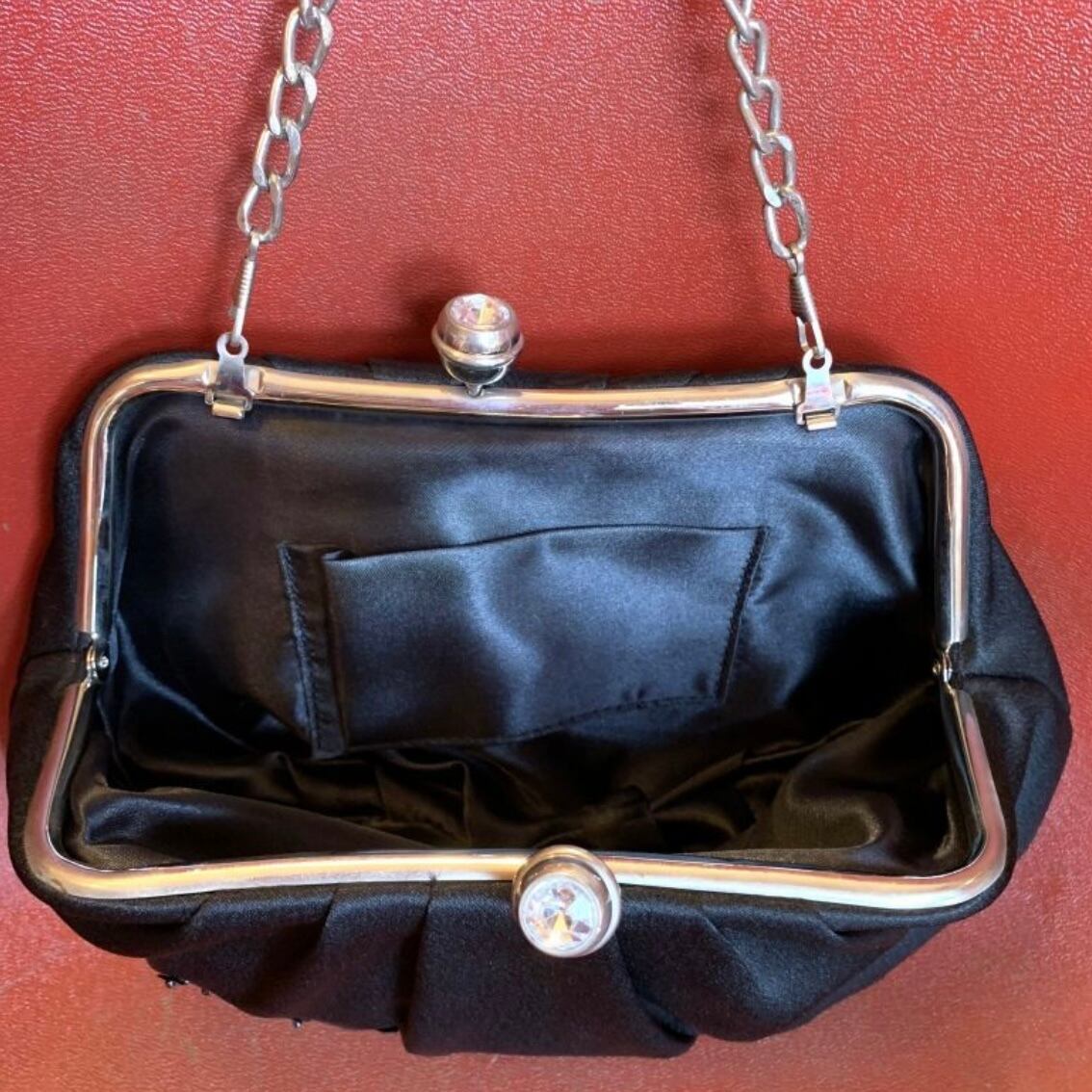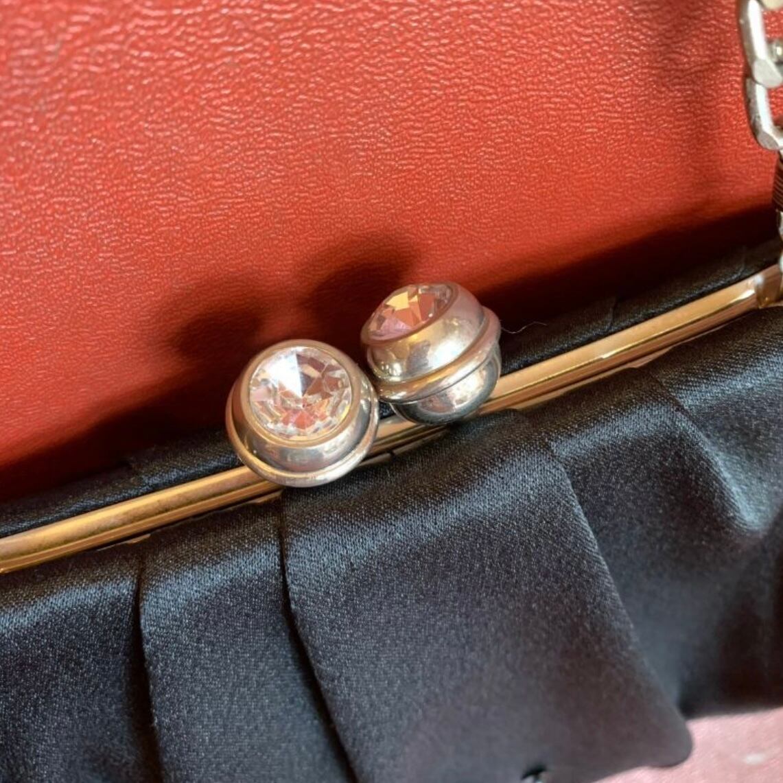 マットな光沢のブラックのボディーにキラキラとしたフラワービーズやスパンコールの装飾、ひだが織り込まれたデザインや大きなビジューが埋め込まれた留め具のフォルムがとっても可愛いです。