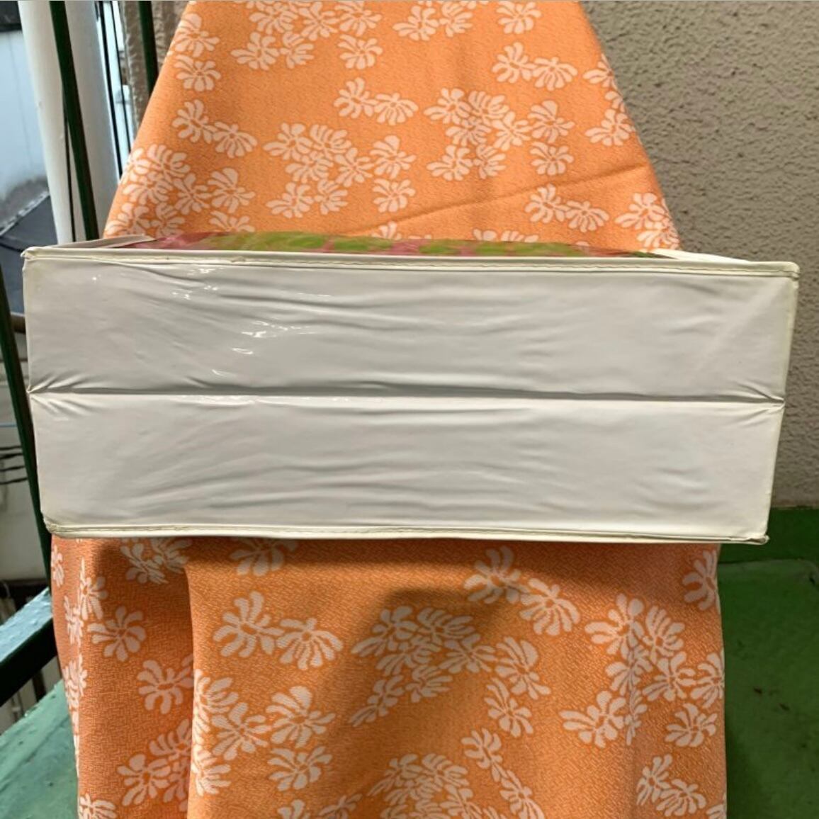 経年による若干のシミ、ビニールのシワのクセ、片方の上の蓋になる部分の端のパイピング部分に僅かな破れ、片方のサイドの上の端の部分に小さな裂けのリペアが見られますが、ご使用に支障は無いかと思います。