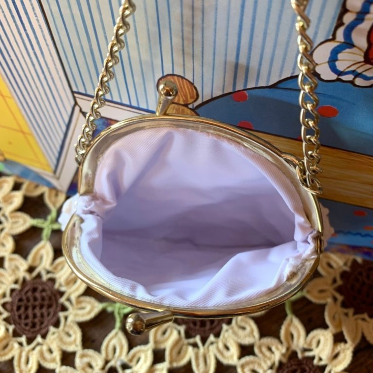小さいサイズながら、しっかりとした作りでゴールドのチェーンや斜めについたがま口も可愛いポイントです。