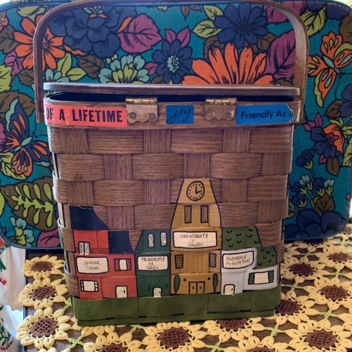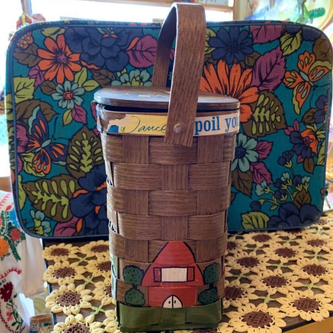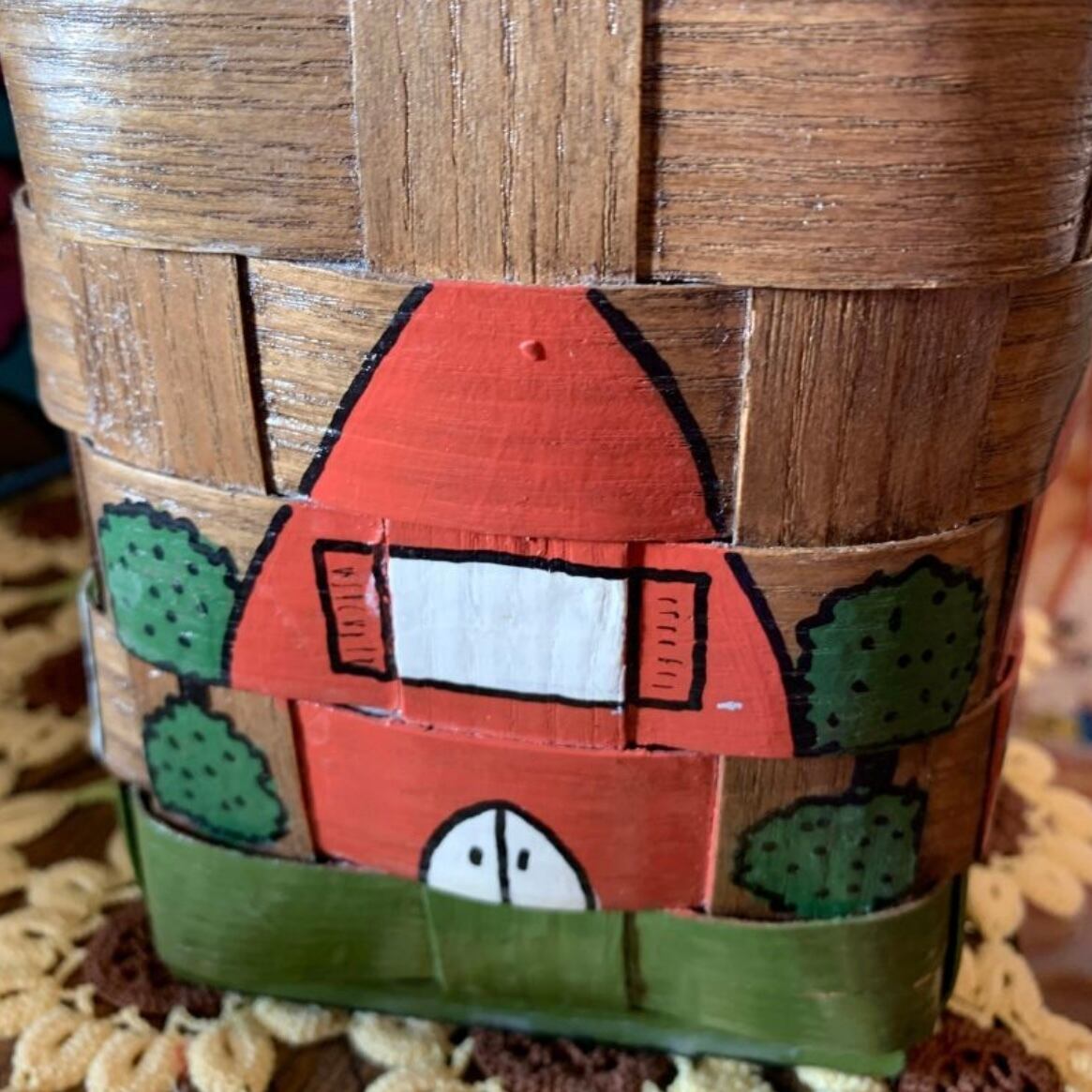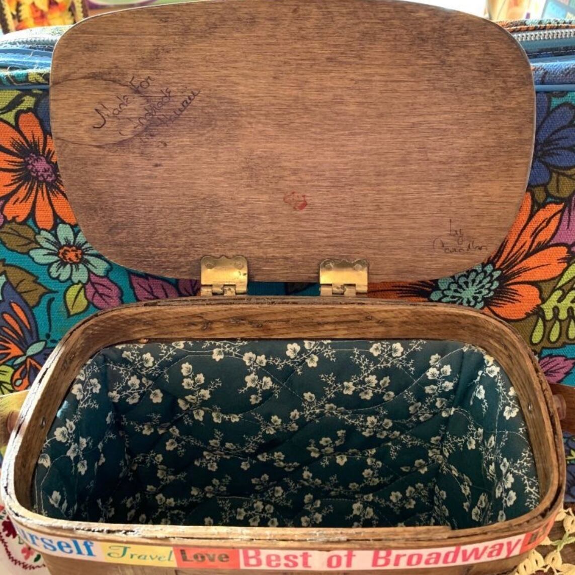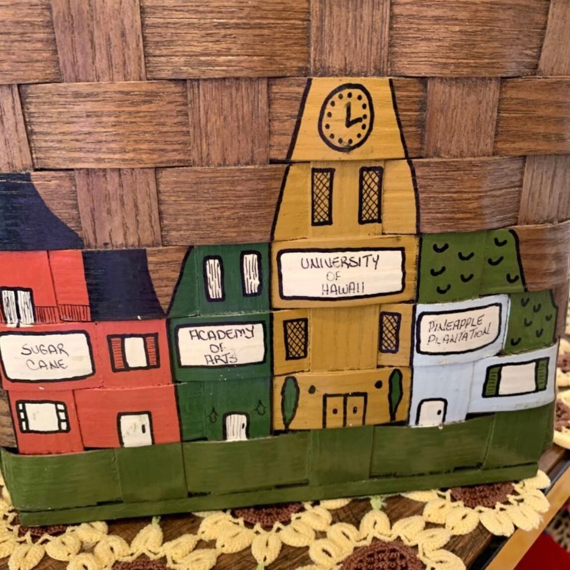 カラフルな街並みがハンドペイントで描かれた木製のバスケットで、内側はネイビーとグリーンの中間色にホワイトの小花柄が可愛いキルティングが貼られています。