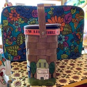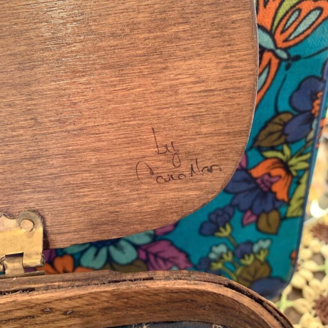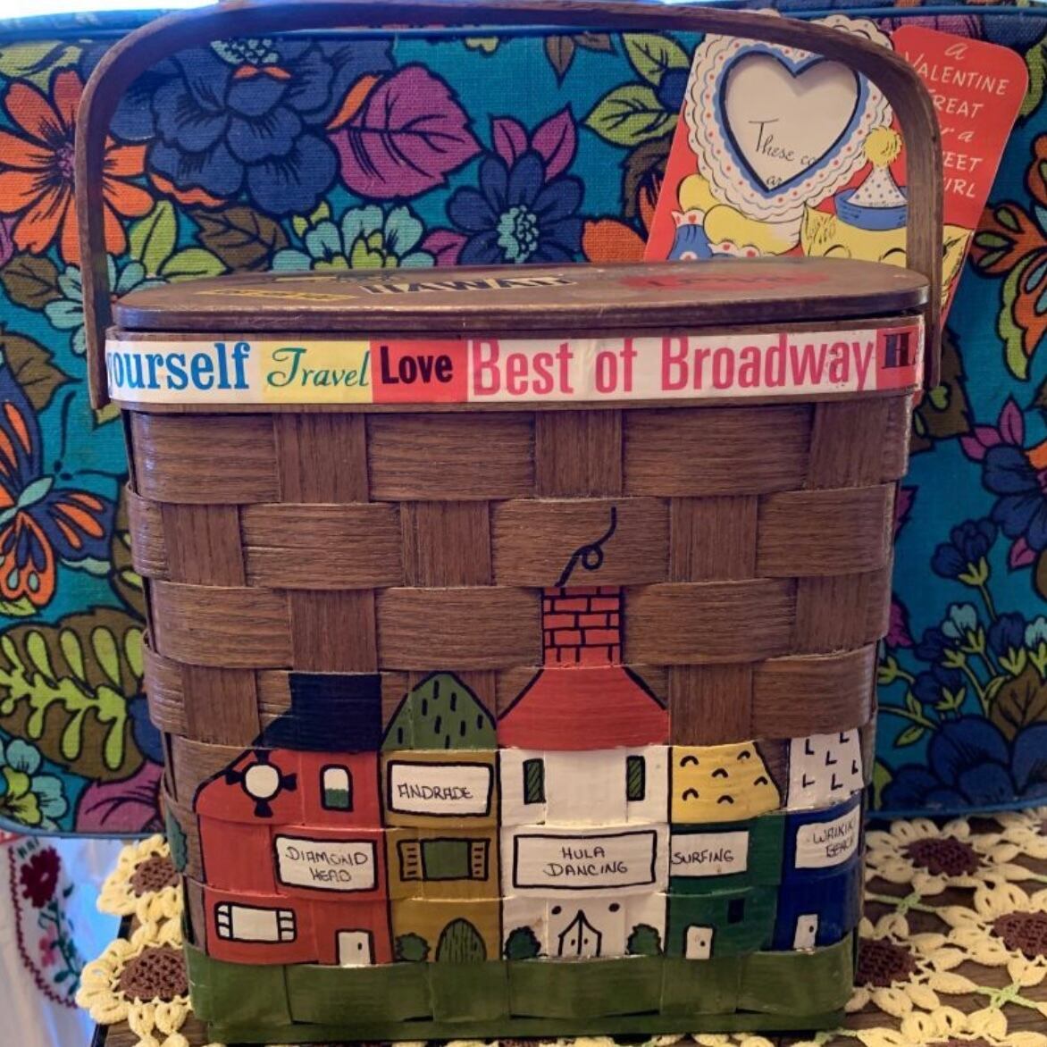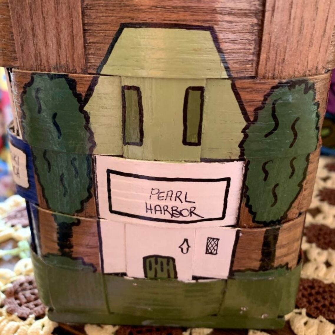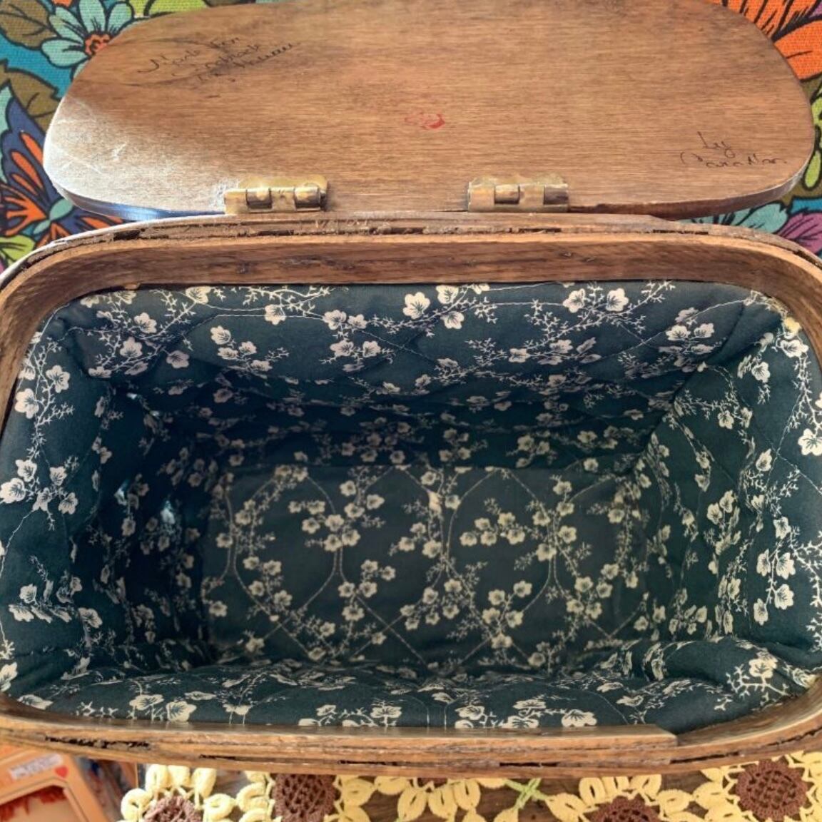 カラフルな街並みがハンドペイントで描かれた木製のバスケットで、内側はネイビーとグリーンの中間色にホワイトの小花柄が可愛いキルティングが貼られています。