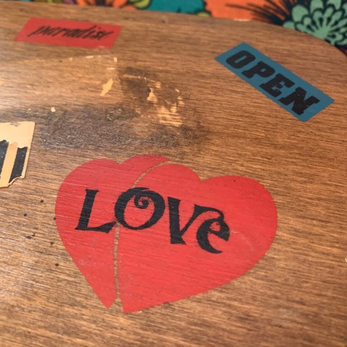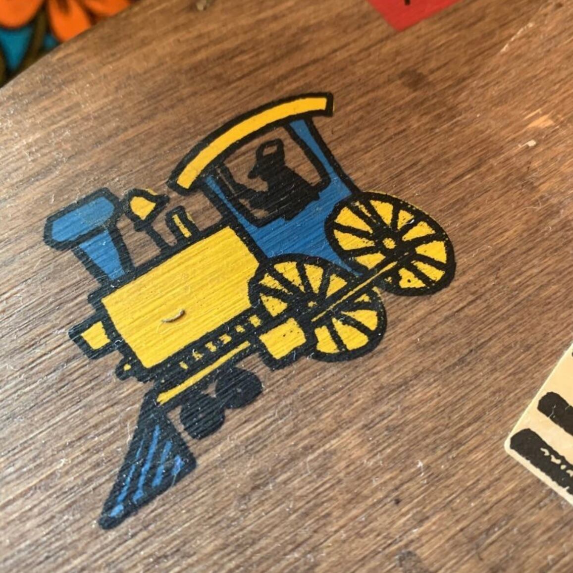 蓋のペニー硬貨が無く、剥がれの跡がありますがLOVEのハートや機関車のプリントなど、とっても可愛い雰囲気です。