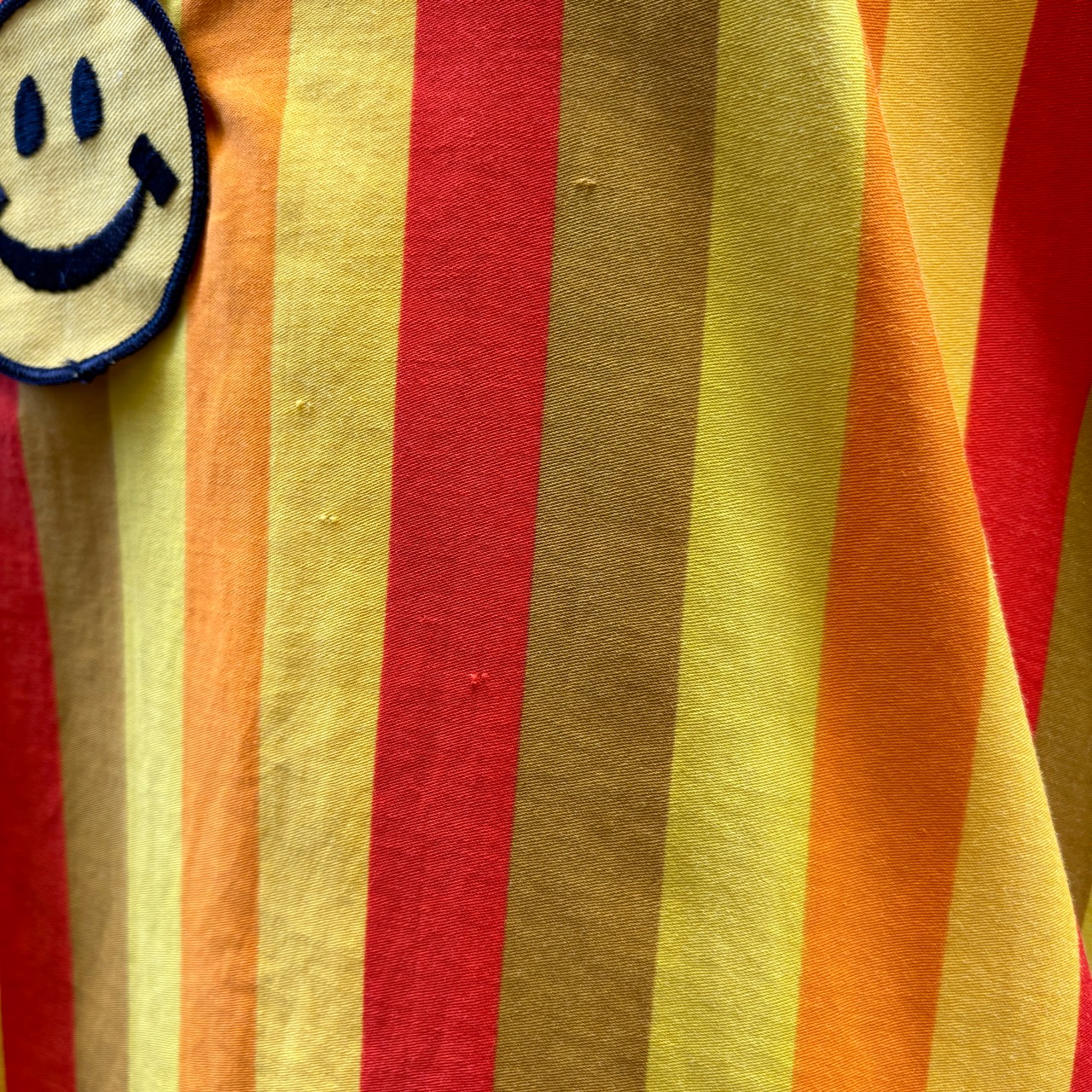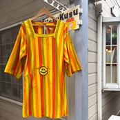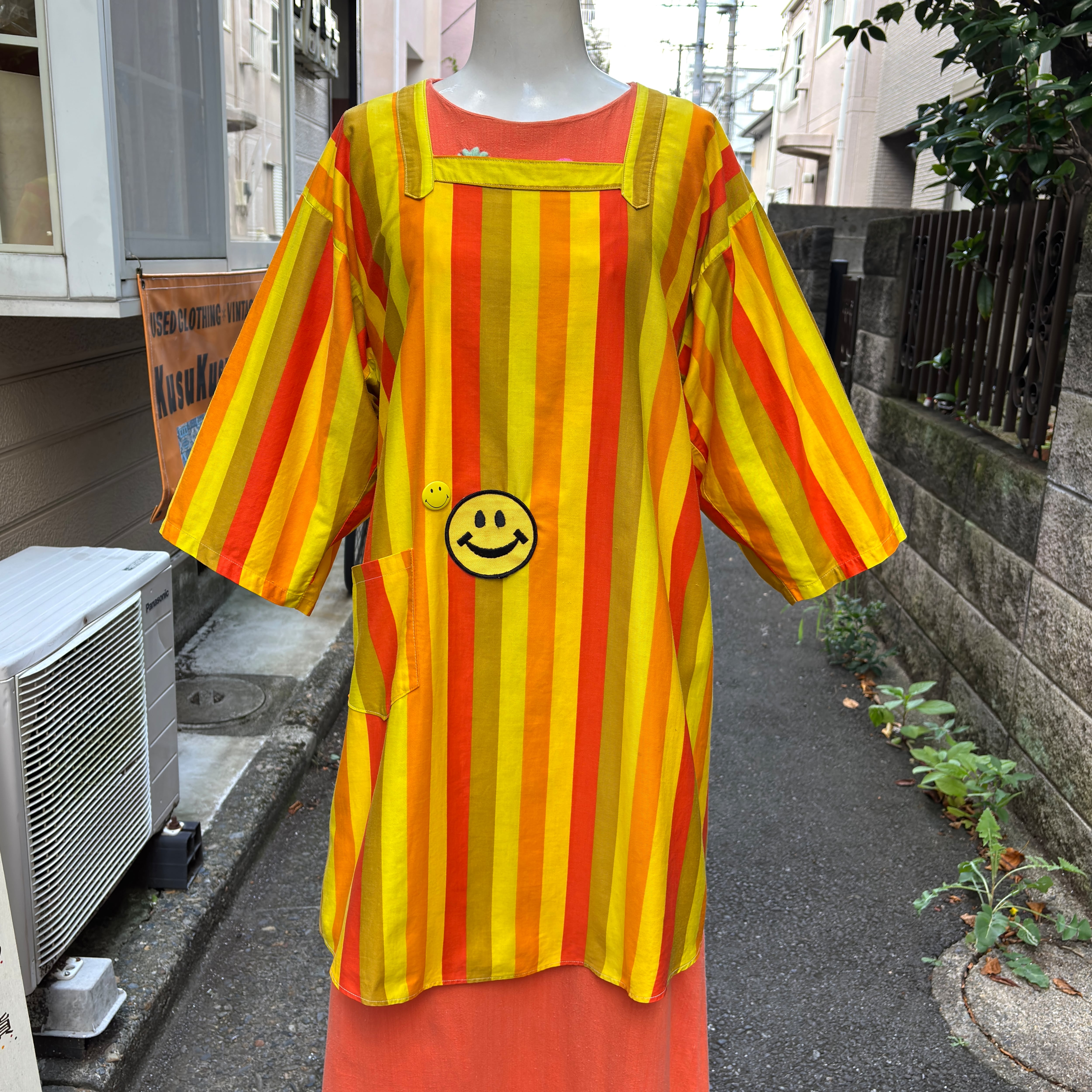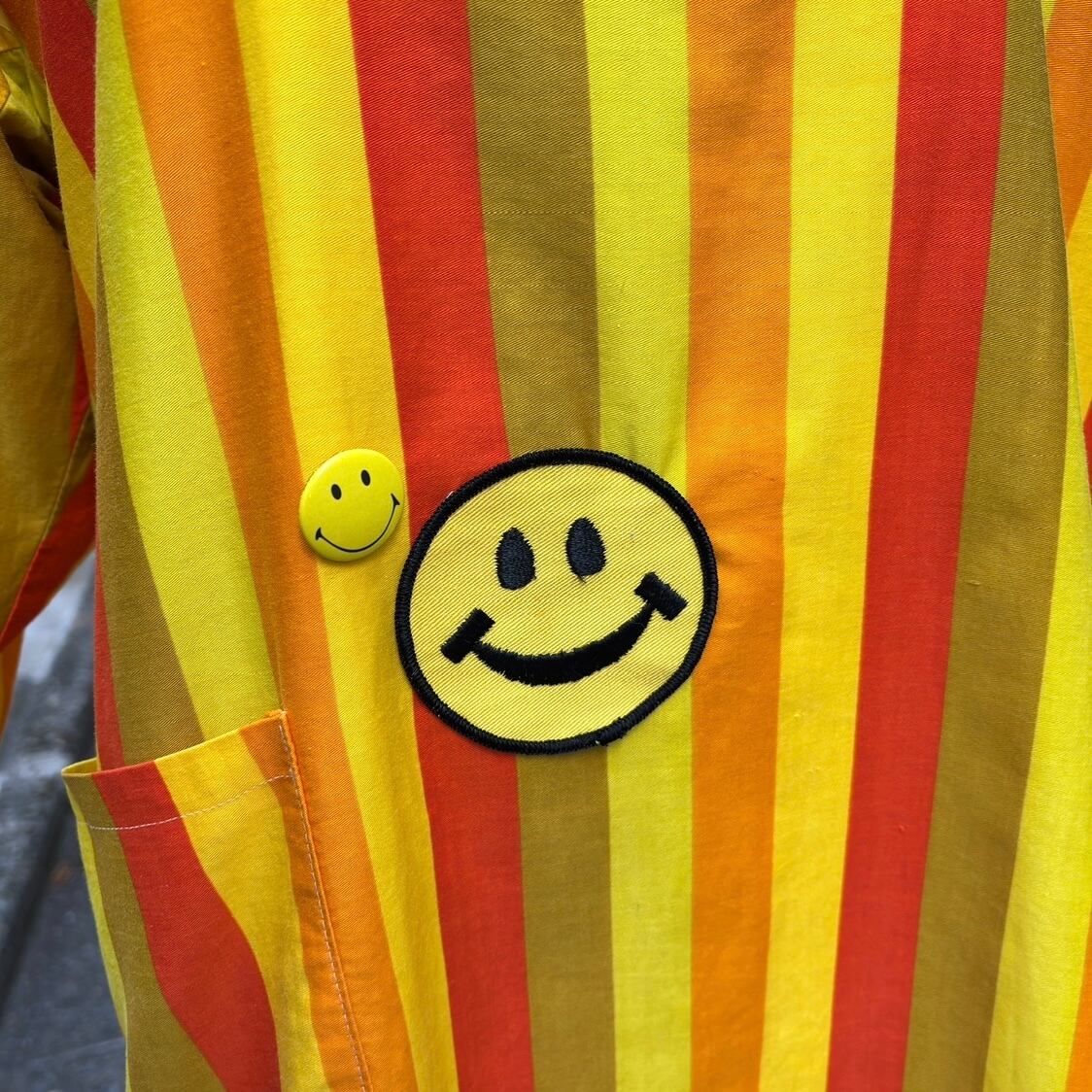70'S Vintage smile patch& tin badge multi stripe apron top。