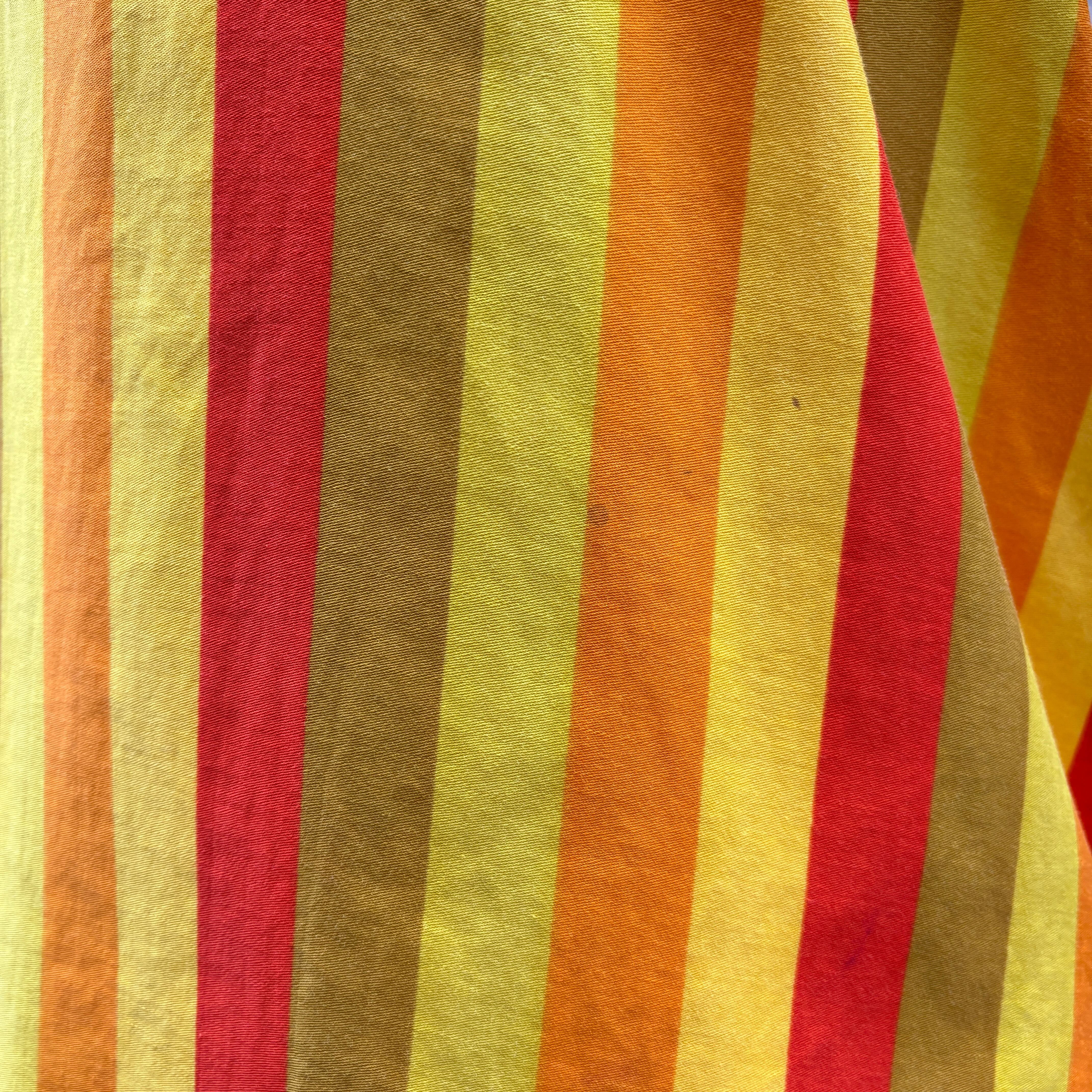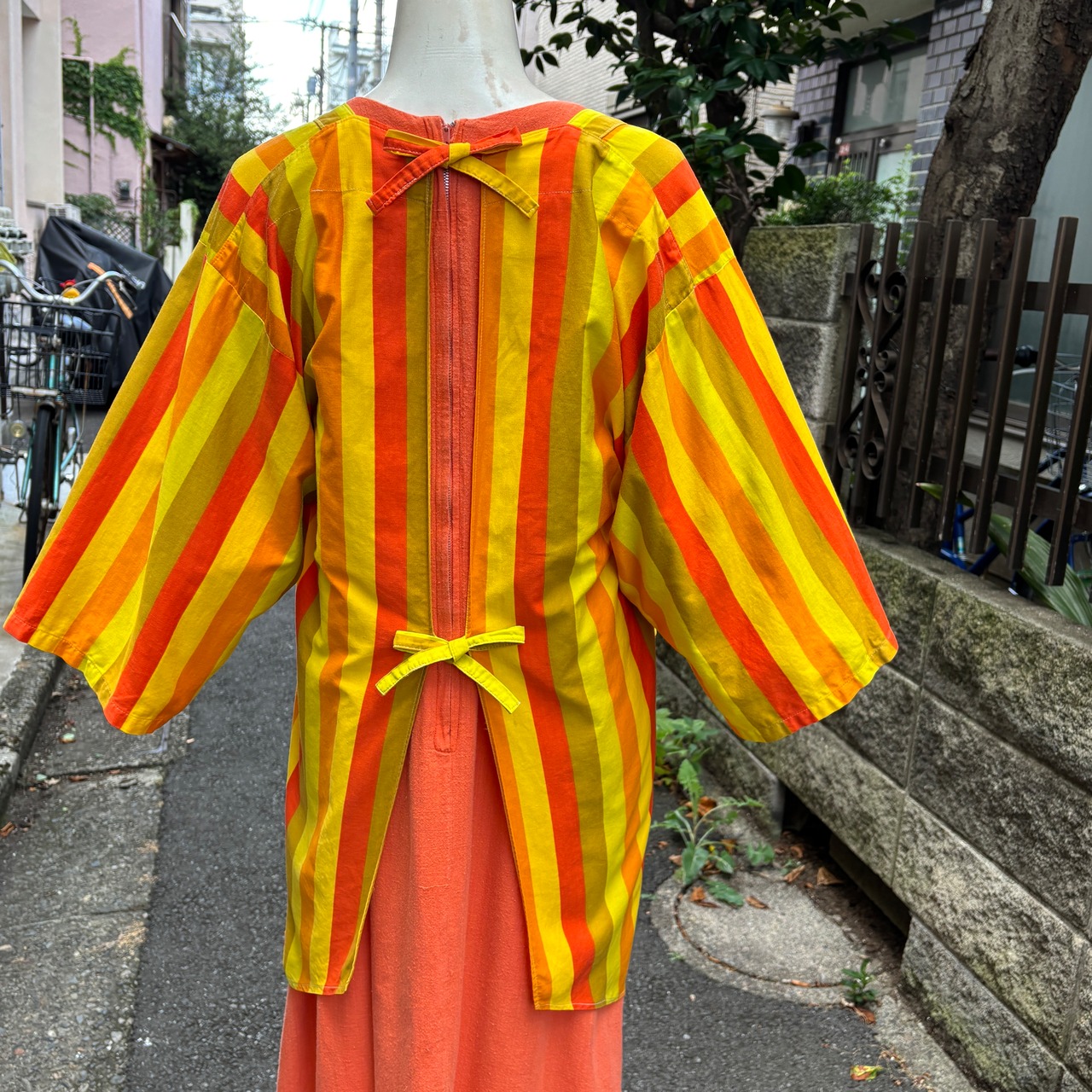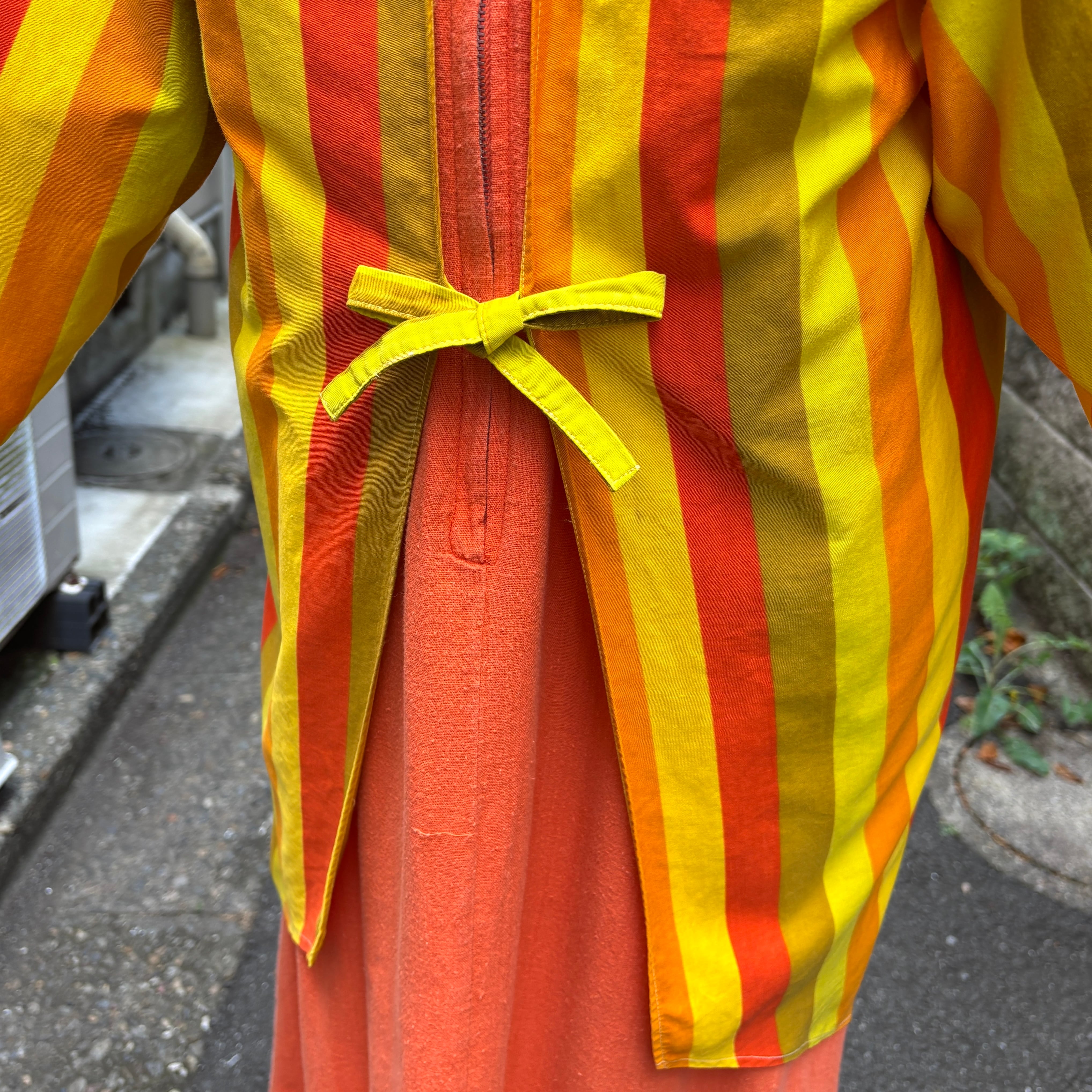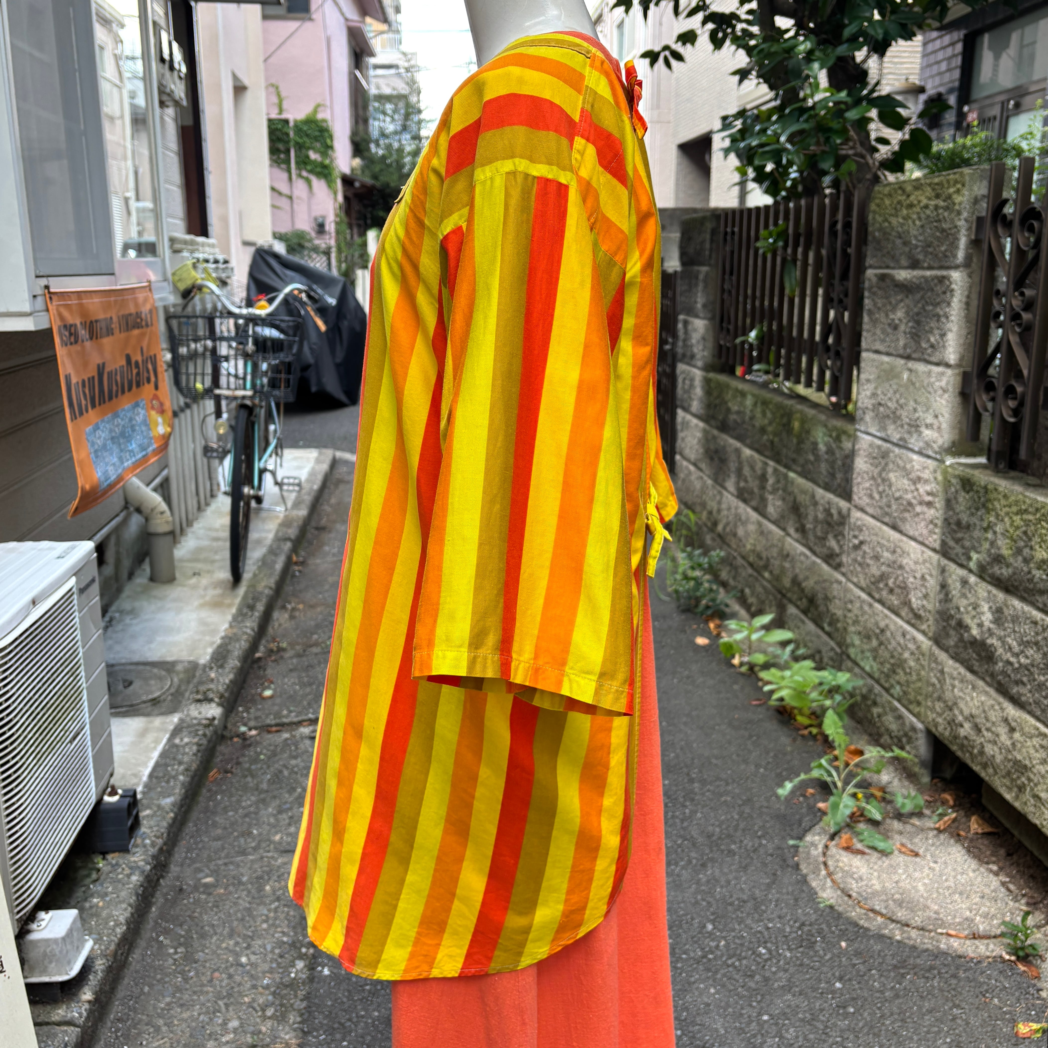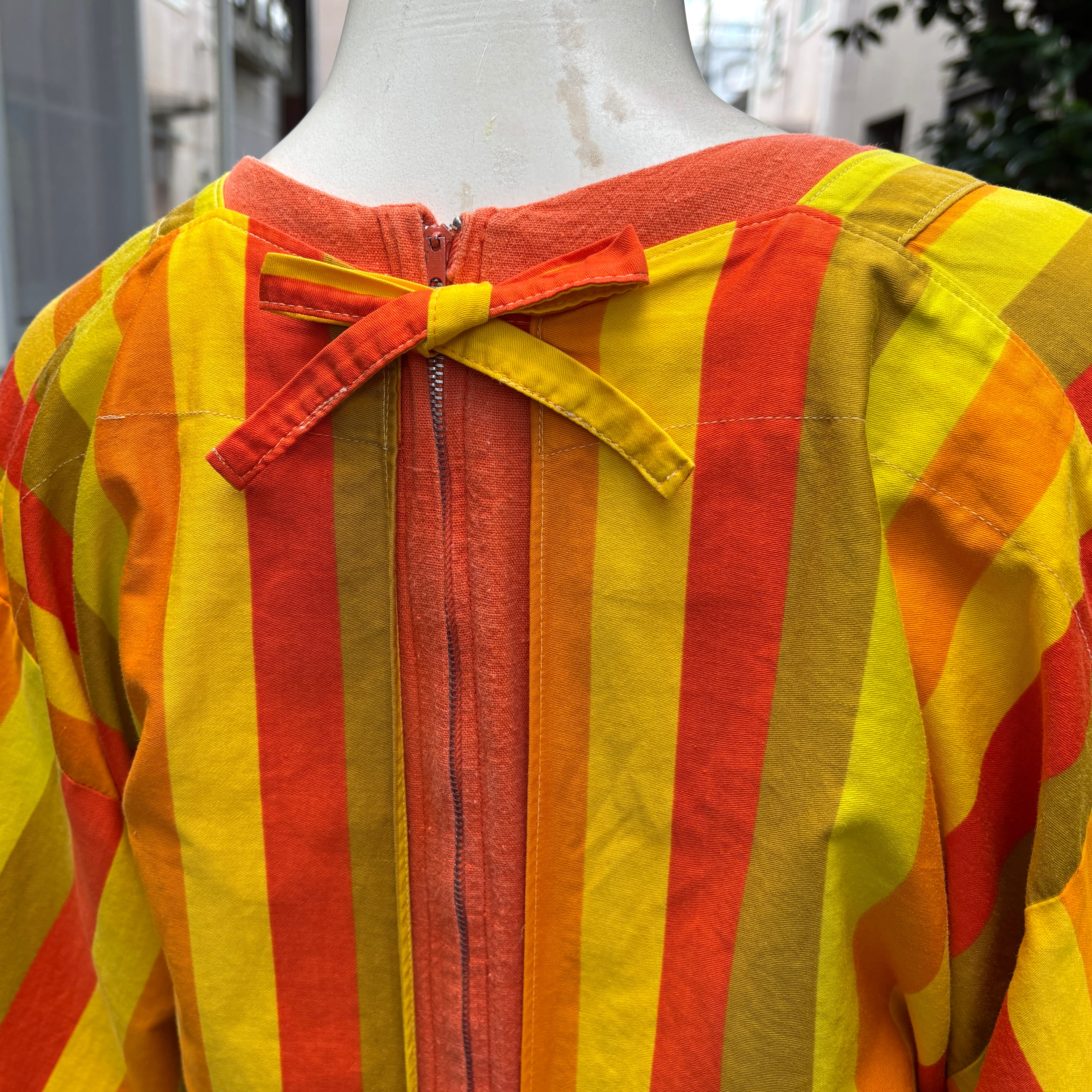 オレンジ、イエロー、カーキベースのマルチストライプがとっても可愛い1着です。
