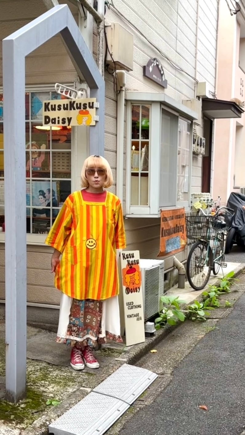 背面側でおりぼんを結ぶ割烹着スタイルのデザインや、ホールのリペアで施されたスマイルパッチや小さなスマイルの缶バッジも可愛いポイントです。