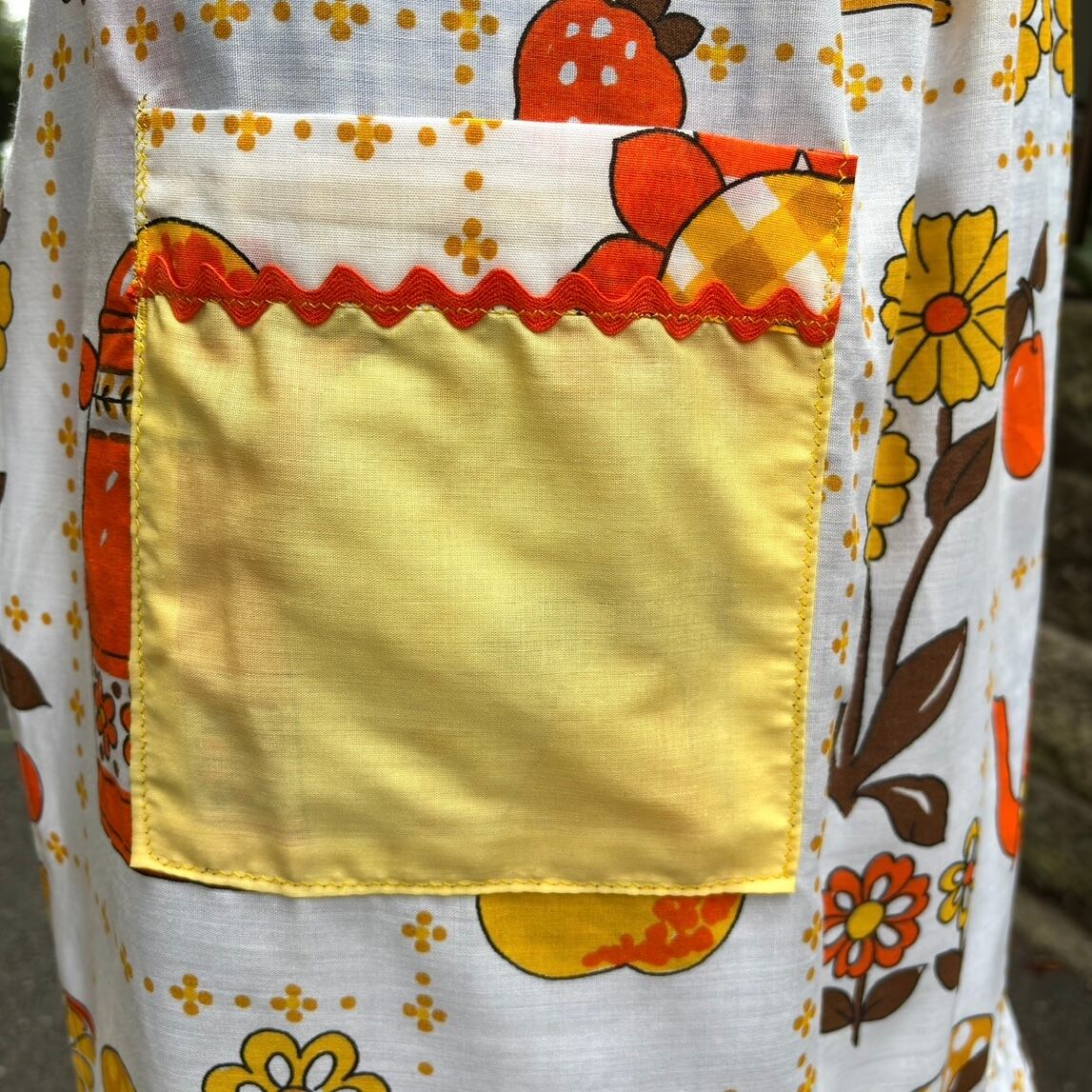 70年代 ヴィンテージ 当時のハンドメイド1点もの フラワー&フルーツ柄 エプロンです。