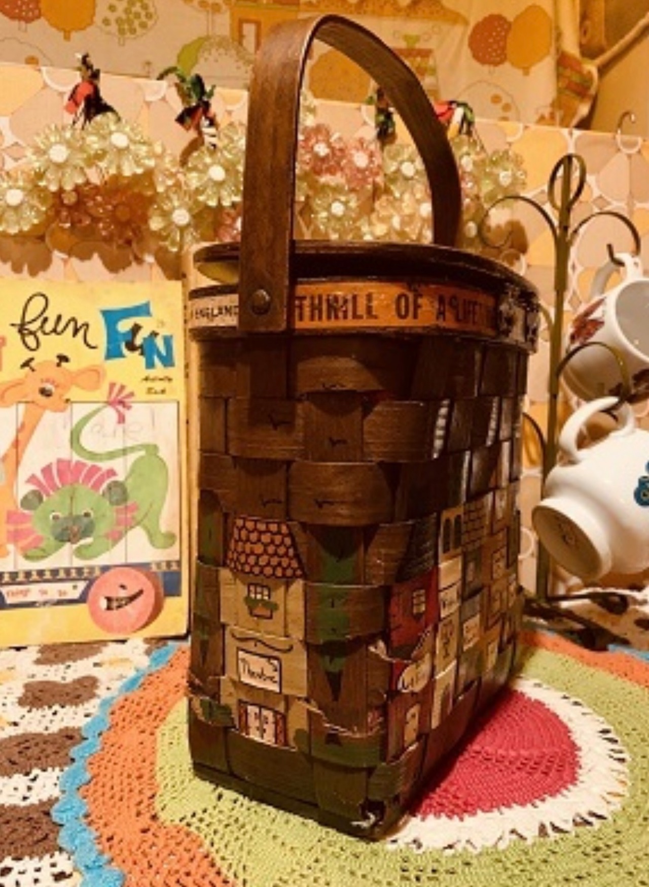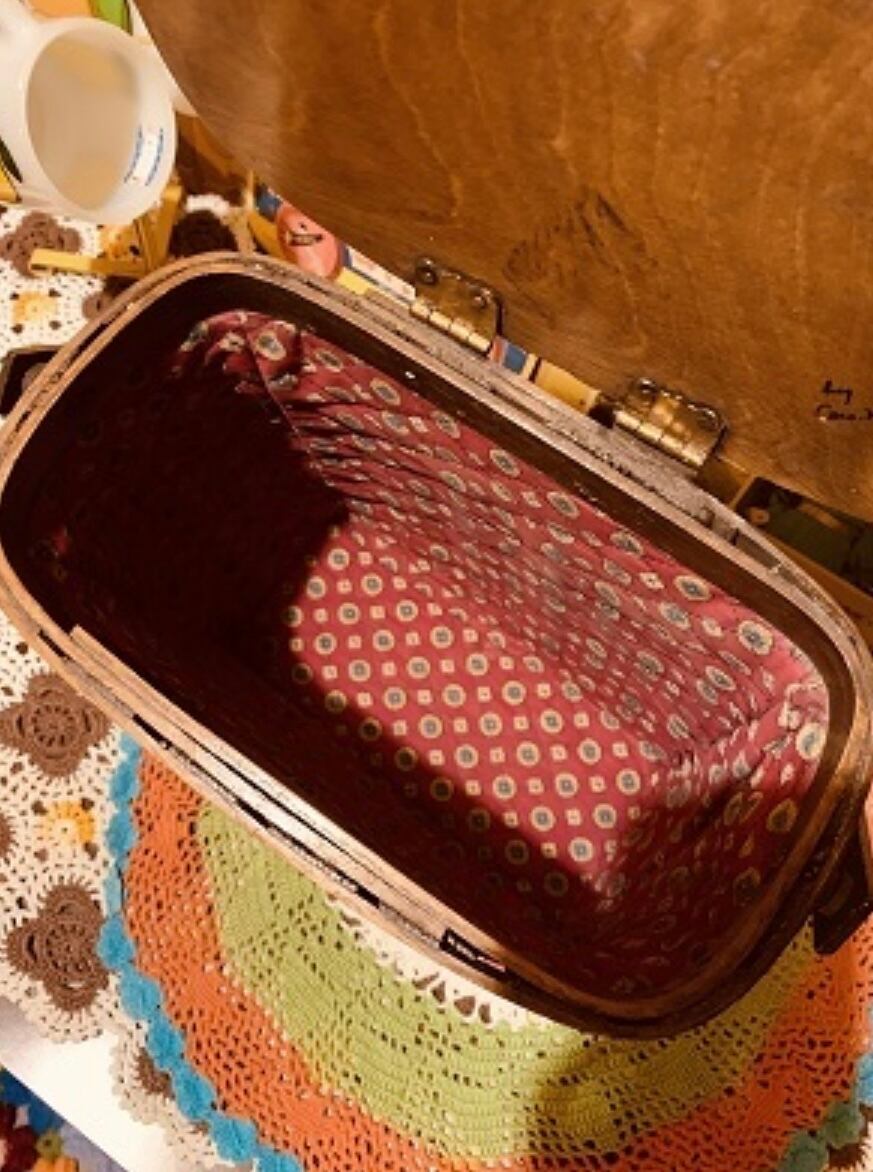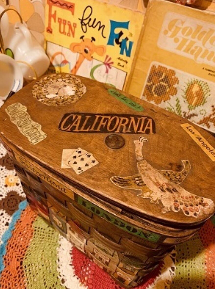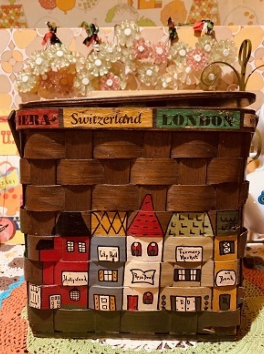 1950〜USA Vintage トラベルシリーズCaro-Nanバスケットです。カラフルな可愛い町並みがハンドペインで描かれた、アメリカでもコレクターズアイテムとして有名な木製のバスケットです。内側はFlower柄のキルトが貼られています。蓋には当時のペニー硬貨が付けられており1点1点違うデザインが施されています。蓋の内側にはCaro-Nanのサインが入っています。古いアイテムの商品の為、蓋の閉まり、蓋やバスケットの下の部分に剥がれや欠けなどが見られる為その分お値段を考慮しております。ご使用に支障は無いかと思います。