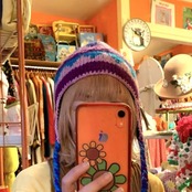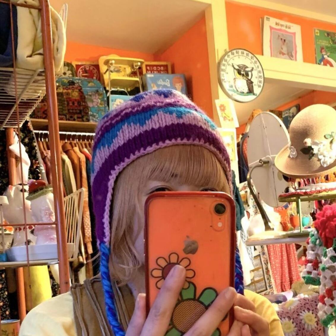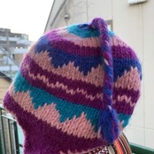 パープル、ブルーベースのカラフルな編み目や耳当て付きのデザインがとっても可愛いです。