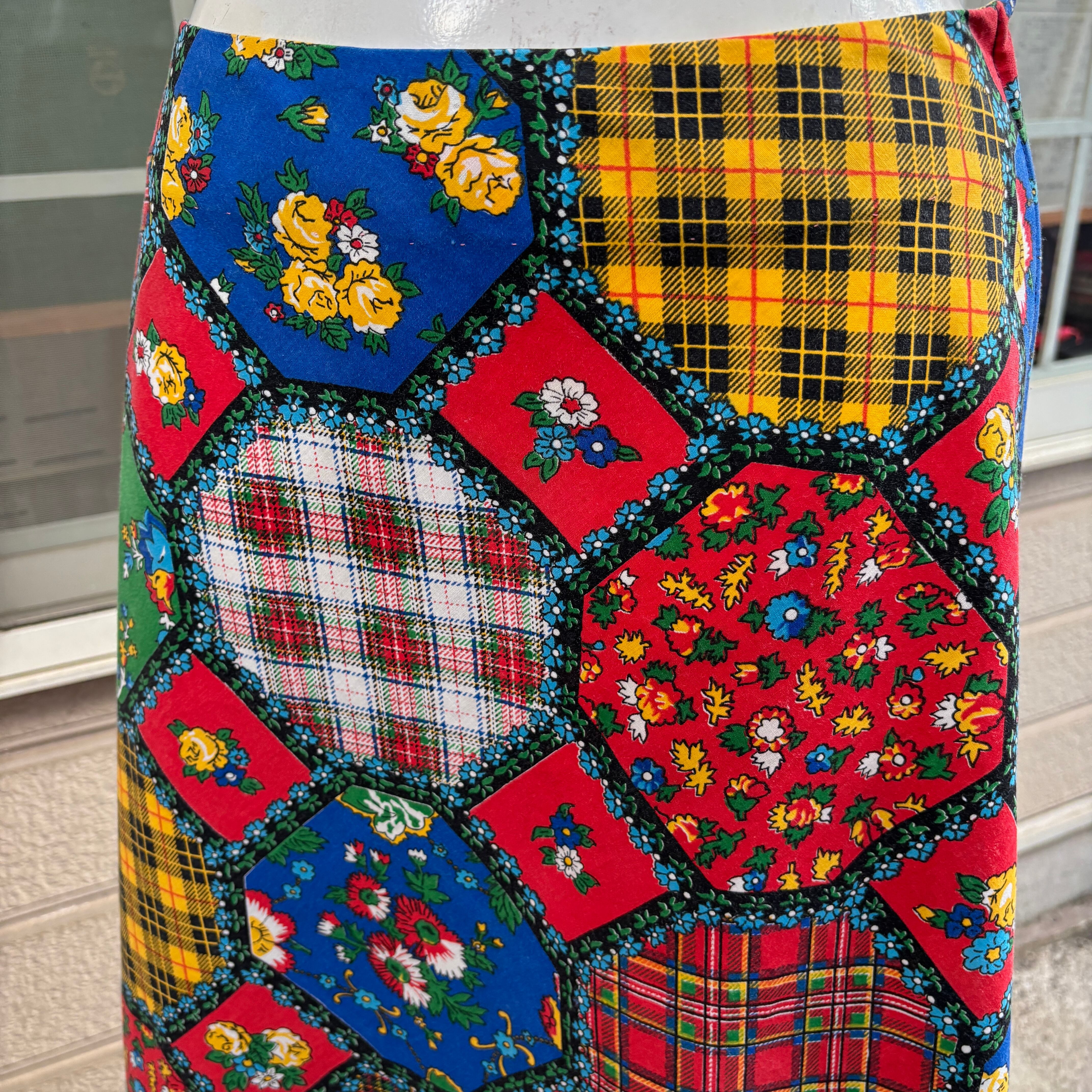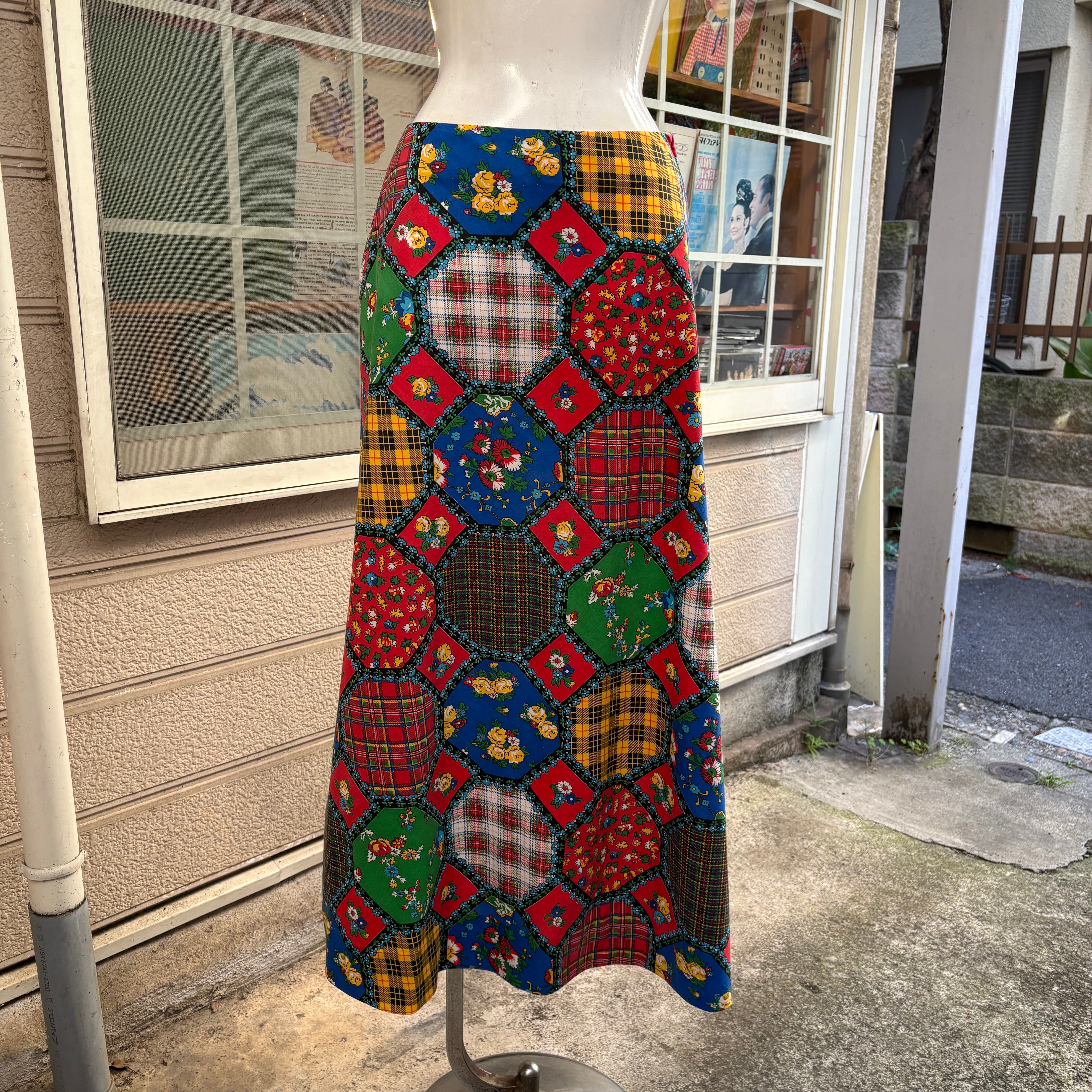70年代 ヴィンテージ 当時のハンドメイド1点もの チェック&フラワー オクタゴンパッチワークプリント スカートです。
