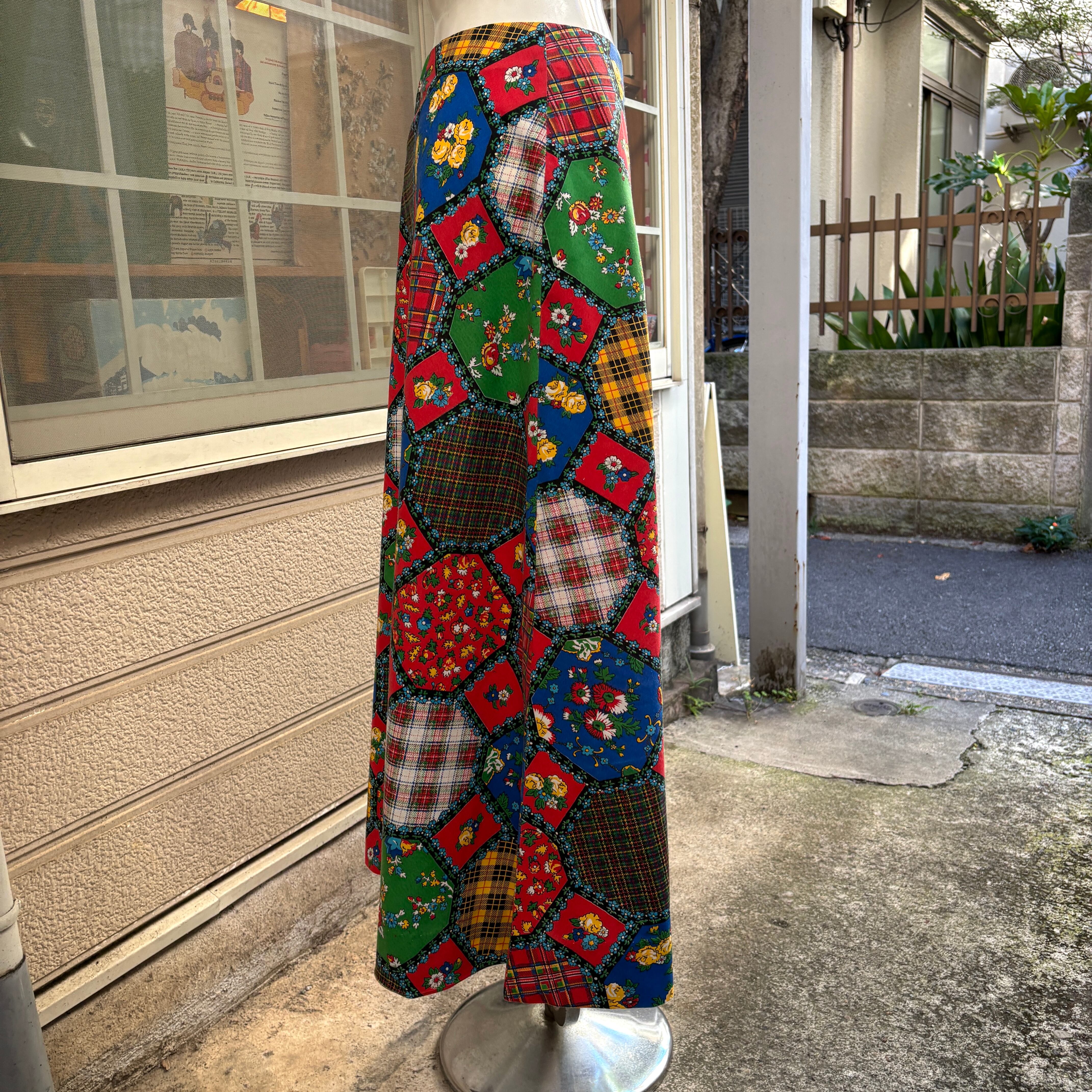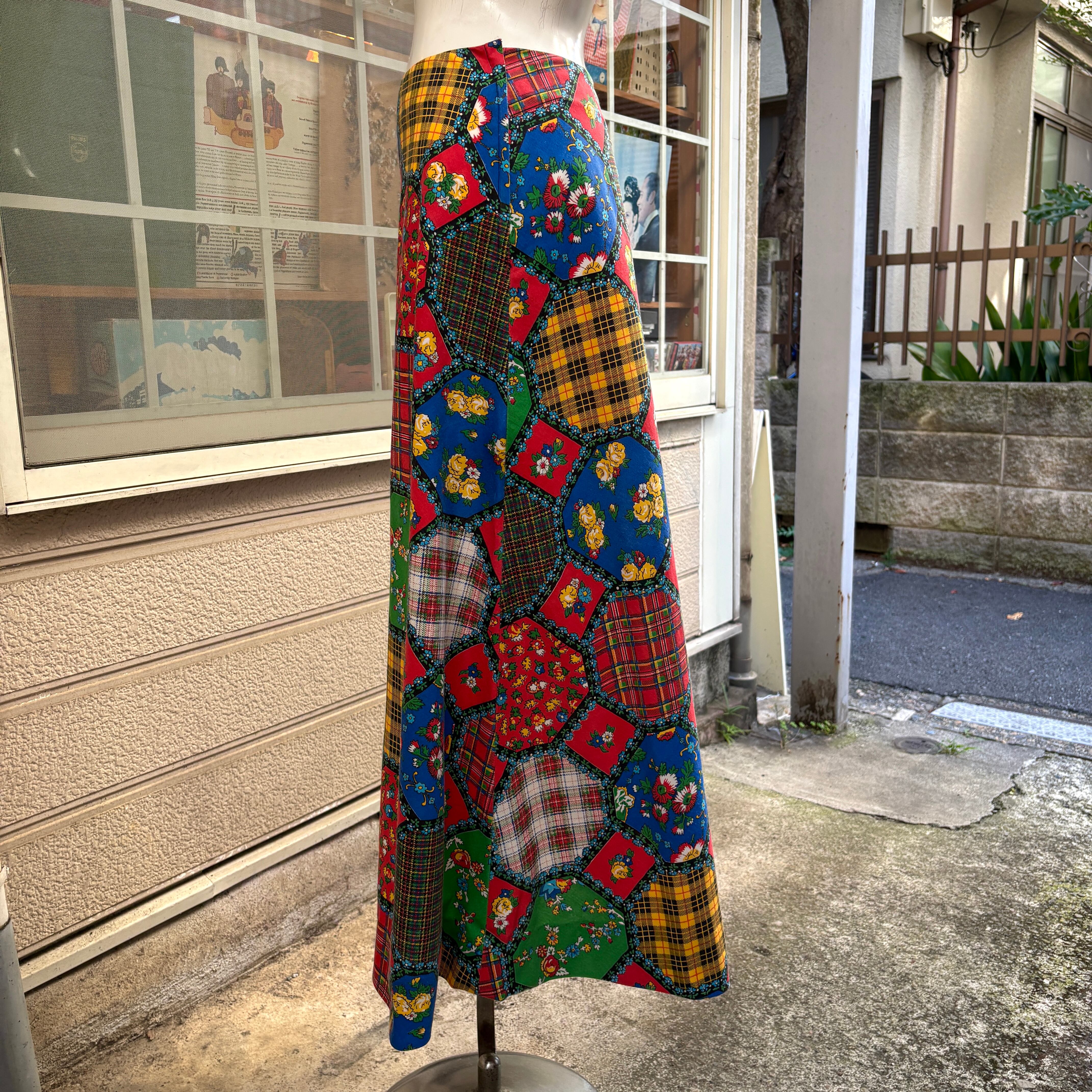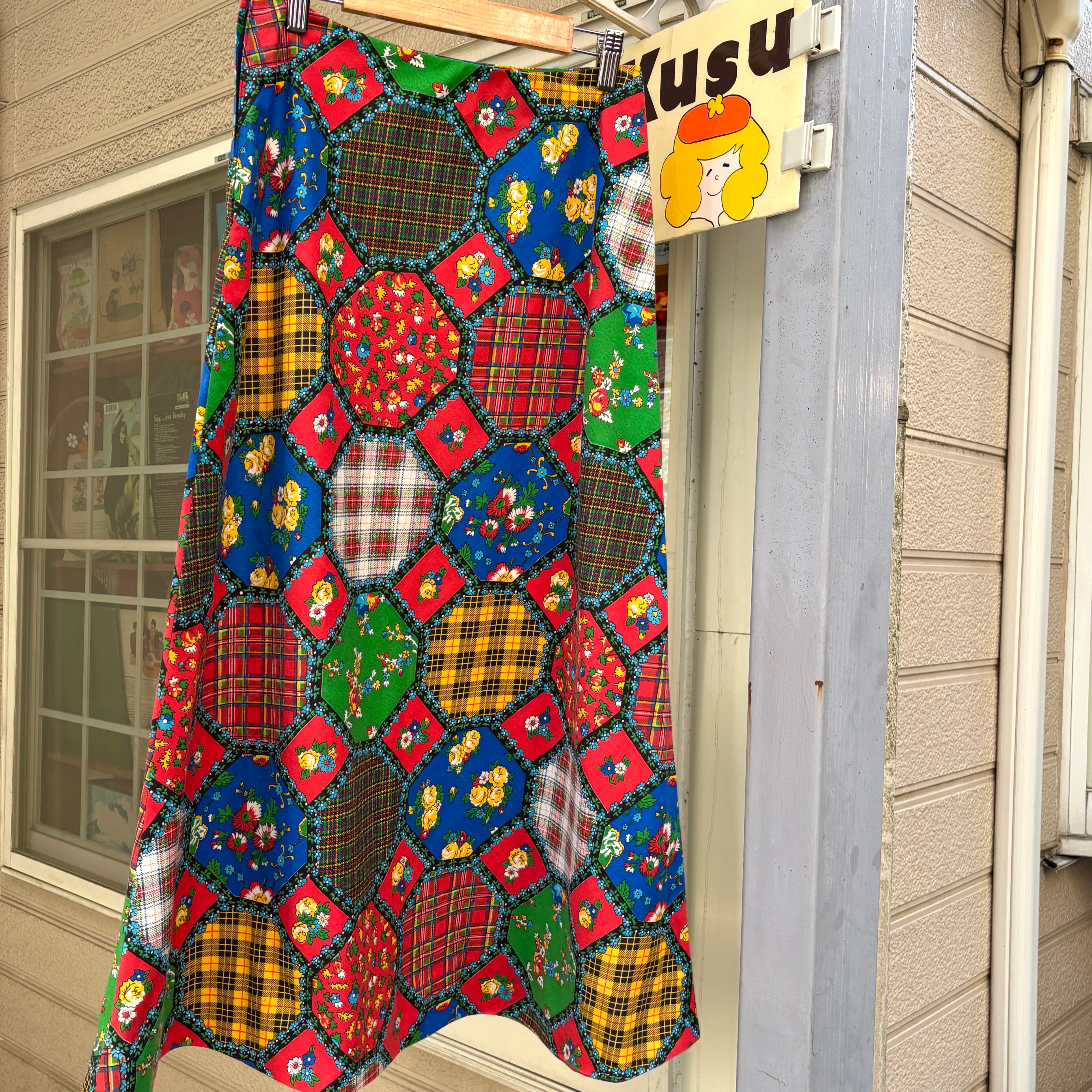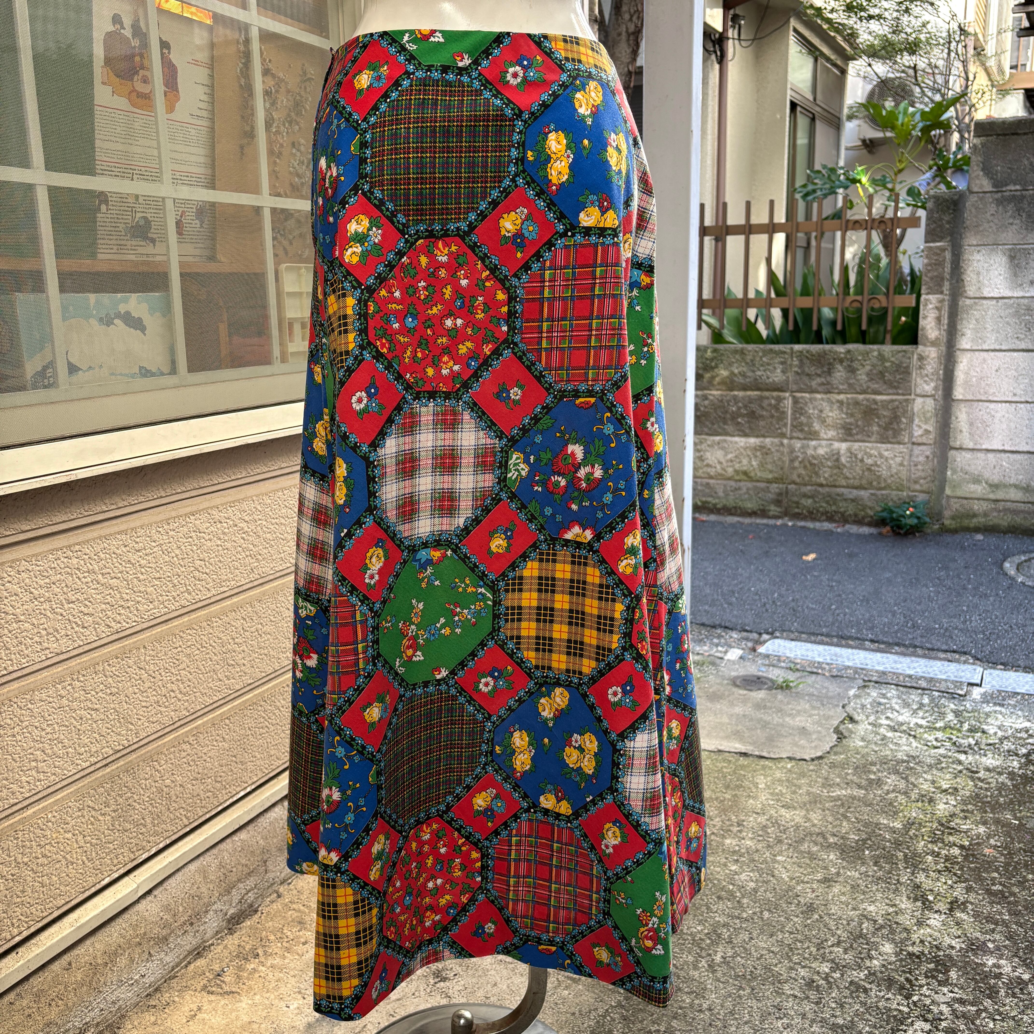 70'S USA Vintage madras check&flower octagon patchwork print skirt。