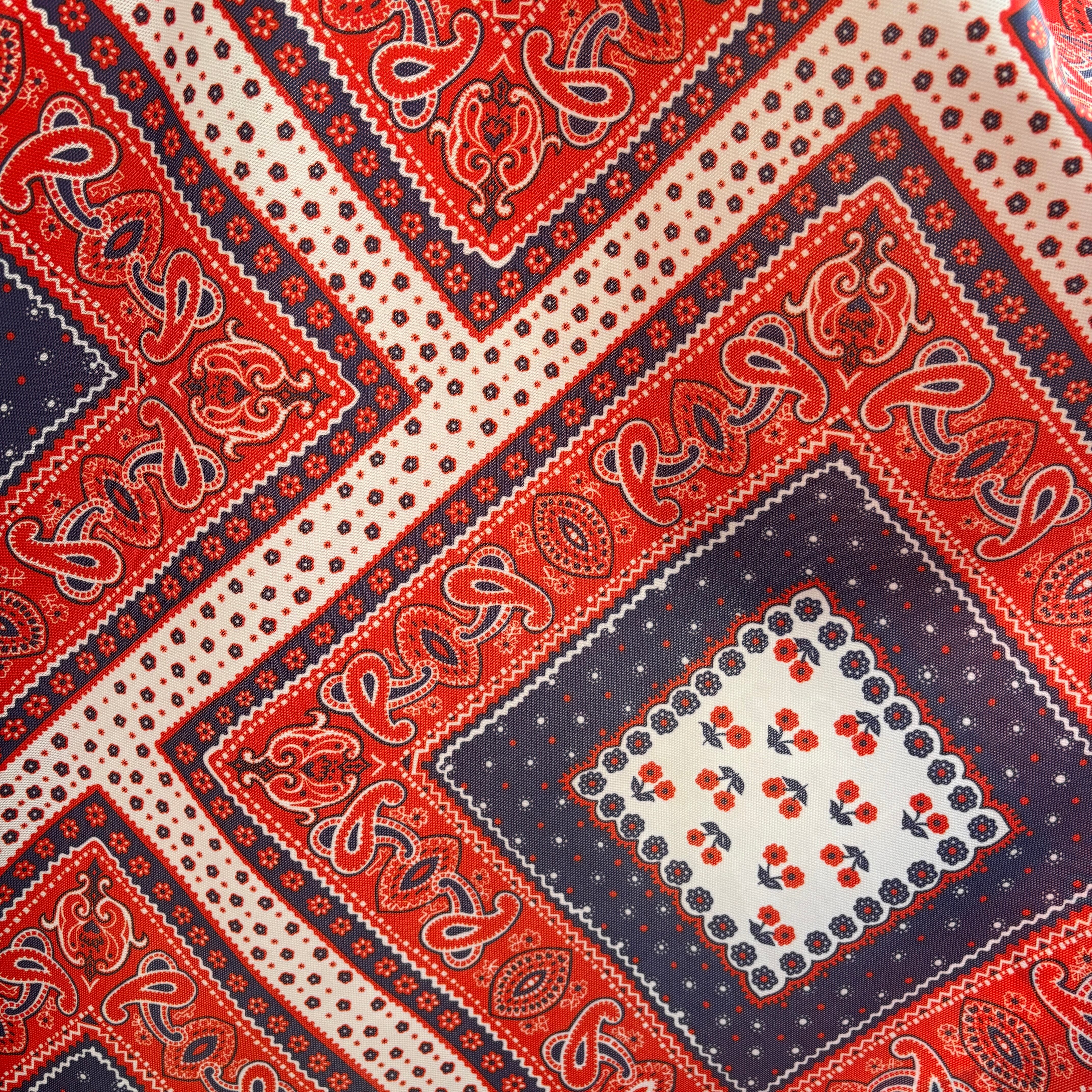 サクランボのようなフラワープリントやペイズリー柄のバンダナが連なりあうようなデザインがとっても可愛いです。