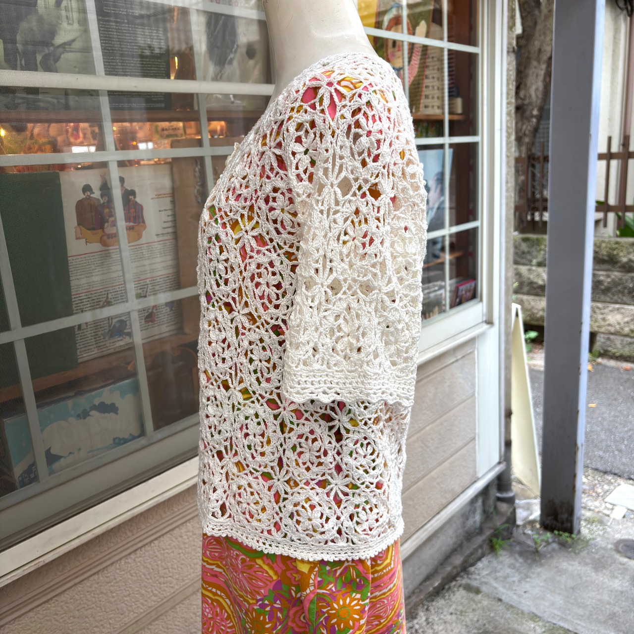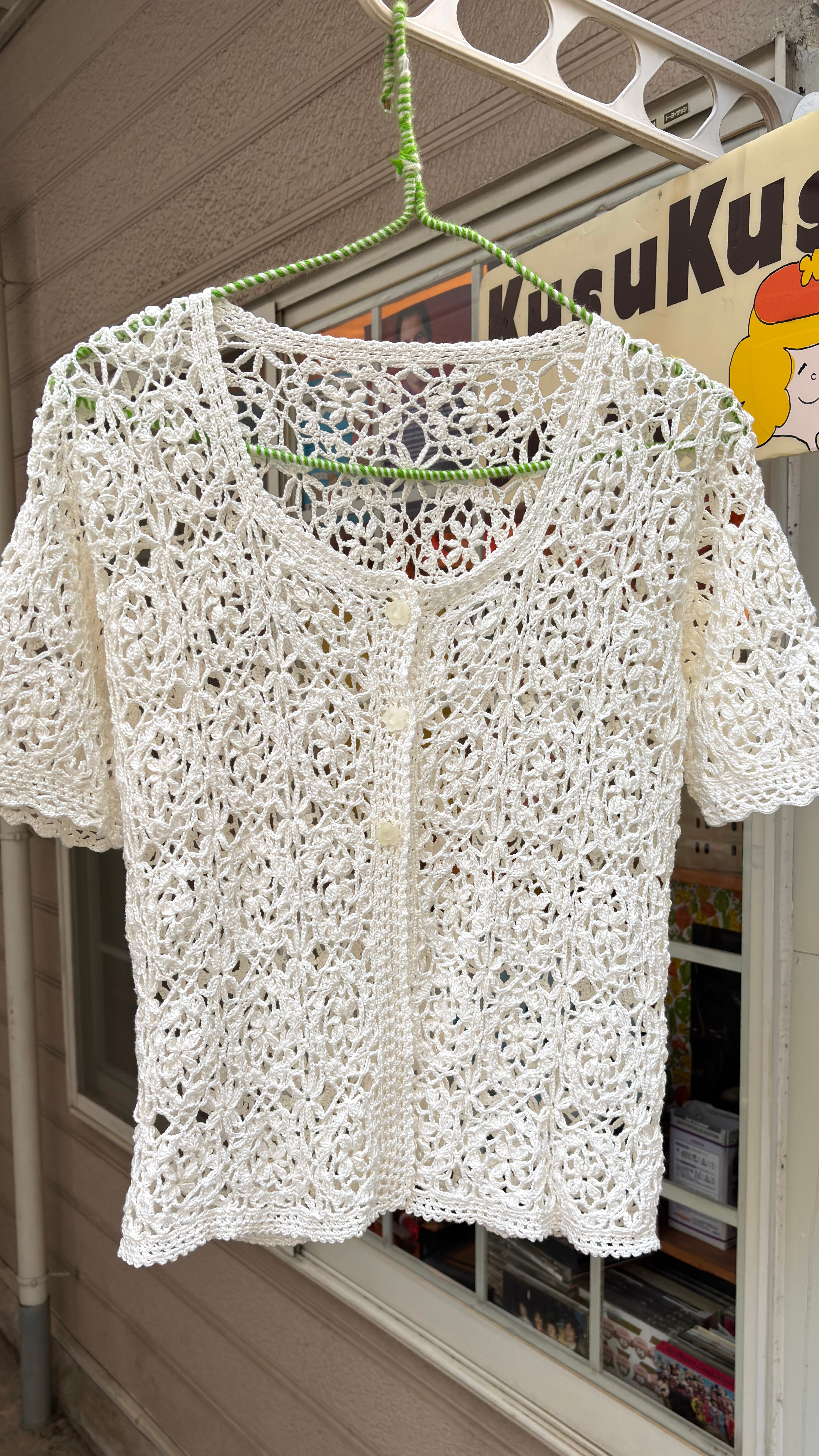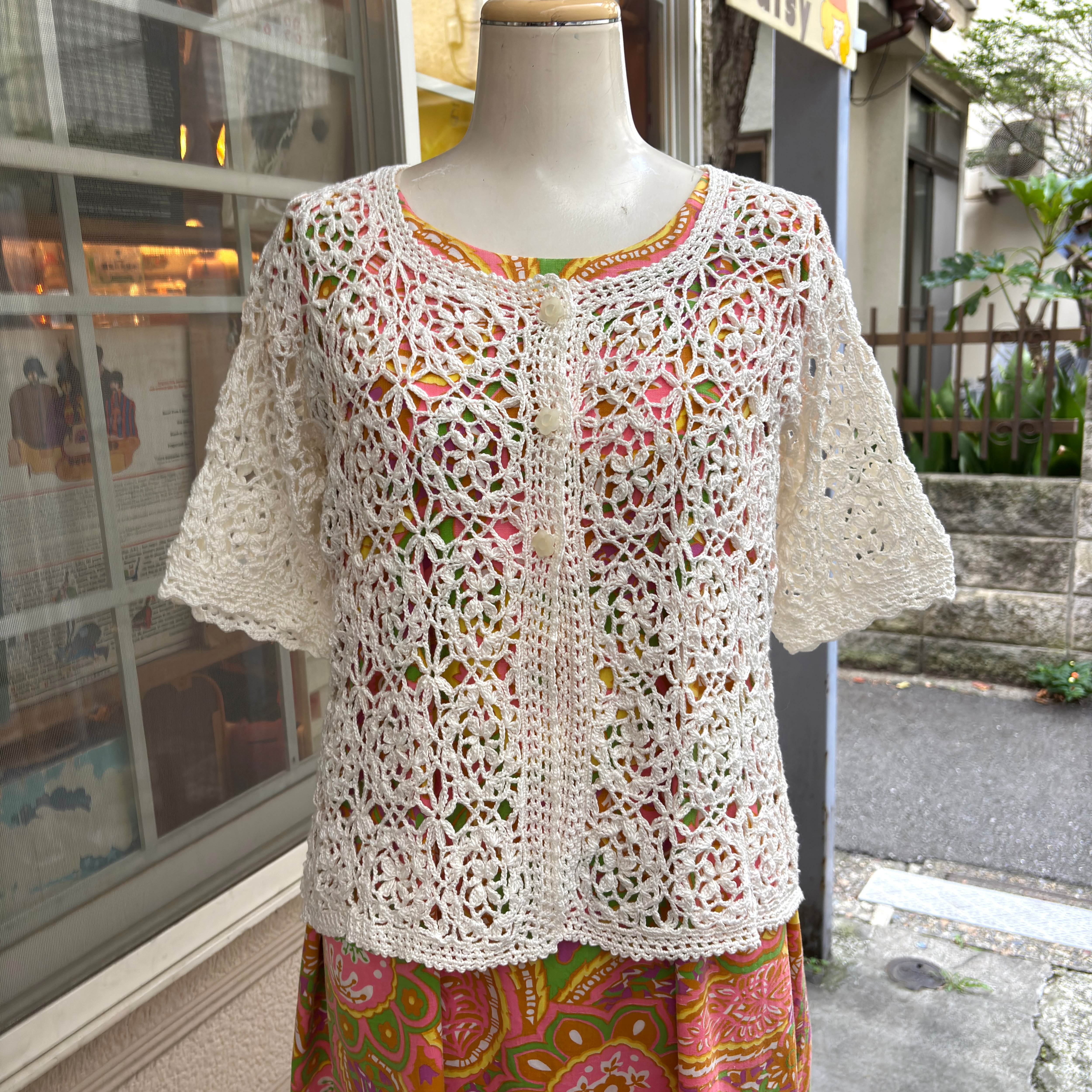 80'S〜90'S USA Vintage flower motif&button Crochet short sleeve cardigan。