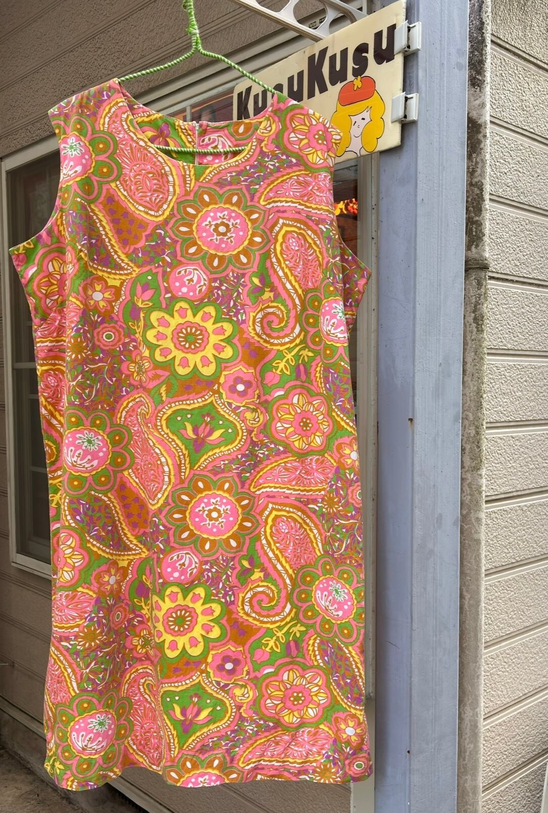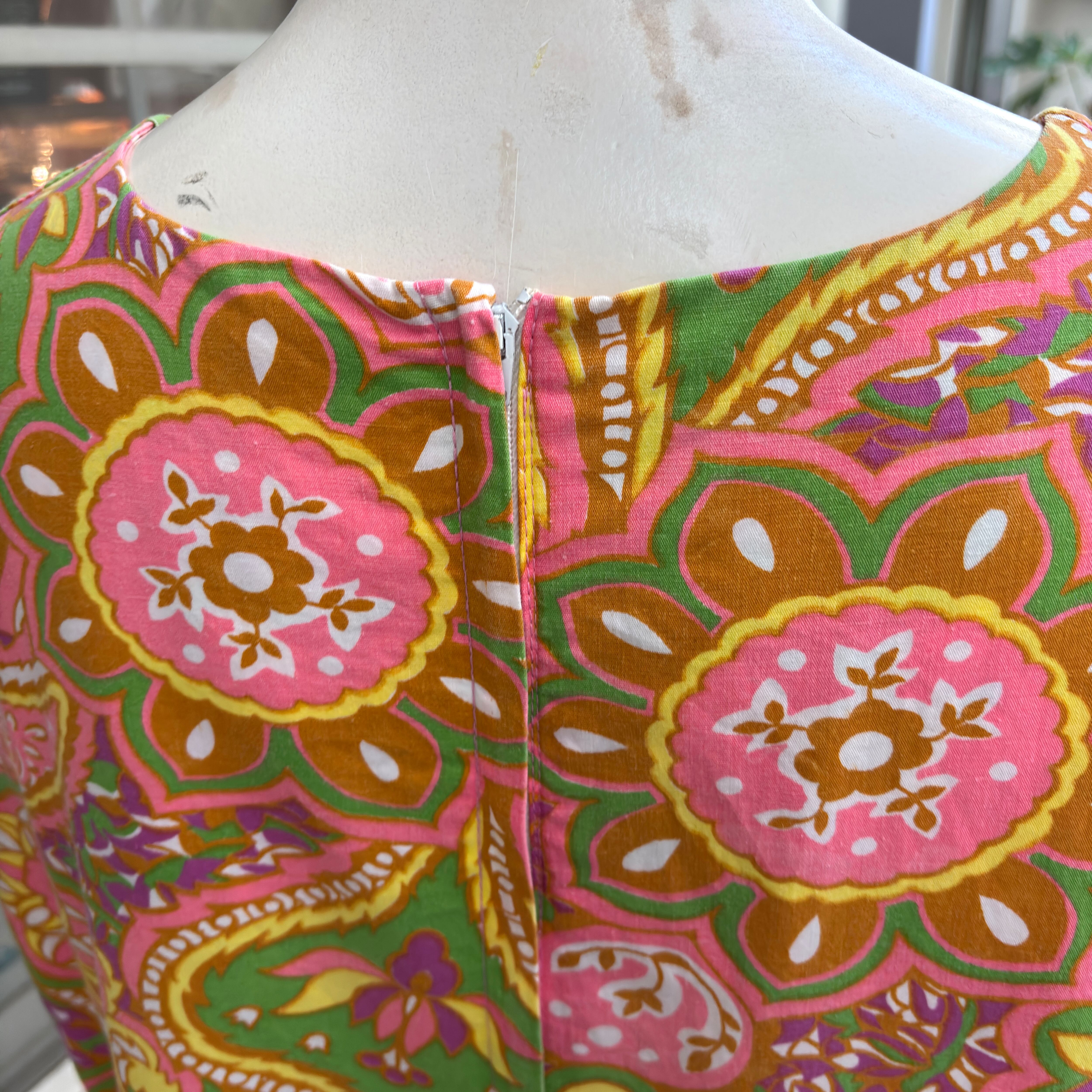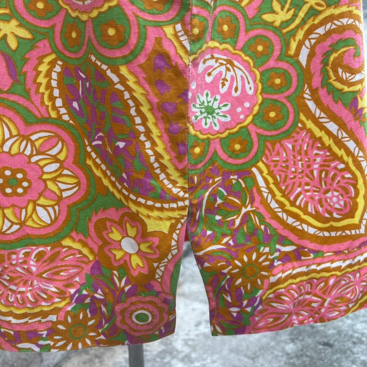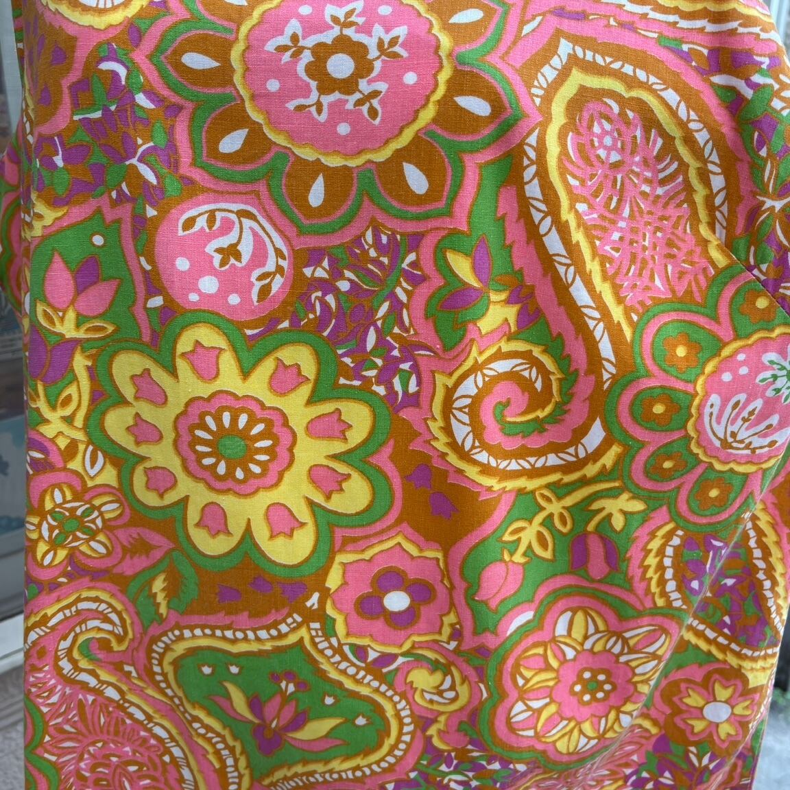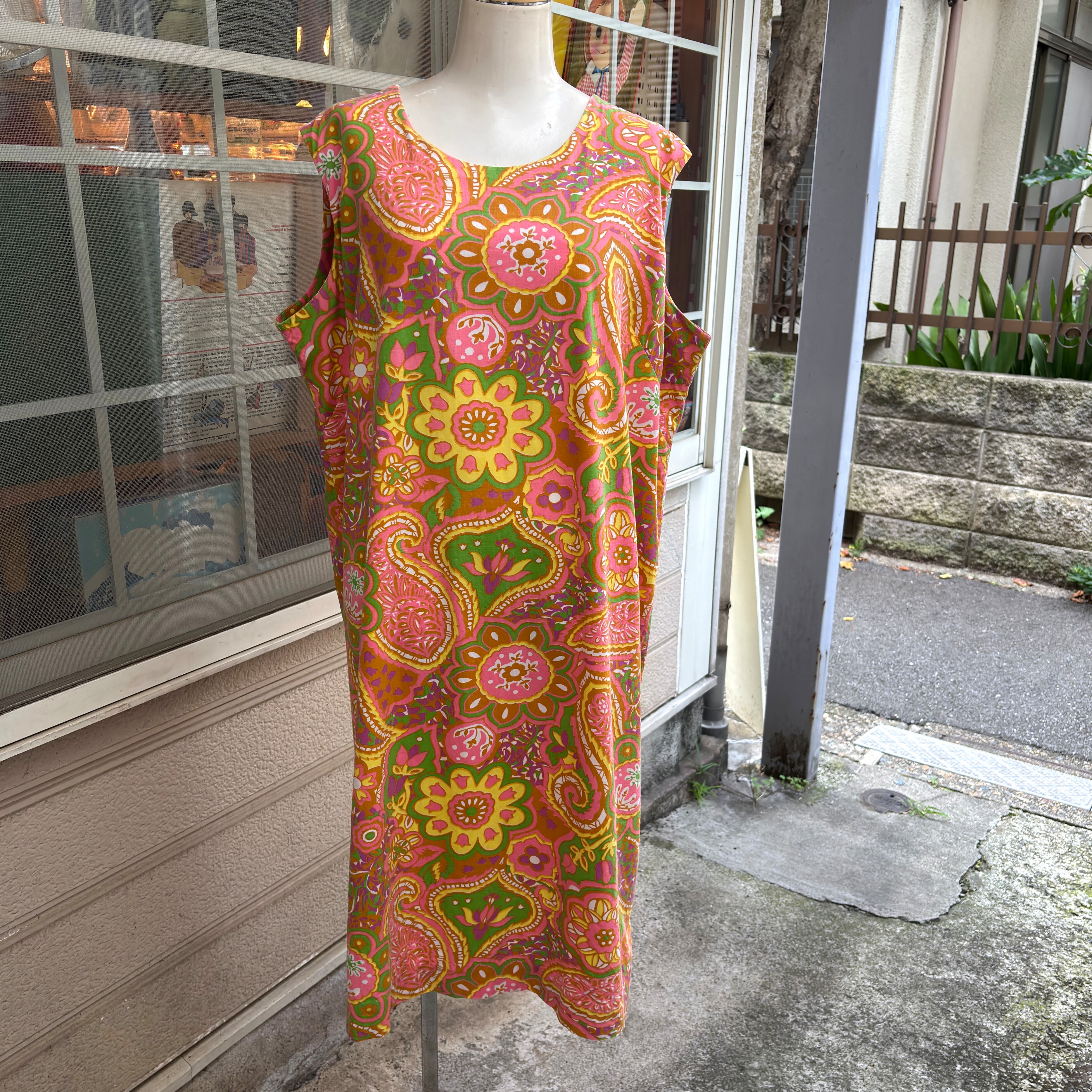 ヴィンテージ ならではな発色のピンクベースにイエロー、ライトグリーン、カーキ、ホワイト、ピンクパープルのライトなカラーリングやポップでサイケなペイズリーやフラワー模様がとっても可愛い1着です。