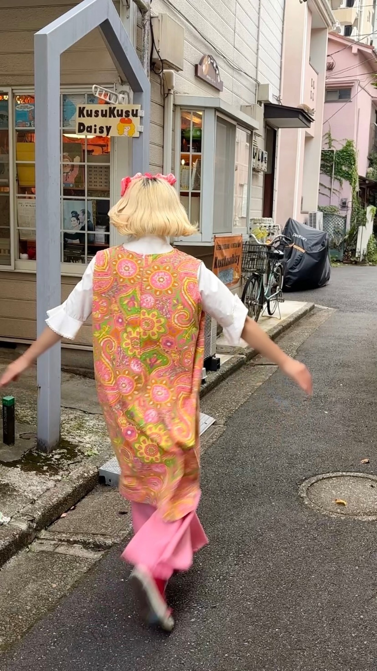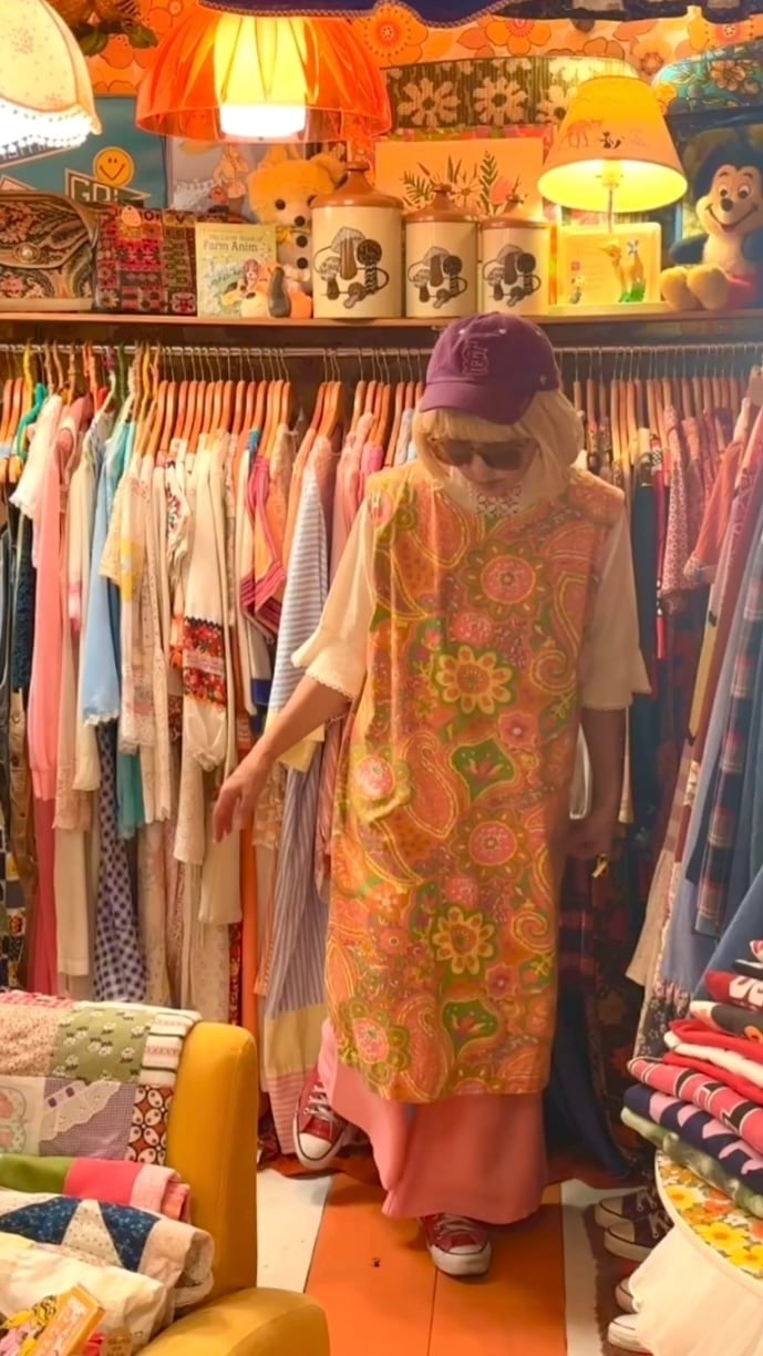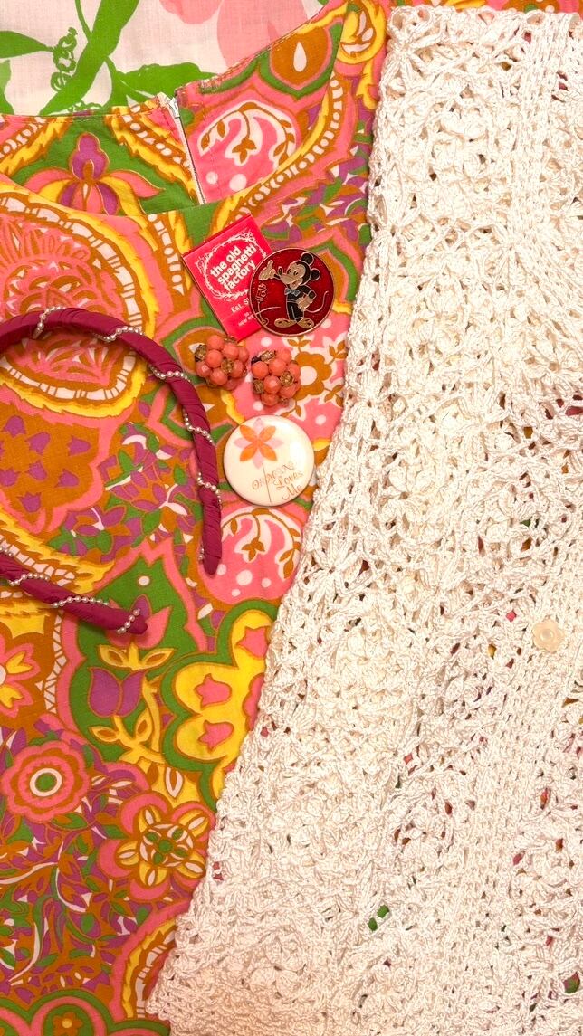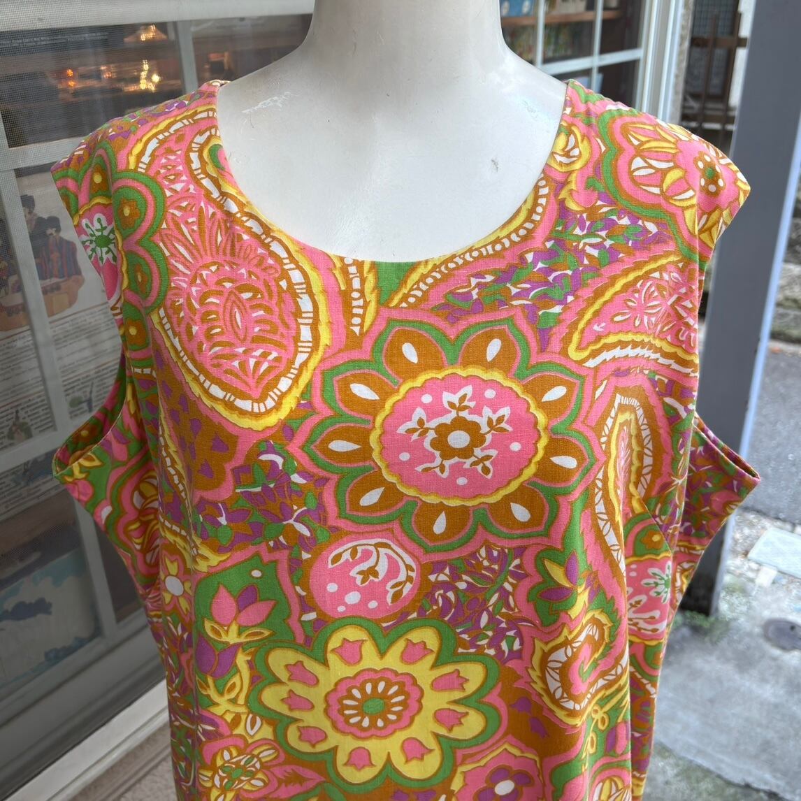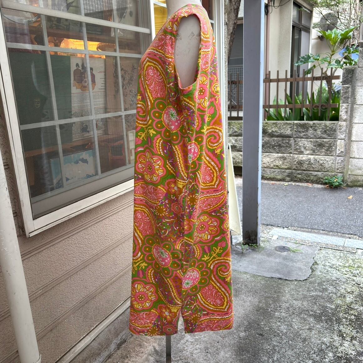 ヴィンテージ ならではな発色のピンクベースにイエロー、ライトグリーン、カーキ、ホワイト、ピンクパープルのライトなカラーリングやポップでサイケなペイズリーやフラワー模様がとっても可愛い1着です。