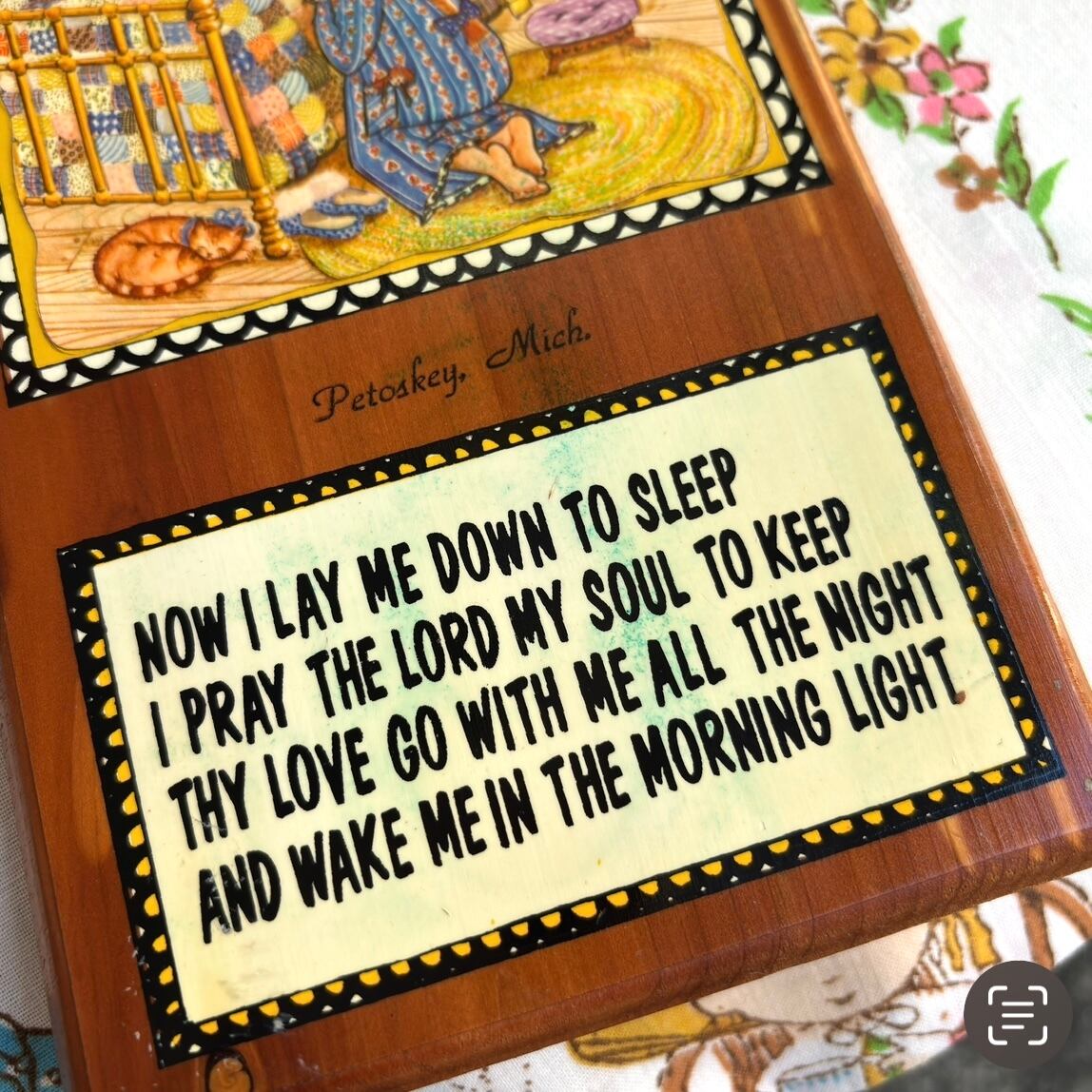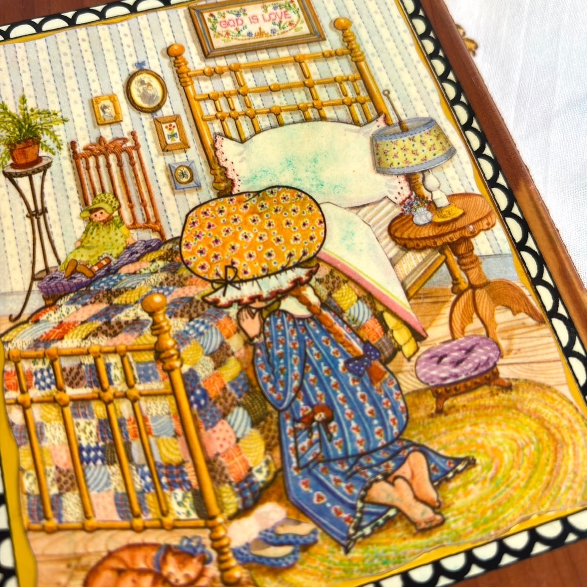 面取りの施された木製のプレートに当時のハンドペイントやプリントの額絵のようなホリーホビーの絵柄やメッセージがとっても可愛いアイテムです。