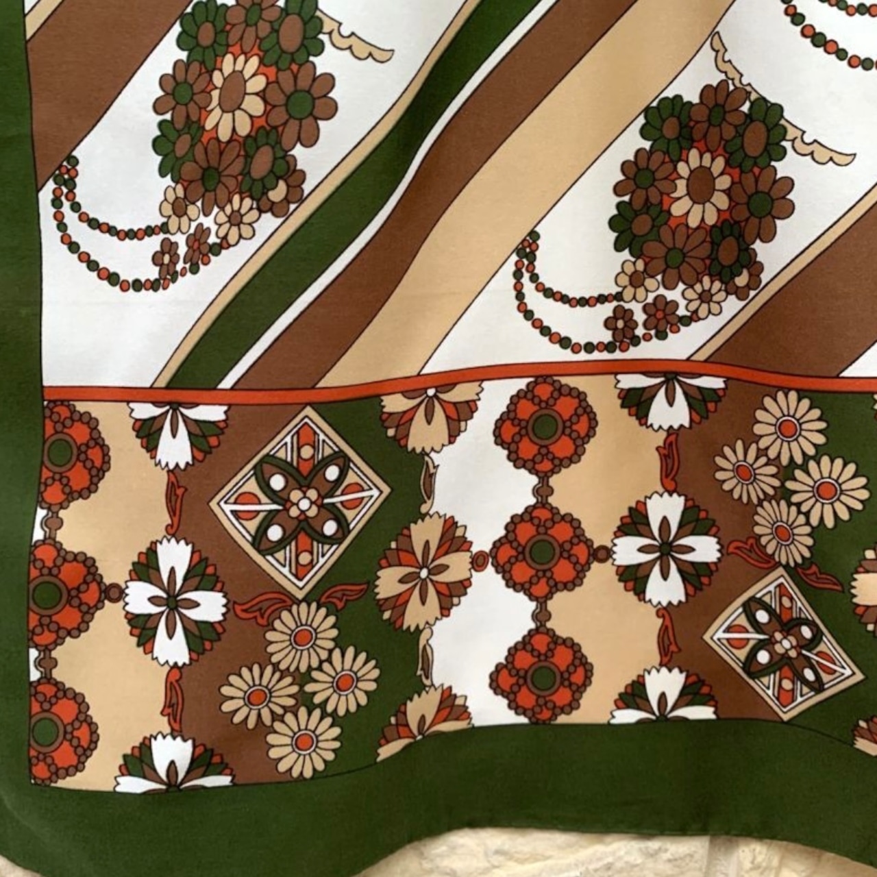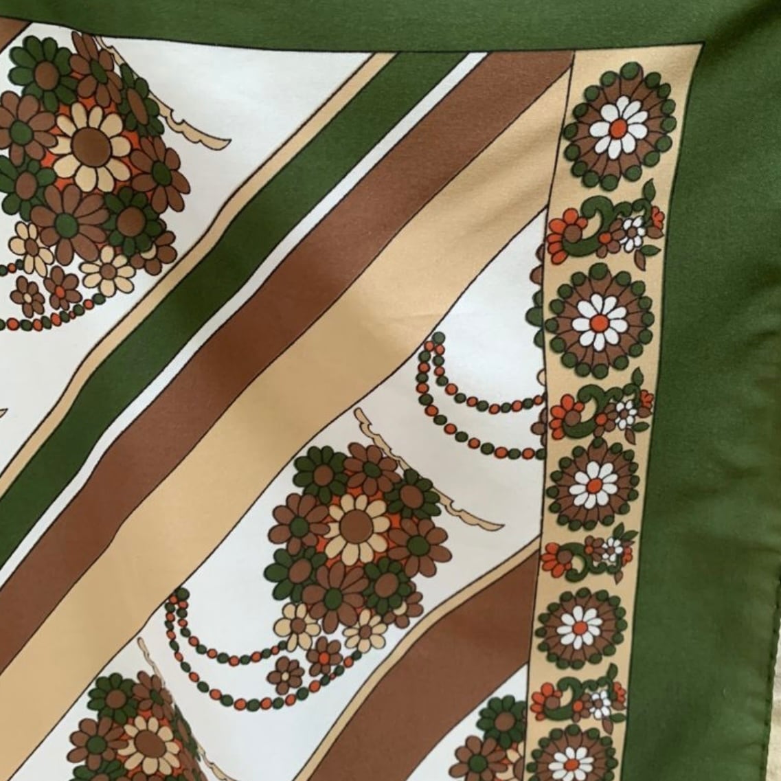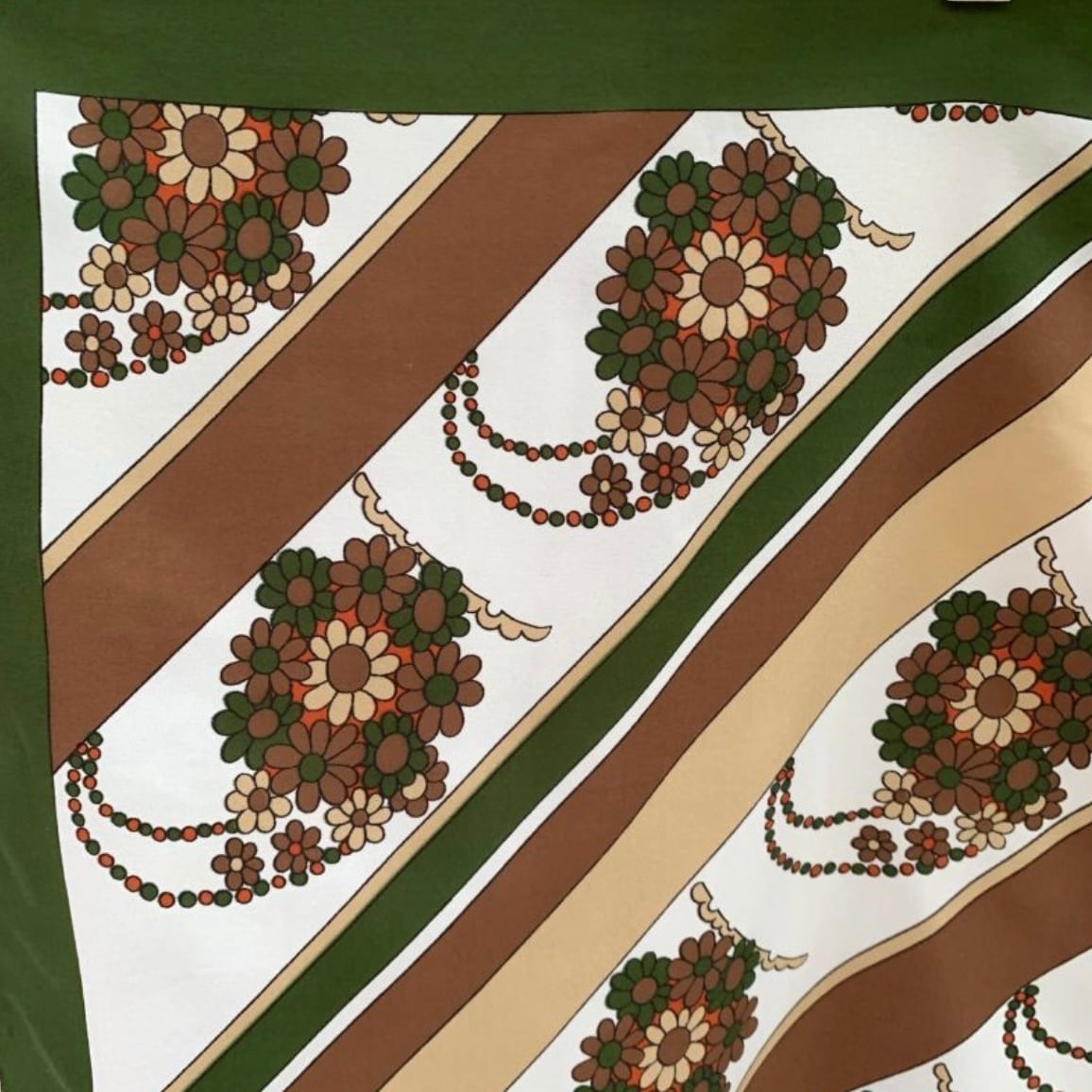 グリーン、ブラウン、ベージュ、オレンジのカラーリングやレトロなフラワー柄がとっても可愛いデザインです。