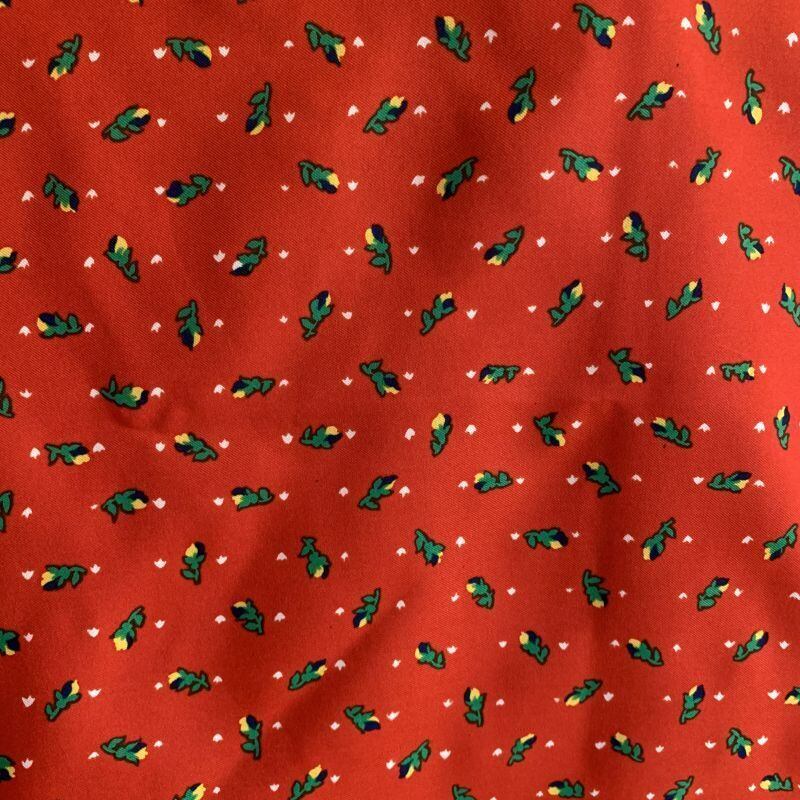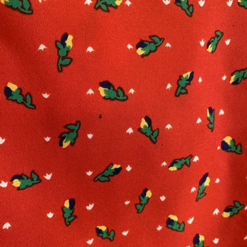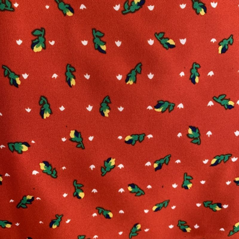 レッドベースにネイビー、ホワイト、イエローのラインやホワイトの小さなリーフ模様、ネイビーイエローのつぼみ柄がとっても可愛いです。