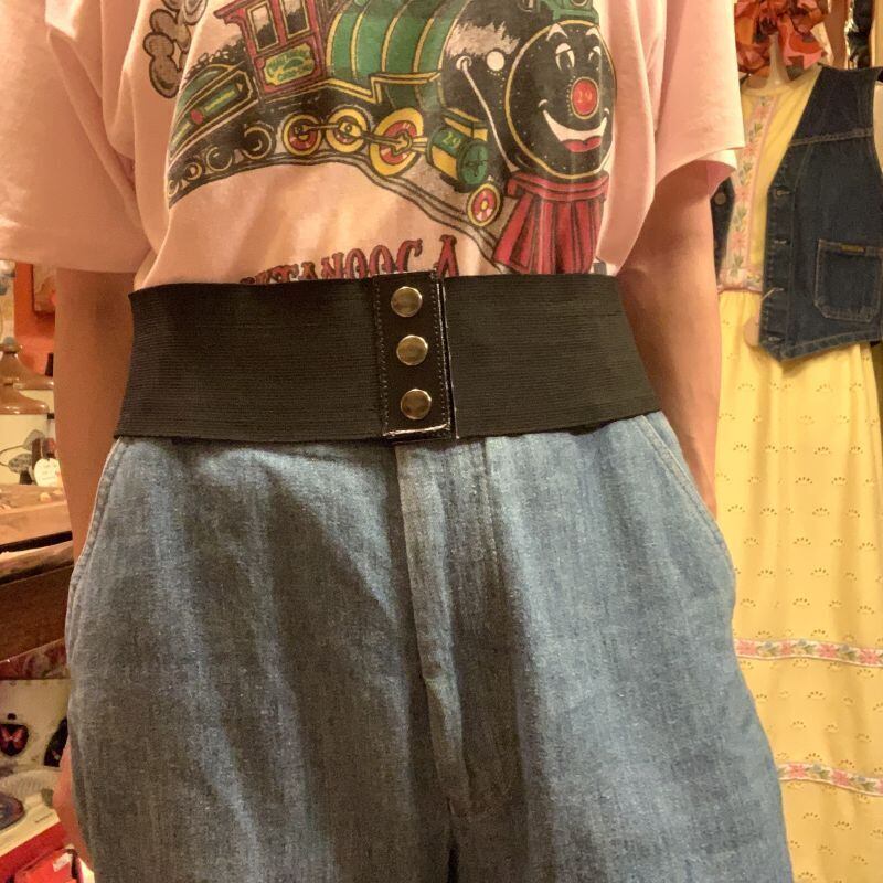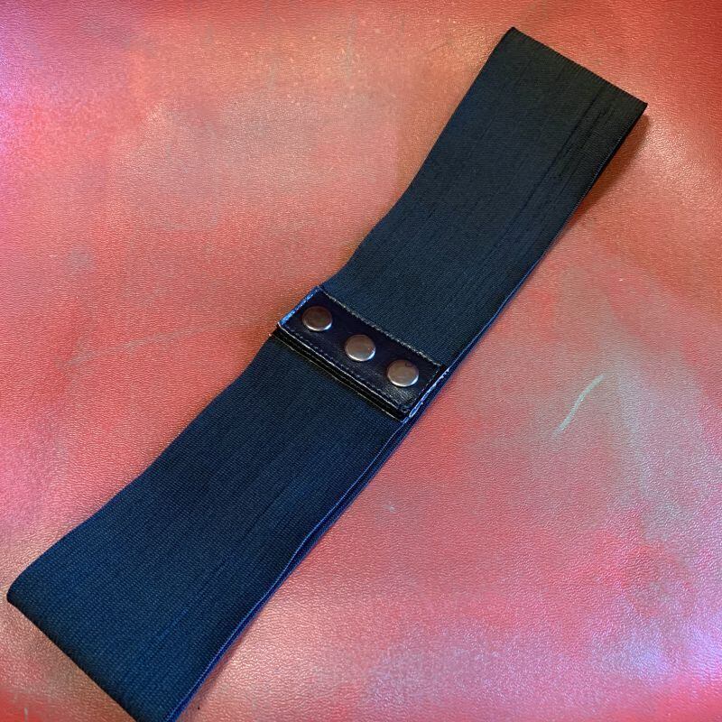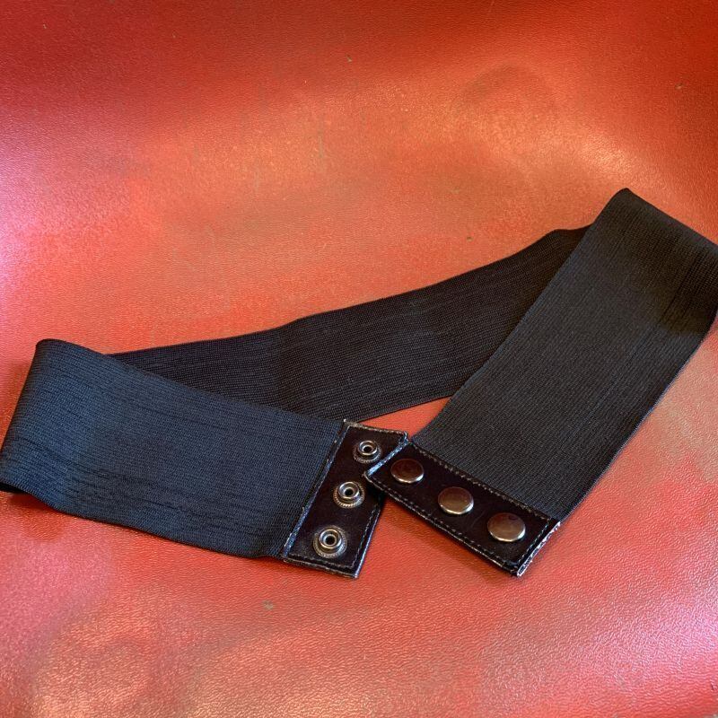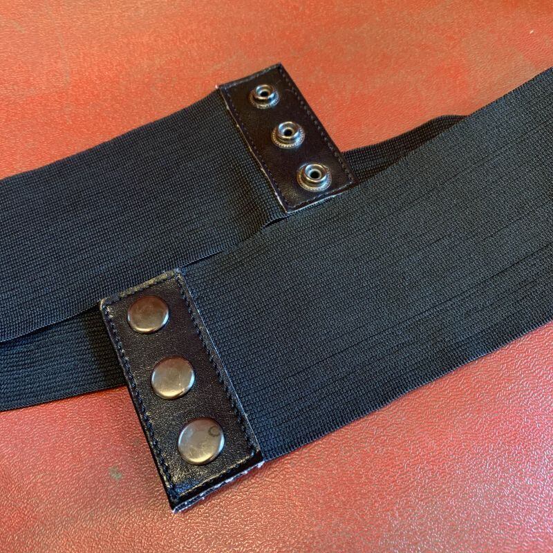 幅の広めなブラックカラーのゴムベルトにレザータイプの留め具のデザインがクールで素敵な雰囲気です。