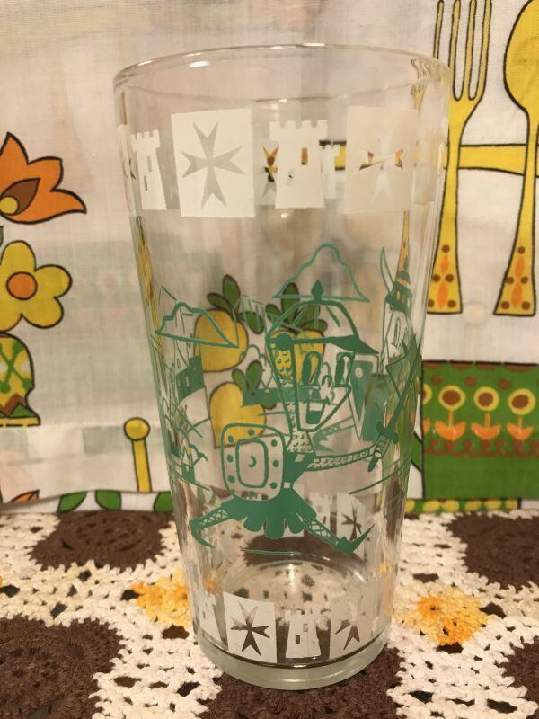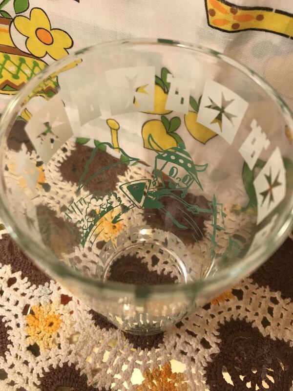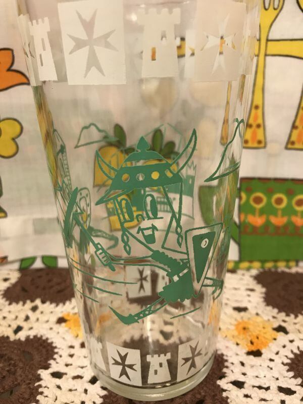 70'S USA DEADSTOCK Soldier Boy&Girl Vintage Glassです。ホワイトカラーの盾と塔の模様のラインやレトロなグリーンの男の子や女の子の兵隊さんの絵柄がとっても可愛いです。大きめなフォルムもヴィンテージならではの可愛い雰囲気です。僅かな擦れなど僅かな経年感はありますが綺麗な状態かと思います。