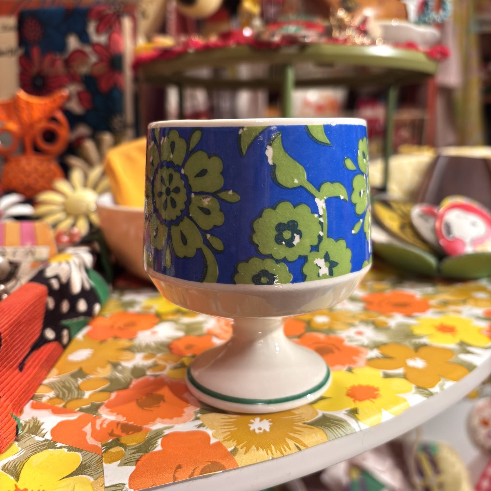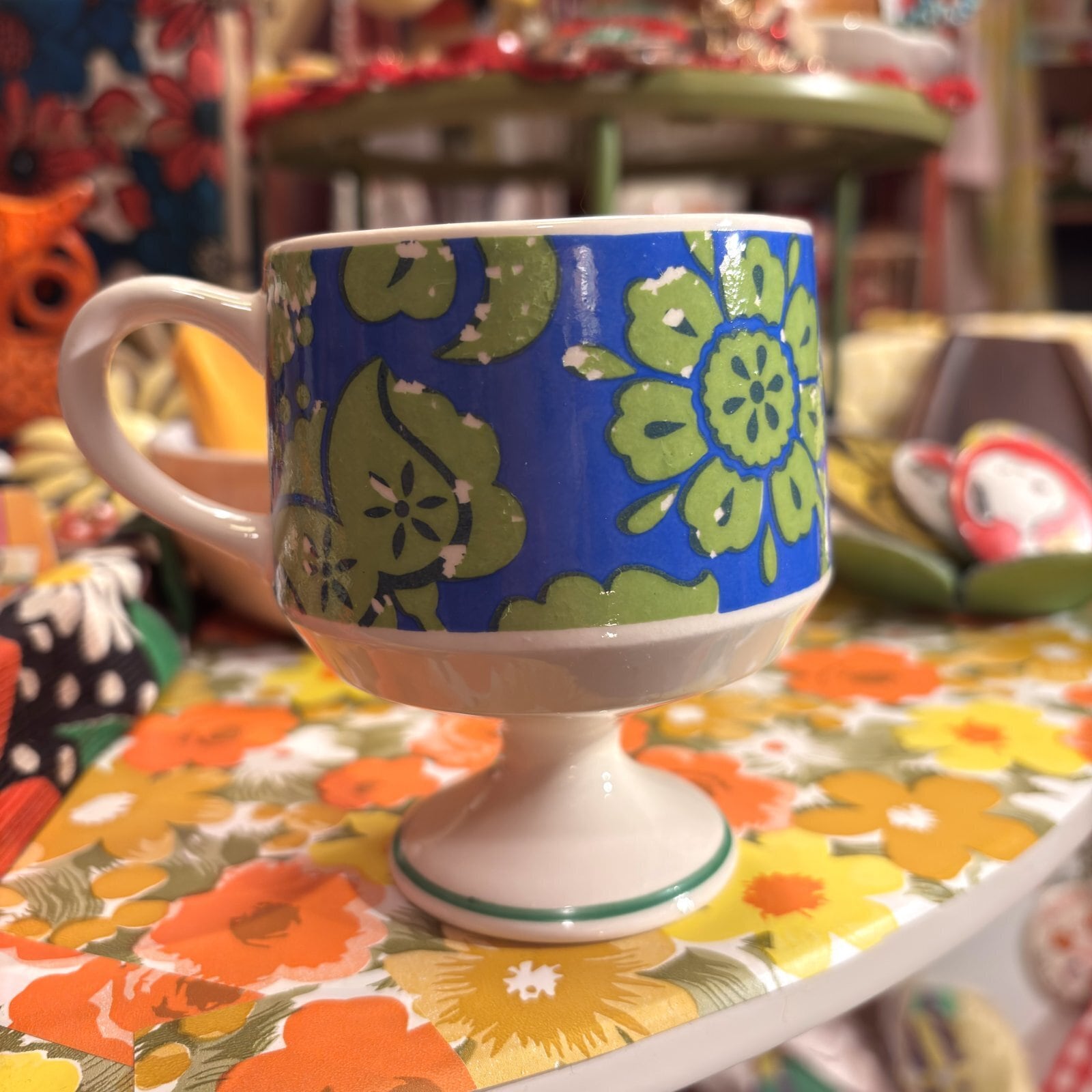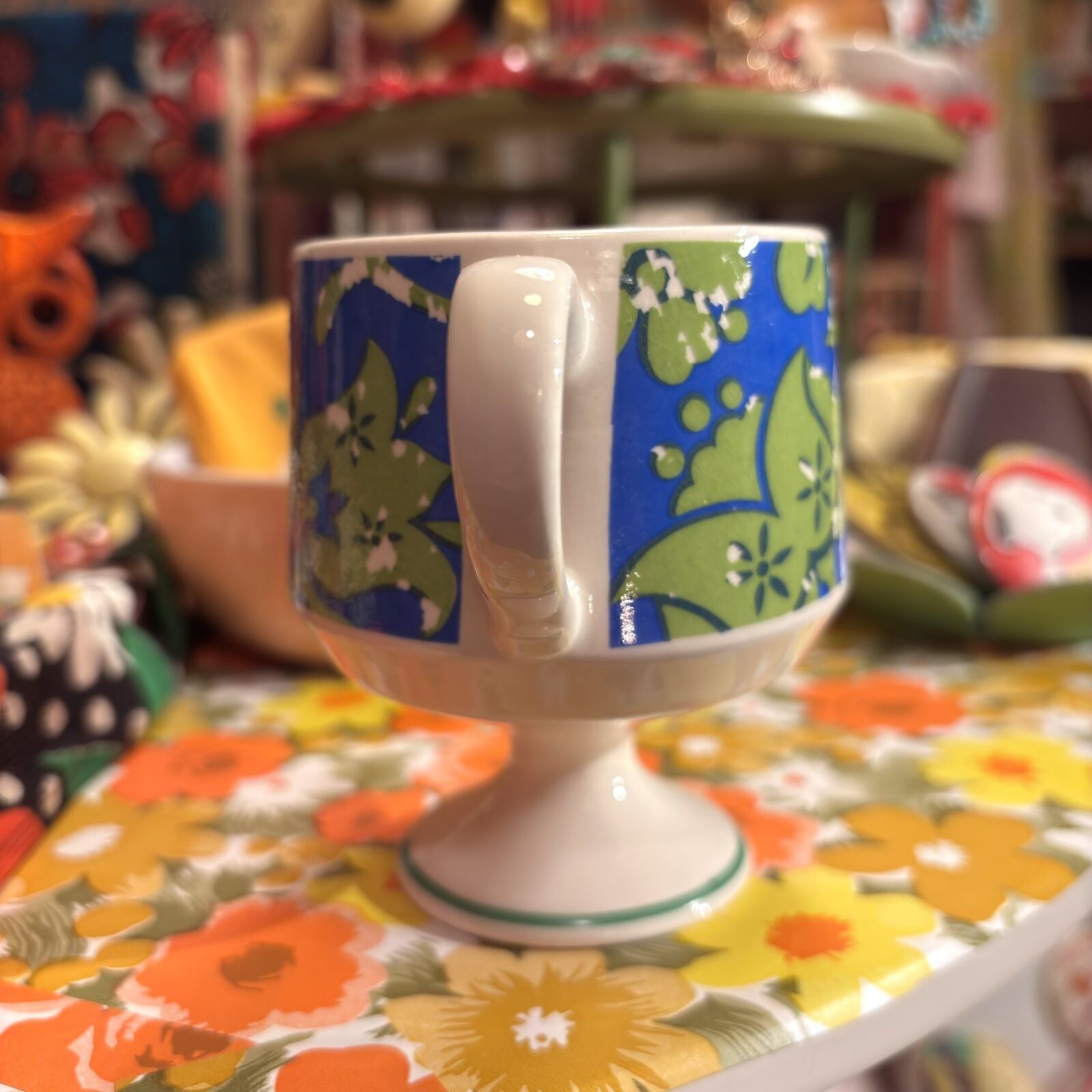 70年代 ヴィンテージ フラワープリント 脚付きマグです。