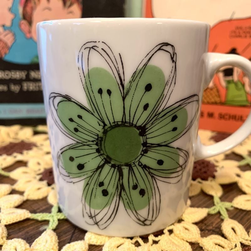 ホワイトのシンプルなフォルムに手描きのようなブラックラインのお花にグリーン、ブルーの配色がとっても可愛いです。