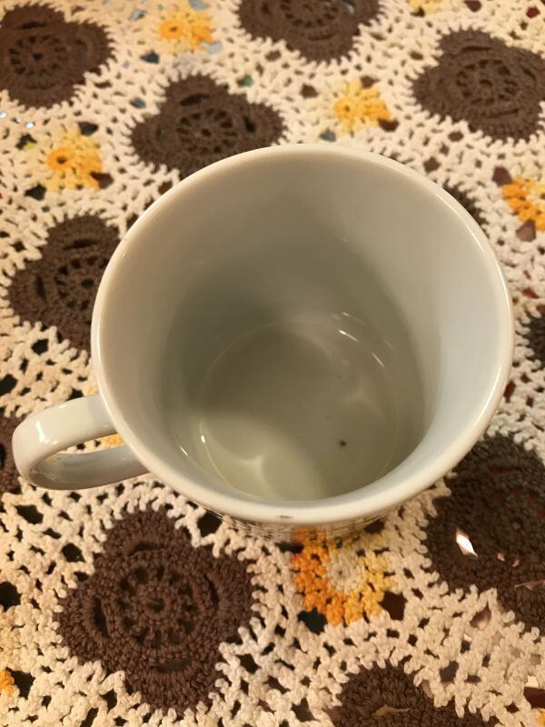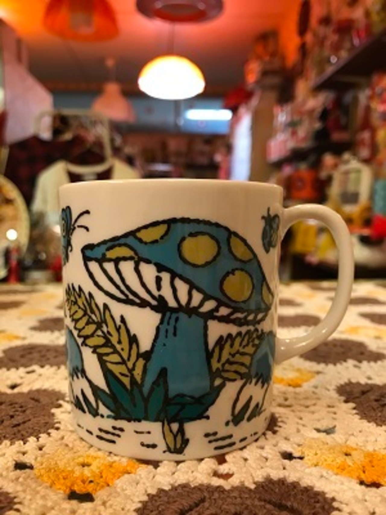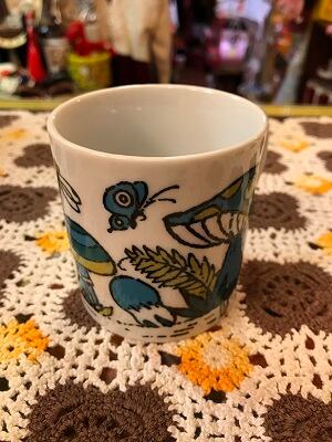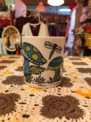 70'S アメリカ買い付け Made in Japan DEADSTOCK BL/GR ドット柄Mushroom Mugです。ブルー、グリーンのレトロなカラーリングやドット柄のキノコ、トンボやチョウチョの絵柄がとっても可愛いです。内側の底面に製造時にできたと思われる点のようなぽこっとした箇所があります。