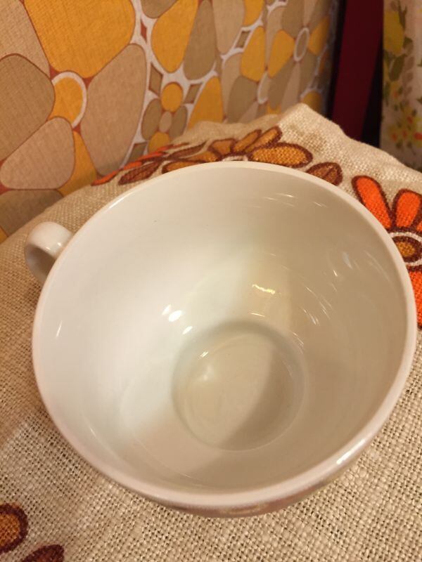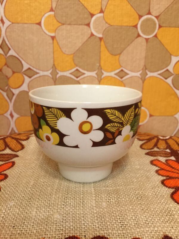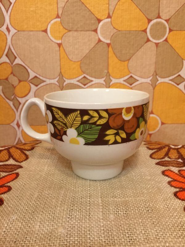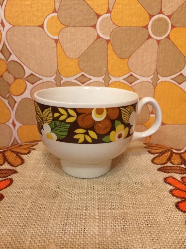 70'S USA BR FLOWER マグカップです。そこがすっとしぼまった形や、ブラウン イエロー ホワイトのフラワー柄がレトロで可愛いです。普段遣いはもちろんディスプレイとしてお使い頂いても可愛いですね。僅かな経年感はありますが気になるようなダメージはありません。