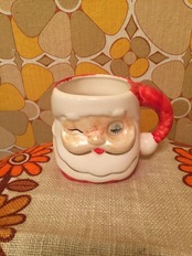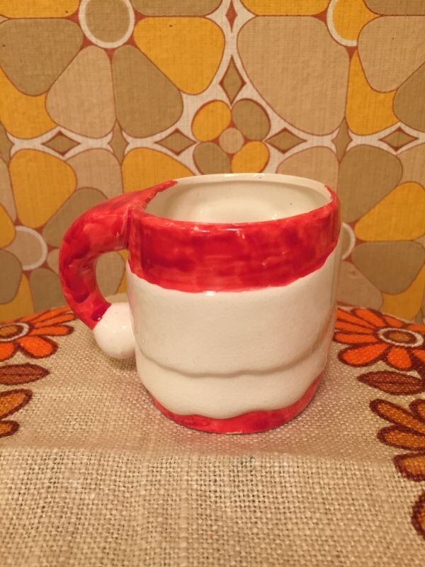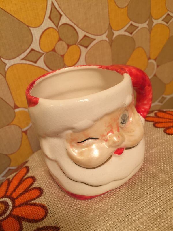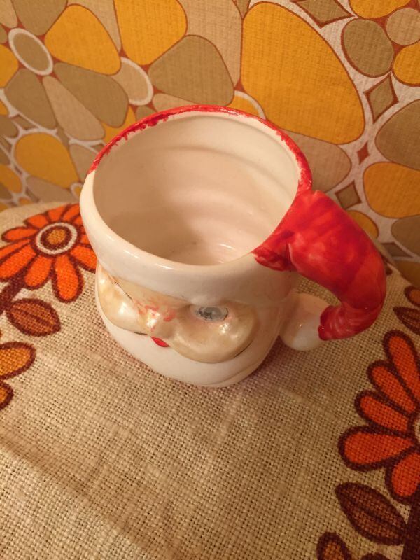 70'S USA DEADSTOCK 未使用 片目がホログラムのサンタさんMugです。ぷっくり優しい雰囲気のサンタさんにニコッとしたりウィンクするホログラムの瞳が可愛いです。ハンドペイントの風合もレトロで可愛いですね。若干の擦れ、シミがありますが欠けなどの大きなダメージはありません。