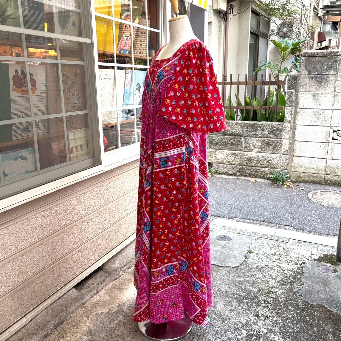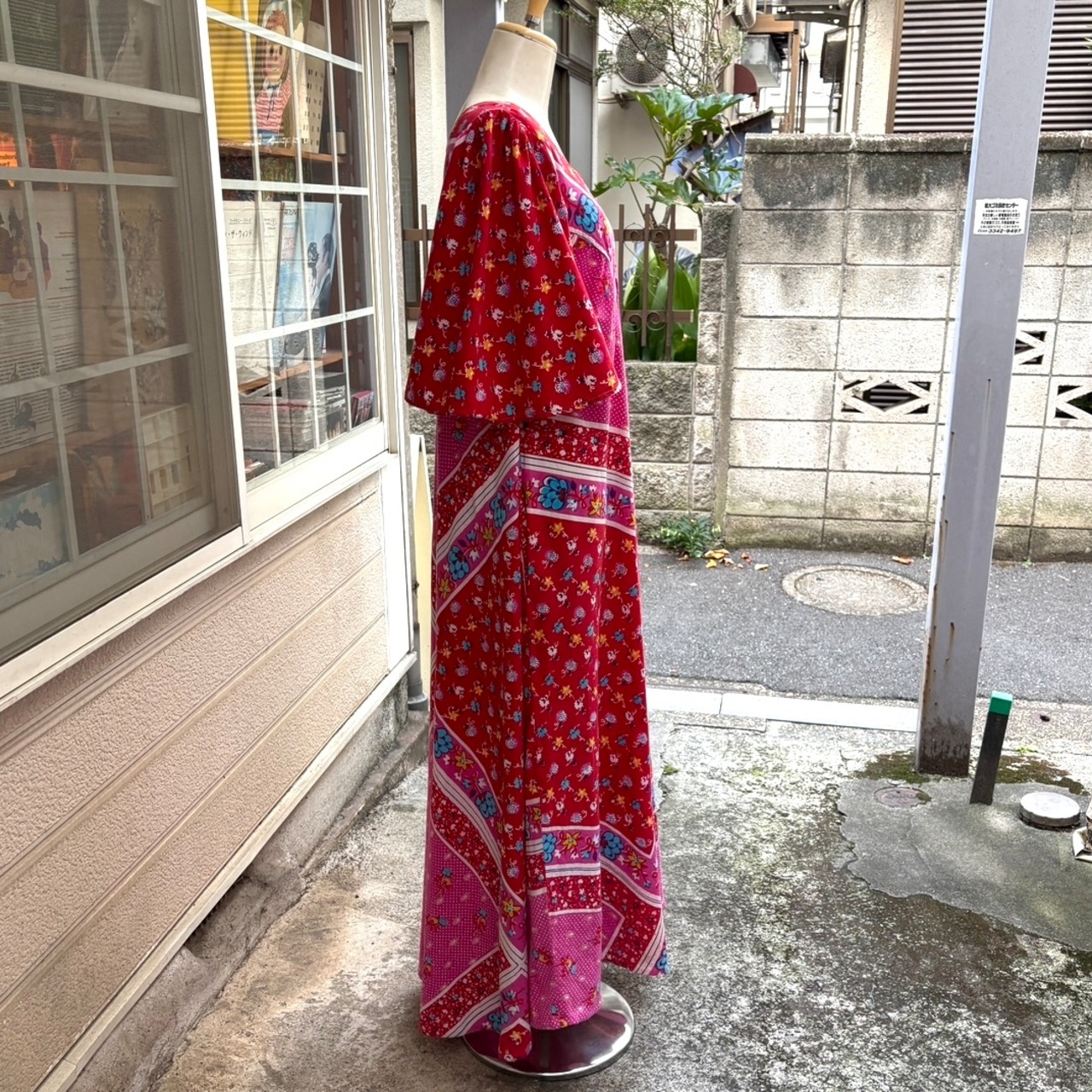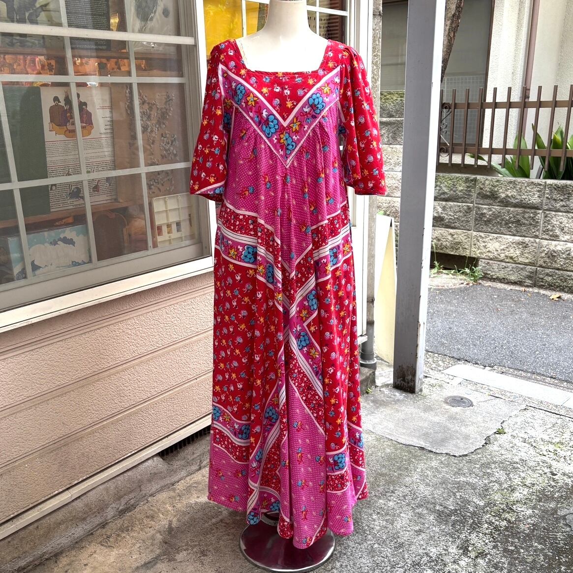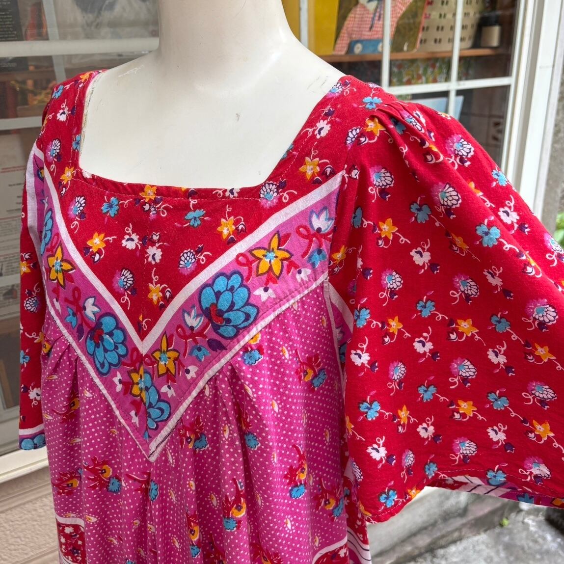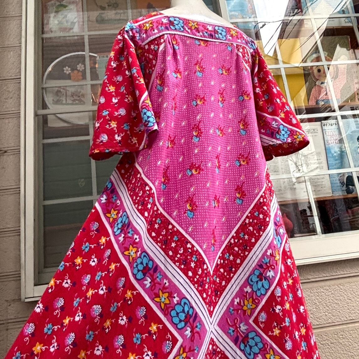 70年代 ヴィンテージ インド綿 ベルスリーブ ハンカチーフパターン ドレスです。