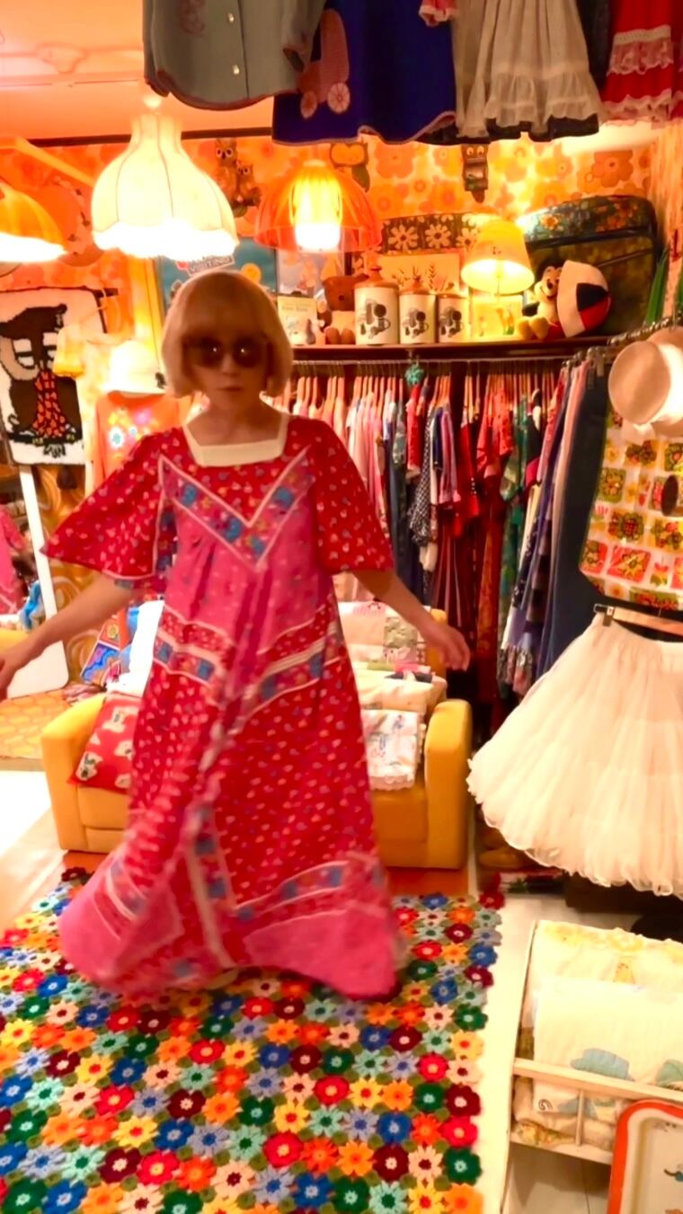 レッド、ピンクベースにライトブルー、イエロー、ホワイトのカラフルなカラーリングや手描きタッチのフラワー柄やピンドットがとっても可愛い1着です。