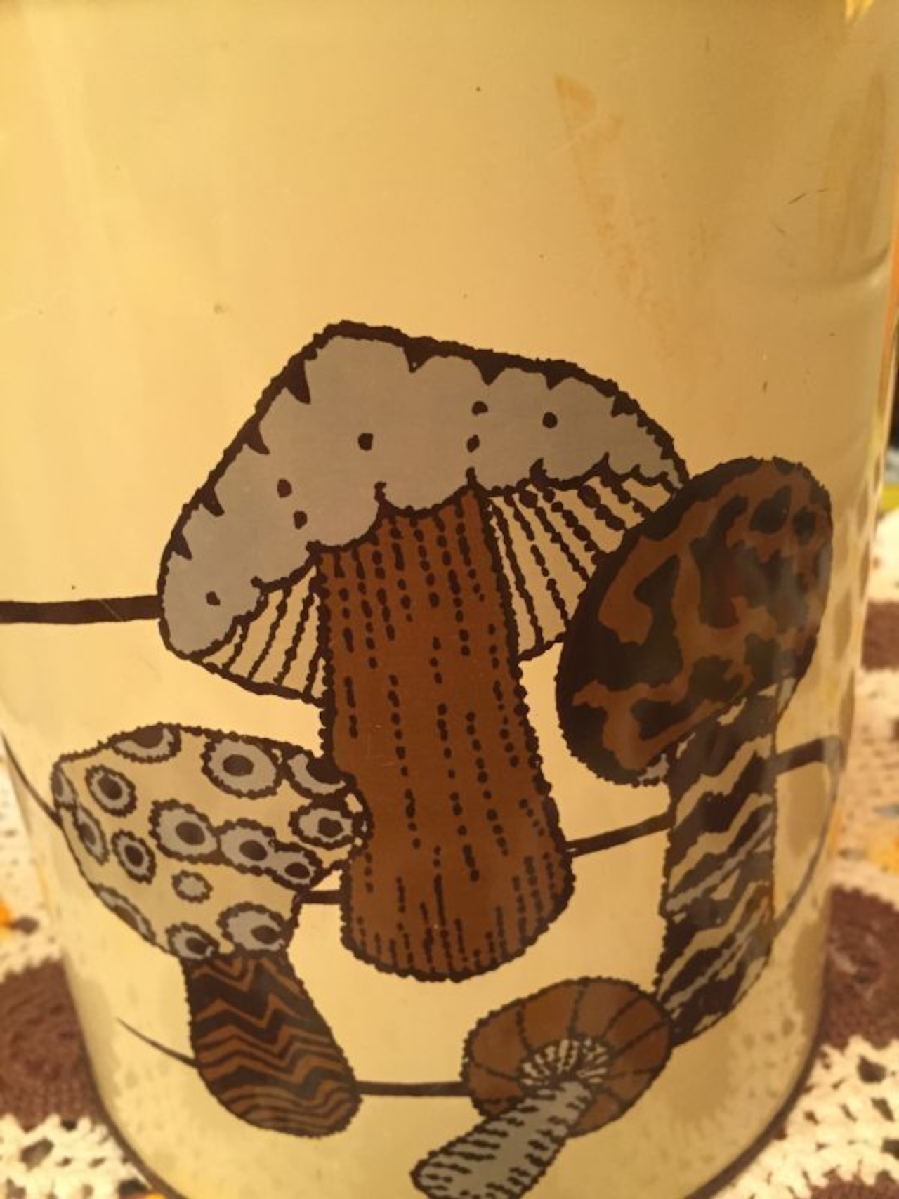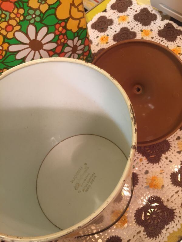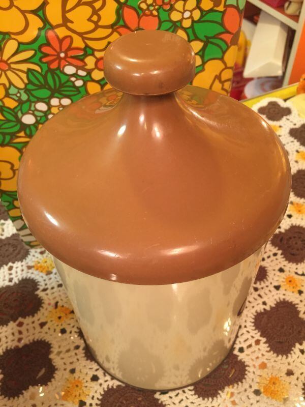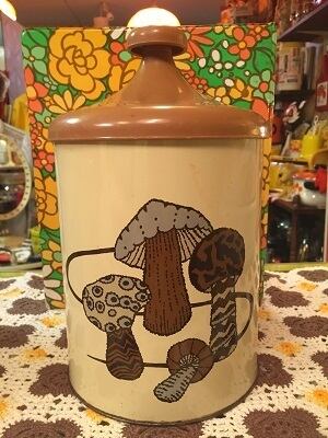 70'S USA Mushroom Tin キャニスターです。キャラメルカラーの三角屋根のような蓋や、ブラウン・ベージュ・グレーのシュールなキノコ柄がとっても可愛いです。ディスプレイ兼収納として置くだけで70年代の素敵な雰囲気が広がりそうですね。経年による若干の錆び、擦れ、シミ、僅かなへこみがありますが気になるような大きなダメージはありません。