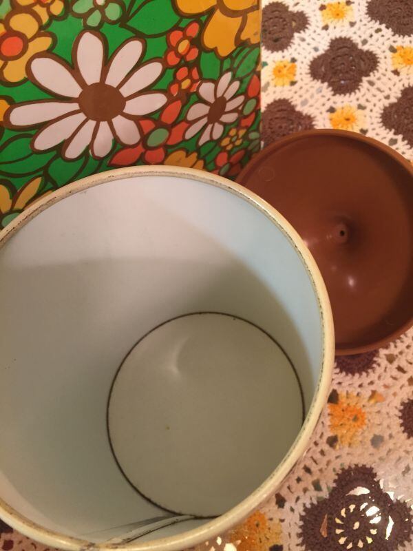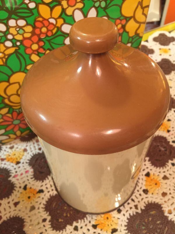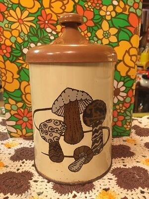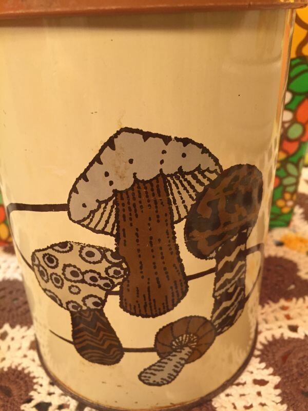 70'S USA Mushroom Tin キャニスターです。キャラメルカラーの三角屋根のような蓋や、ブラウン・ベージュ・グレーのシュールなキノコ柄がとっても可愛いです。ディスプレイ兼収納として置くだけで70年代の素敵な雰囲気が広がりそうですね。経年による若干の錆び、擦れ、シミ、僅かなへこみがありますが気になるような大きなダメージはありません。