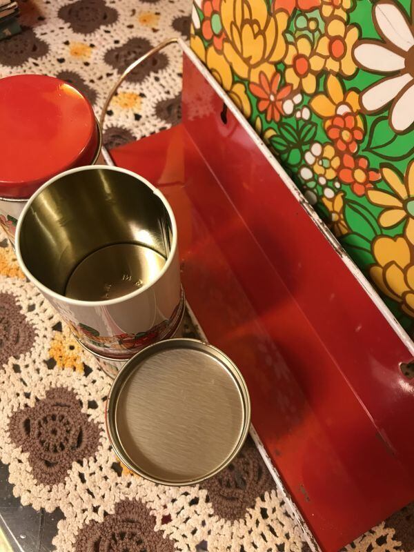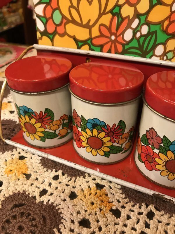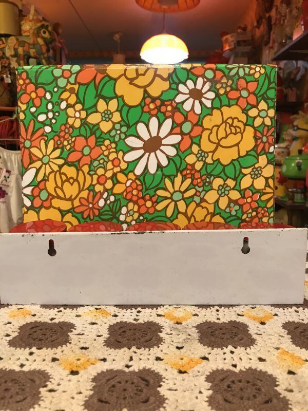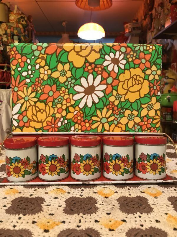 70'S Made in BRAZIL USA買い付け VINTAGE WallShelf FlowerTin缶SETです。ホワイト、レッド、ゴールドのアームのTin製シェルフにレトロなFlower柄が可愛いTin缶が5個セットになっています。壁に掛けてご使用頂いたり、棚の上に置いてご使用頂いたり、収納兼ディスプレイとしていろいろ活躍してくれそうですね。経年によるシミ、擦れ、色褪せなど経年感は見られますがヴィンテージならではの雰囲気がとっても可愛いです。